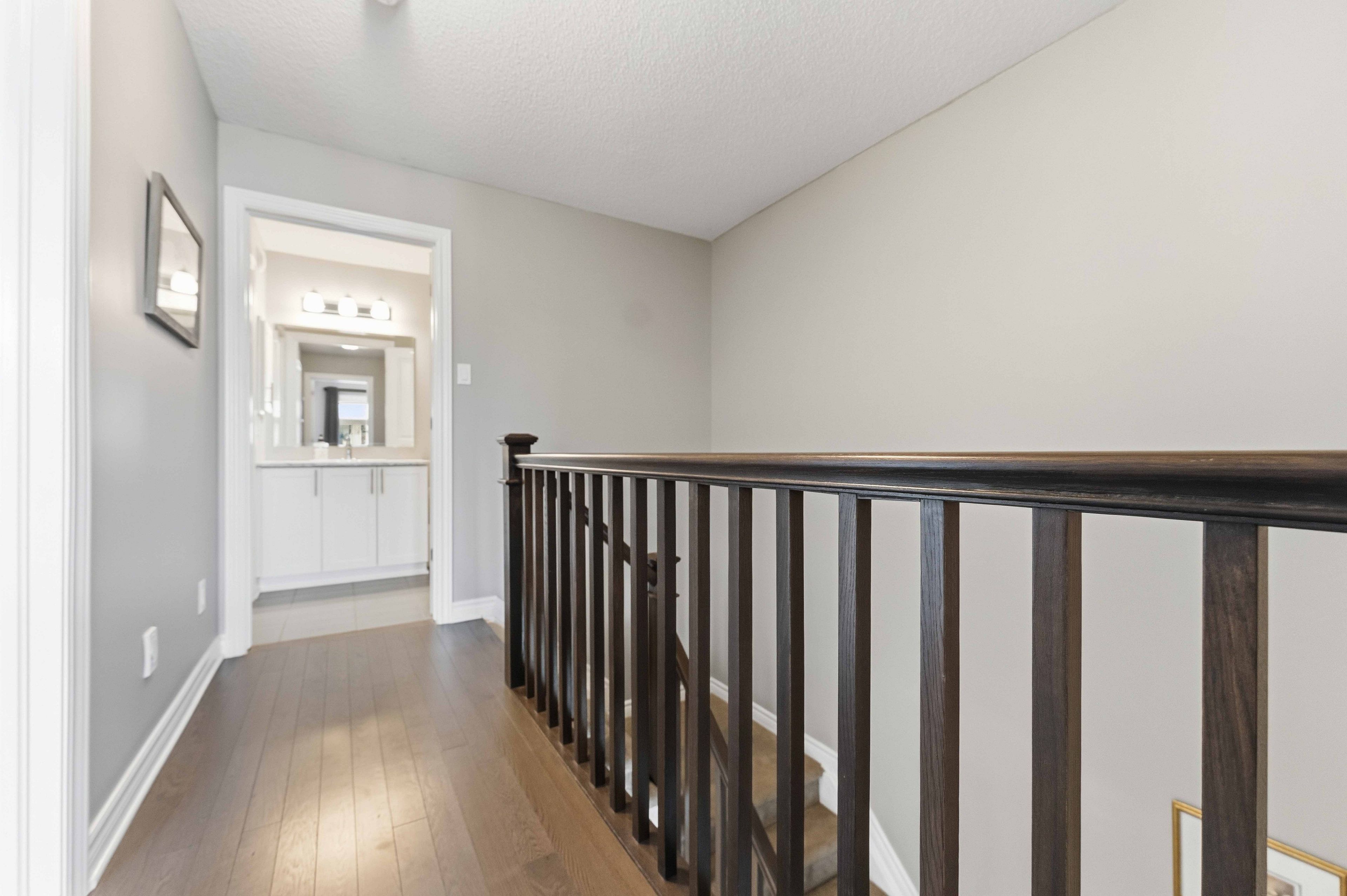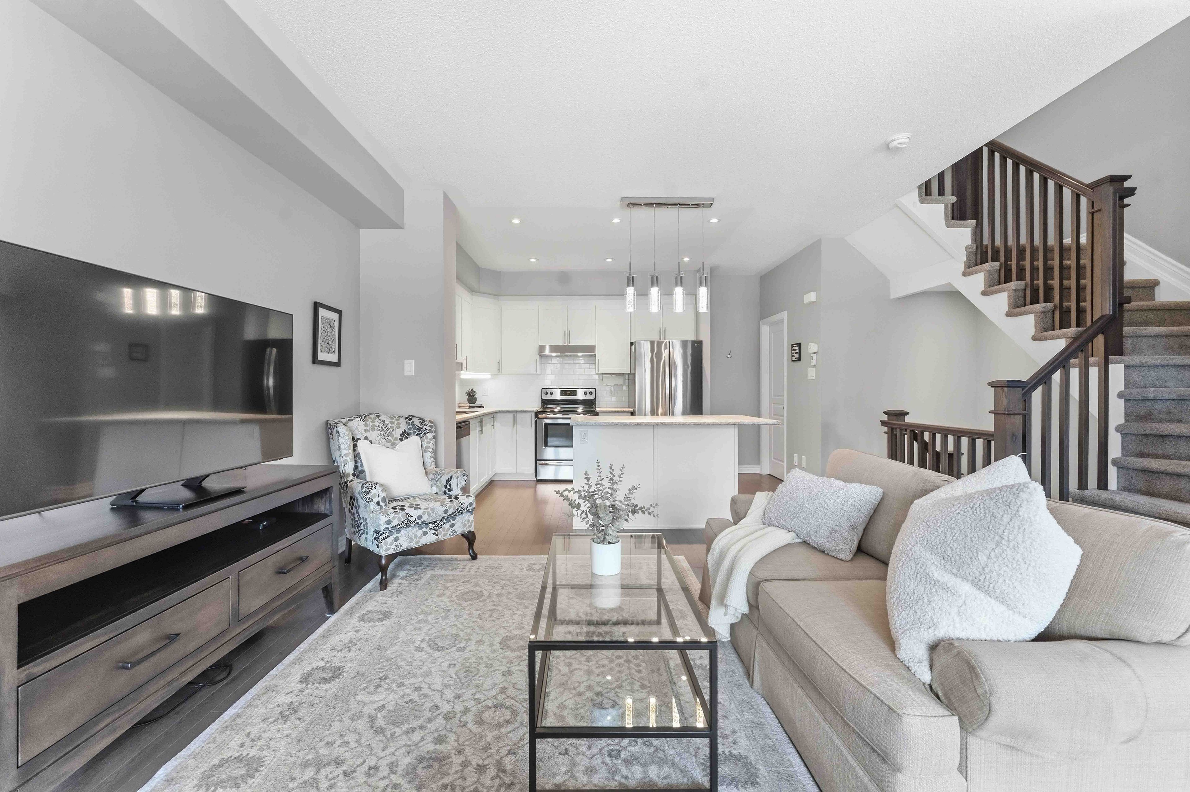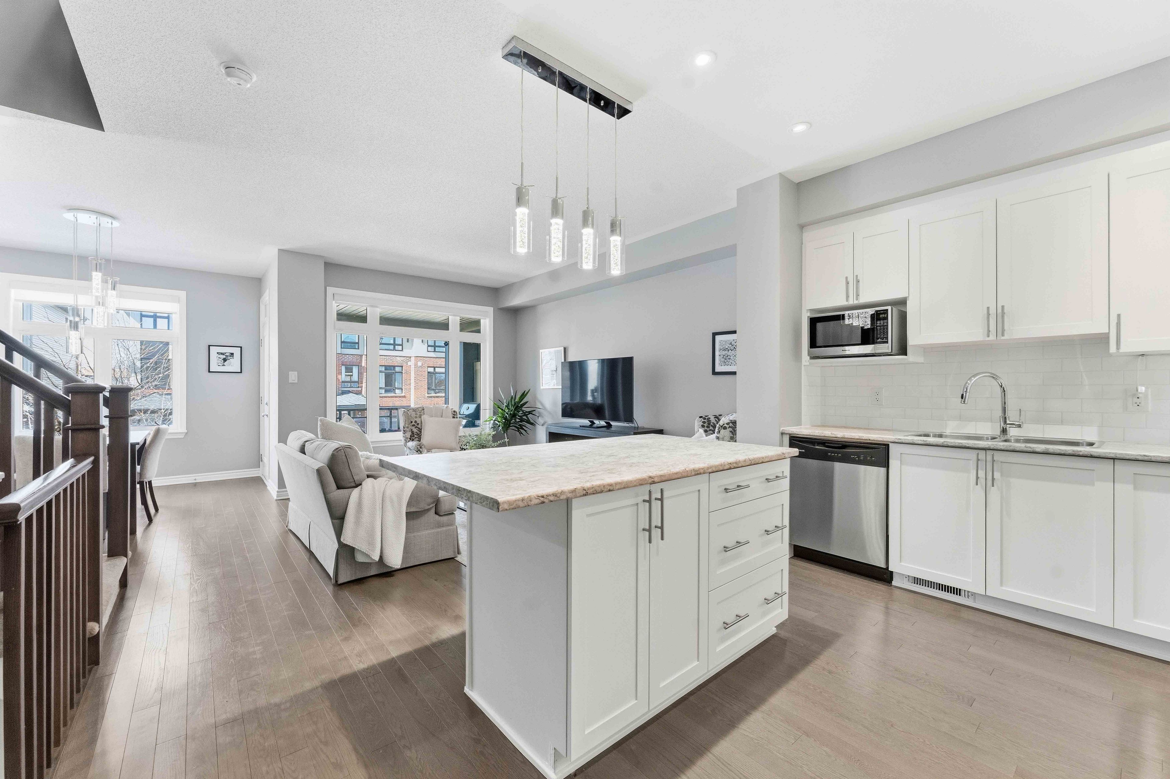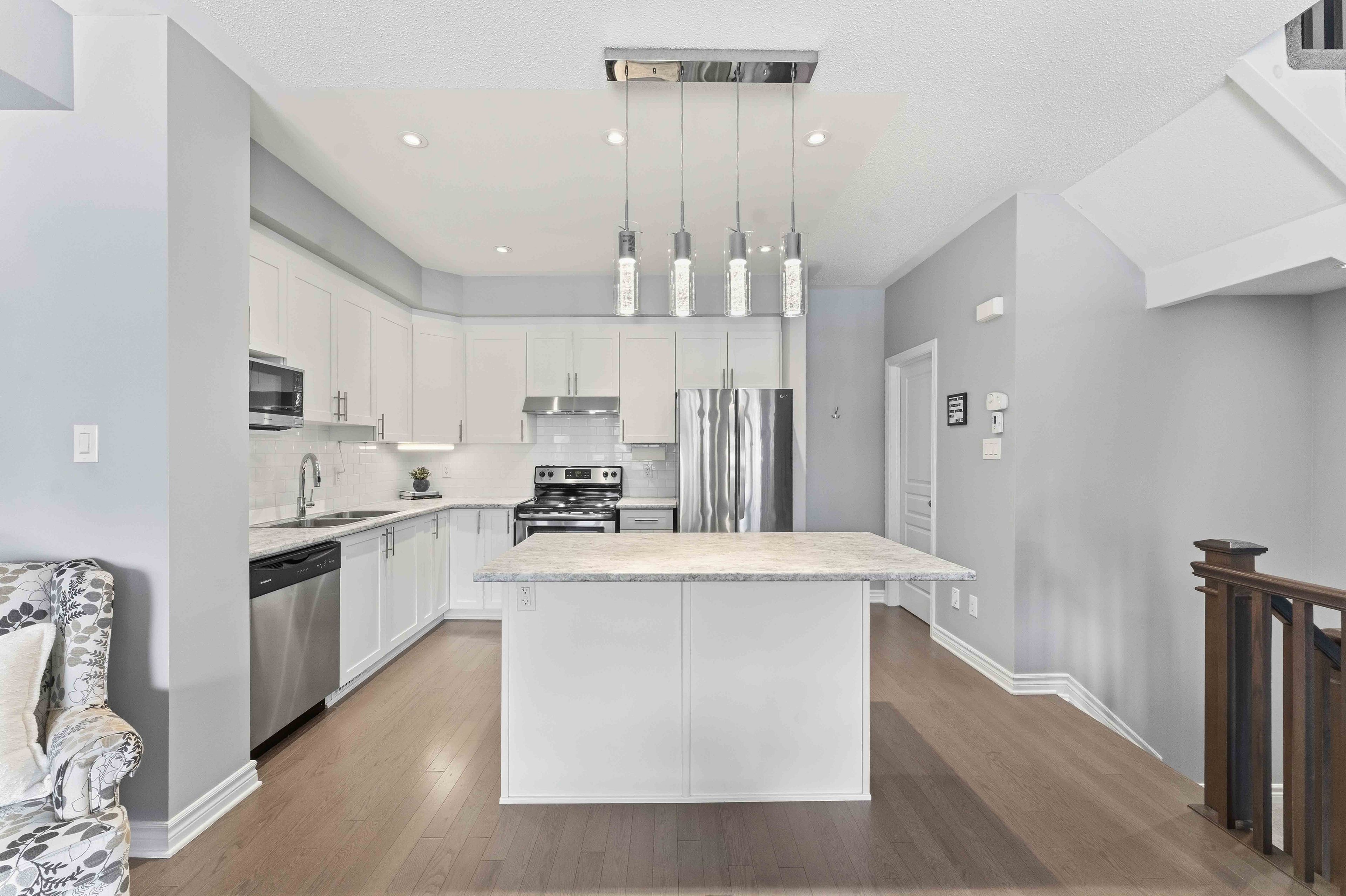 Open house thursday 5-7 and sunday 2-4! Welcome to this stunning richcraft end unit townhome, offering modern style, functional living & exceptional natural light throughout. The main level features a versatile den with hardwood flooring, perfect for a home office, gym, or flex space. The bright, open concept second level is designed for both everyday living and entertaining, highlighted by pot lights & beautiful hardwood floors. The contemporary kitchen boasts crisp white cabinetry, a spacious island with seating, and seamless flow into the dining and living areas. Step out onto your private balcony, ideal for morning coffee or evening relaxation. Upstairs, the third level continues with hardwood flooring and offers a generous primary bedroom complete with a walk-in closet and a private ensuite featuring a glass shower. One additional well-sized bedroom, a full main bathroom, and convenient third-floor laundry complete this level. The lower level provides ample storage space, while the extra long garage with built-in shelving adds practical functionality. The widened driveway with interlock allows for additional parking - a rare and valuable feature. Located in a highly desirable, transit-friendly community close to schools, shopping, restaurants, and recreation, this home offers the perfect blend of comfort, style, and convenience.