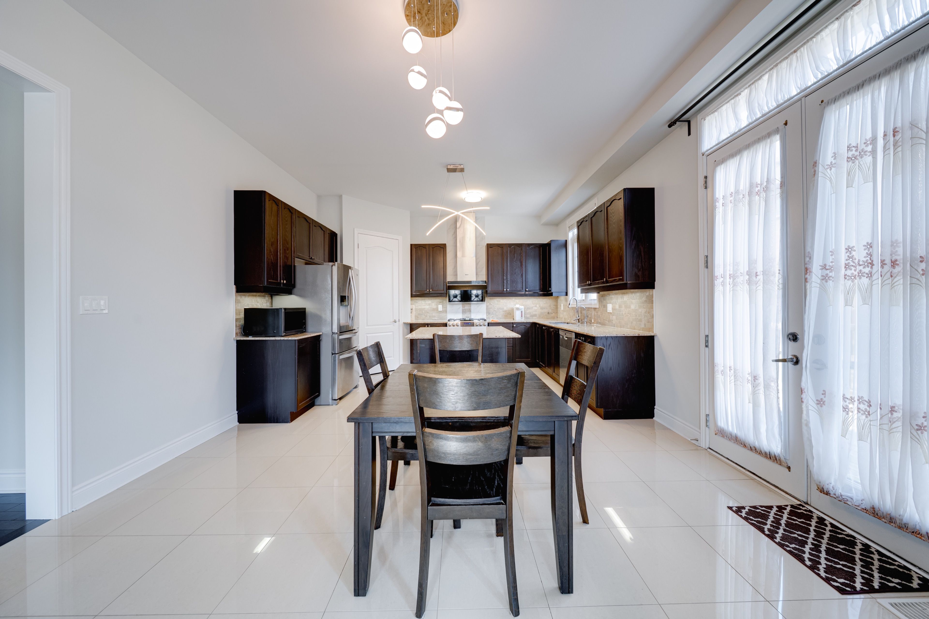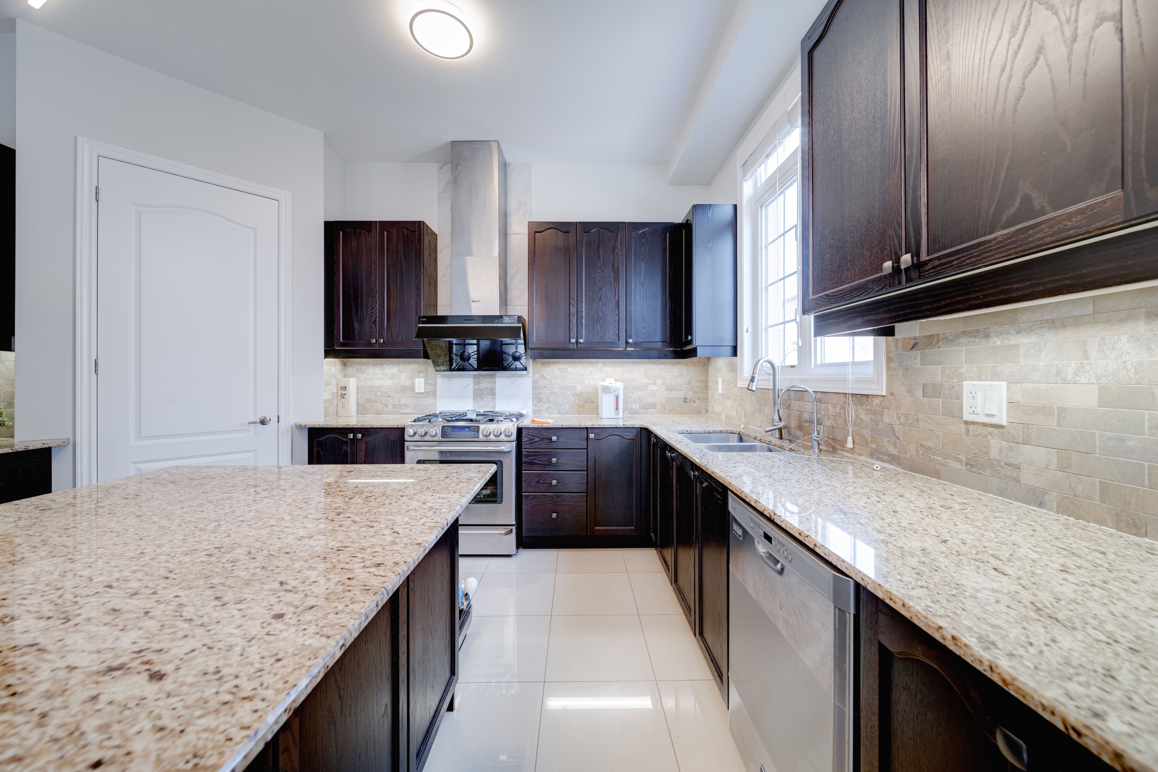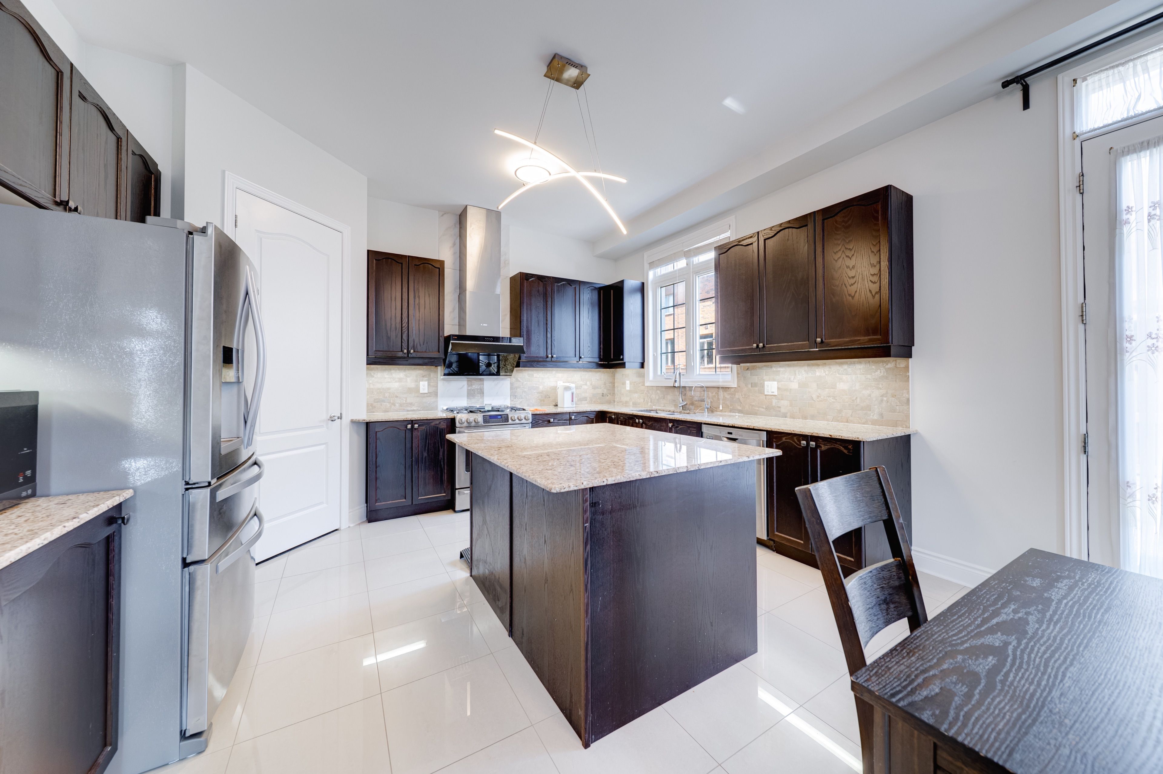 • Spacious kitchen with stainless steel appliances and a large island.