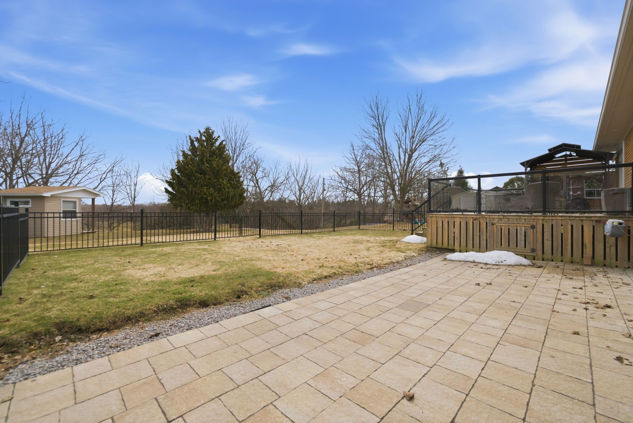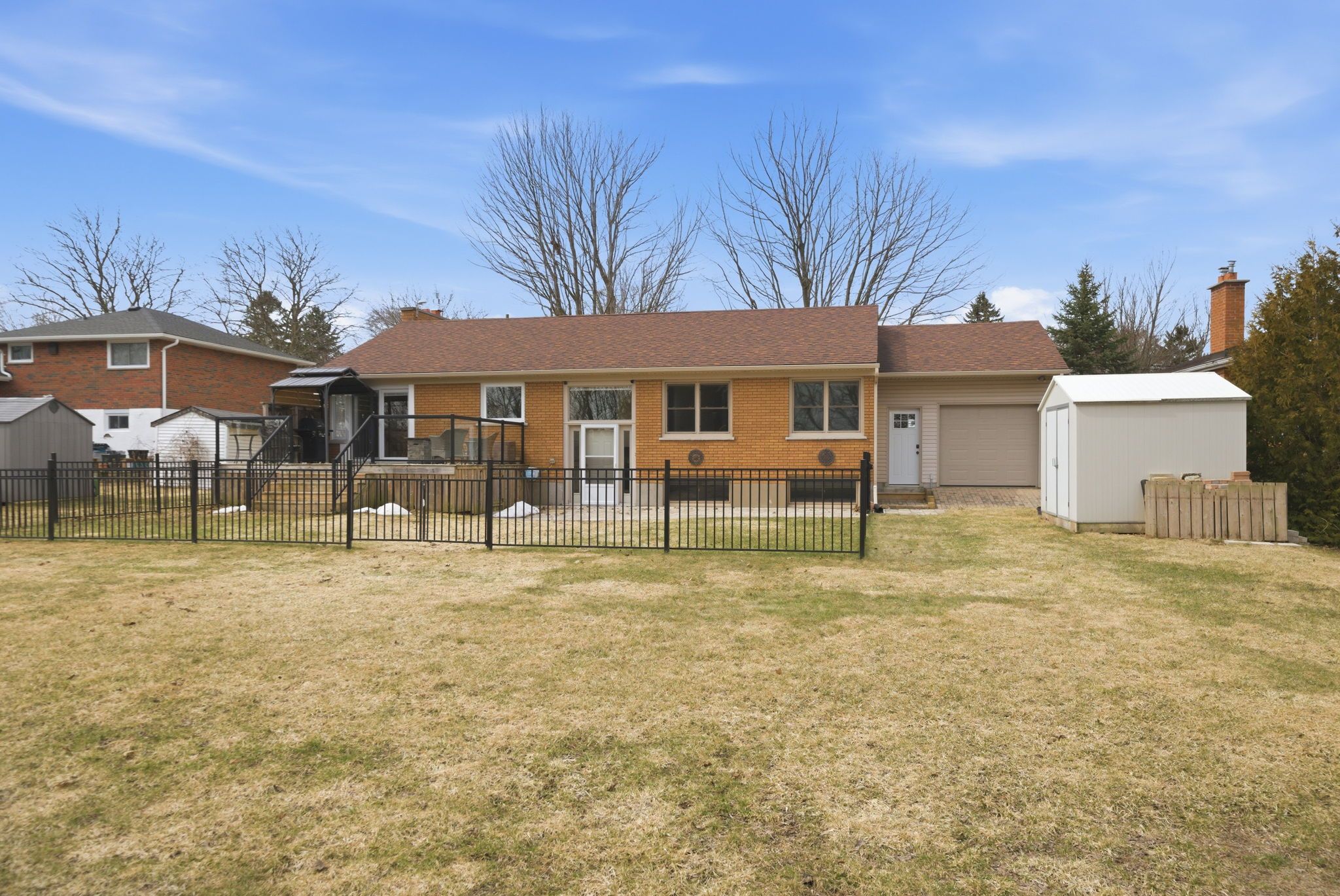 • Backyard oasis with grilling space, fenced area, and dedicated hobby shed.