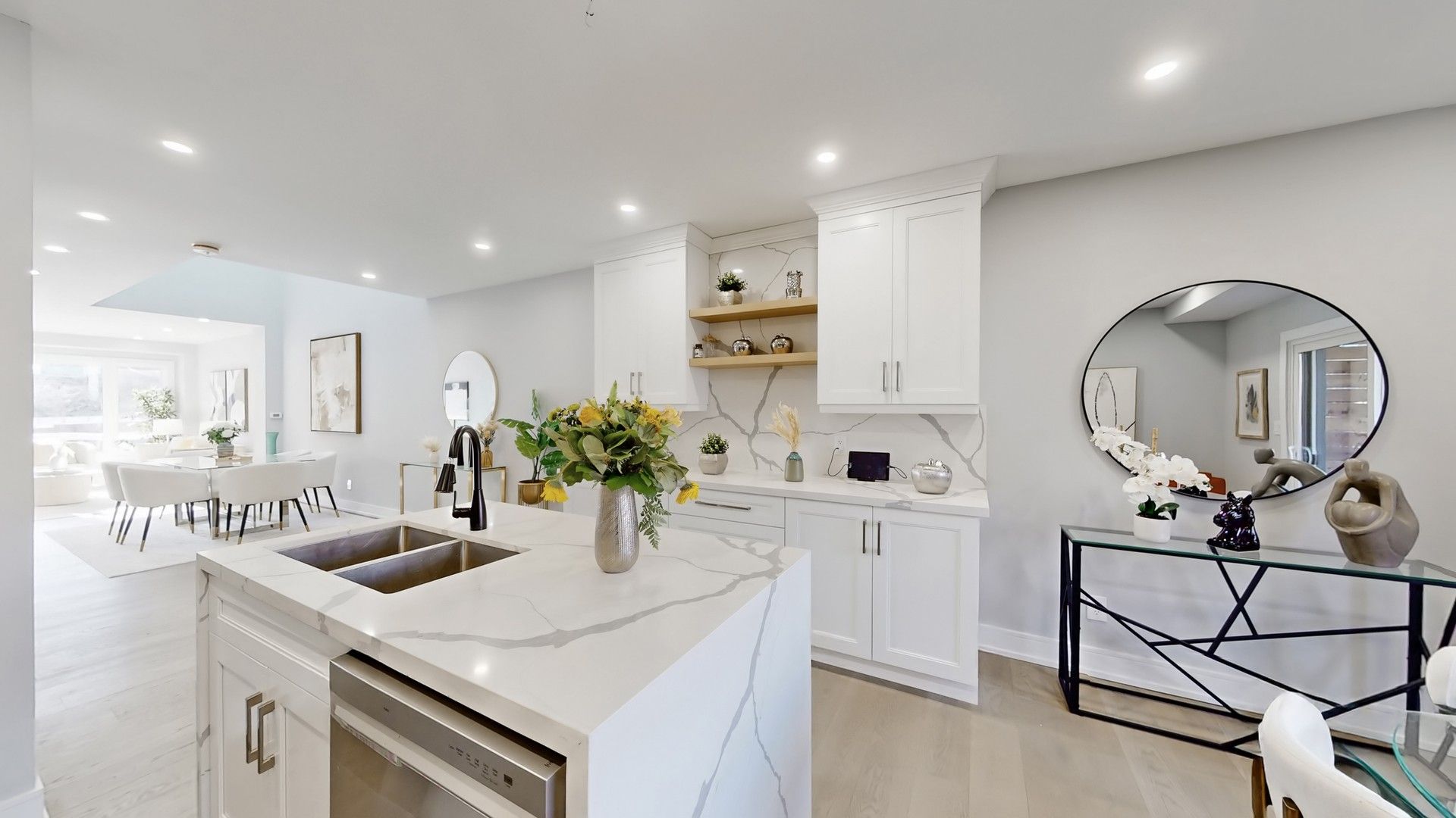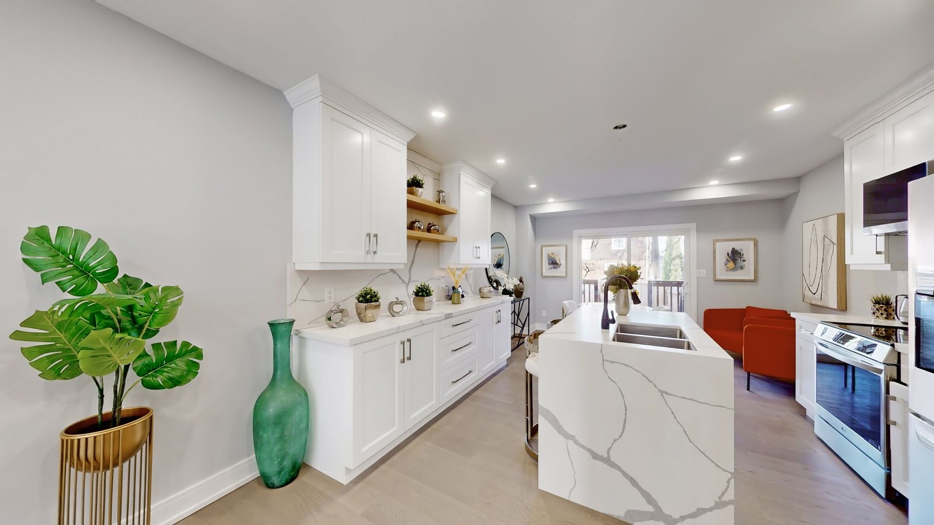 • Stylish kitchen featuring quartz countertops and a striking waterfall island.