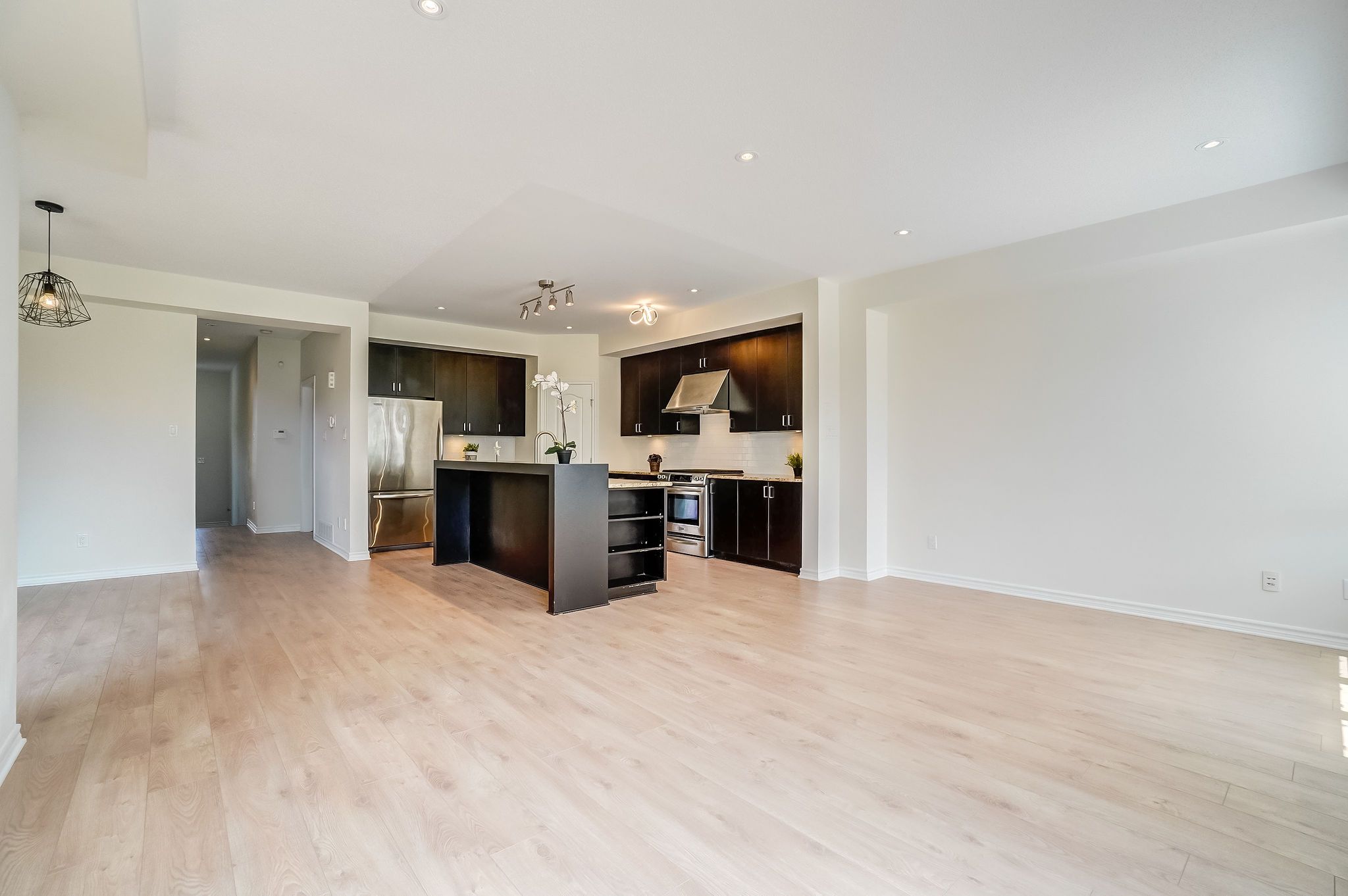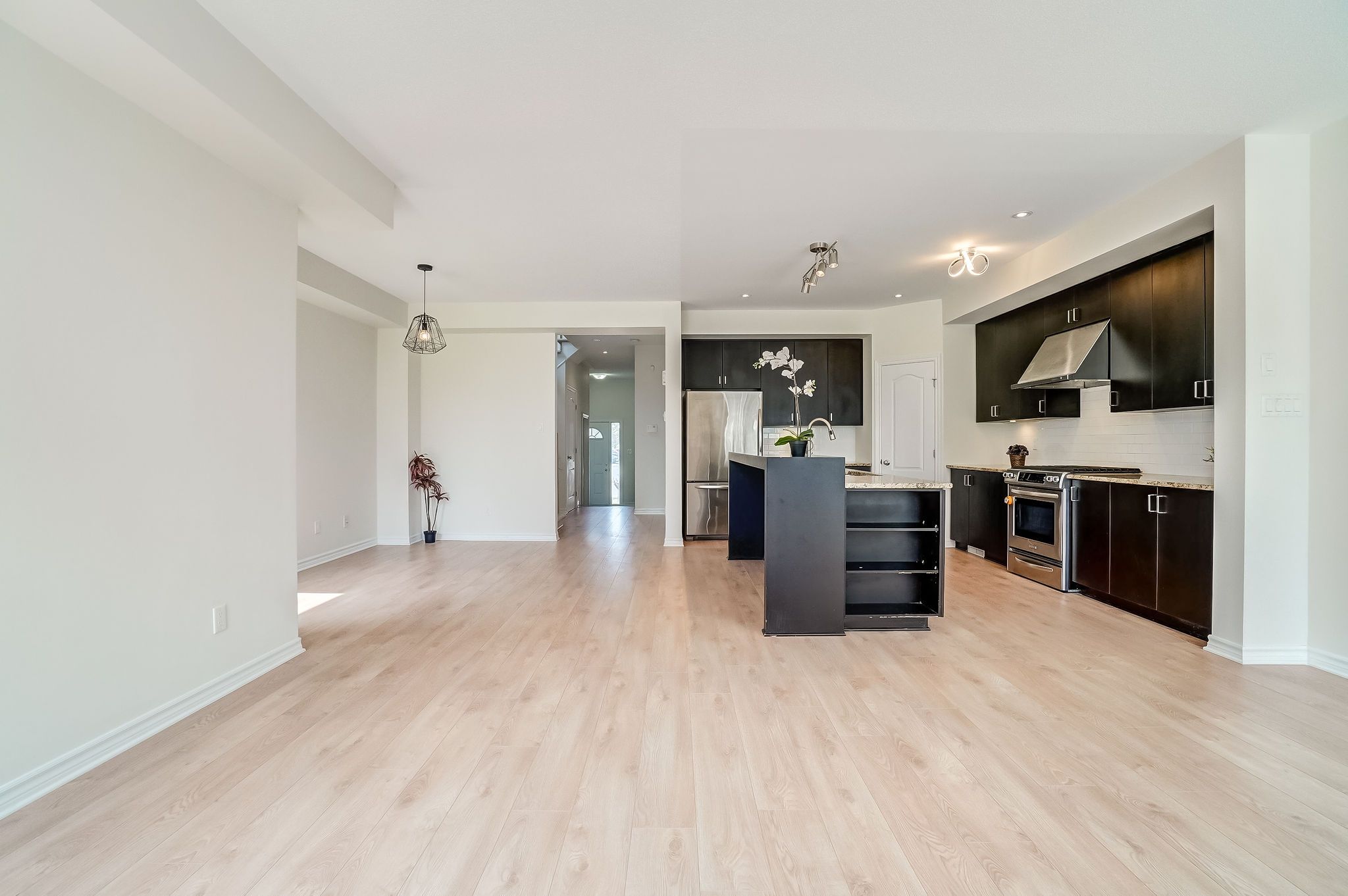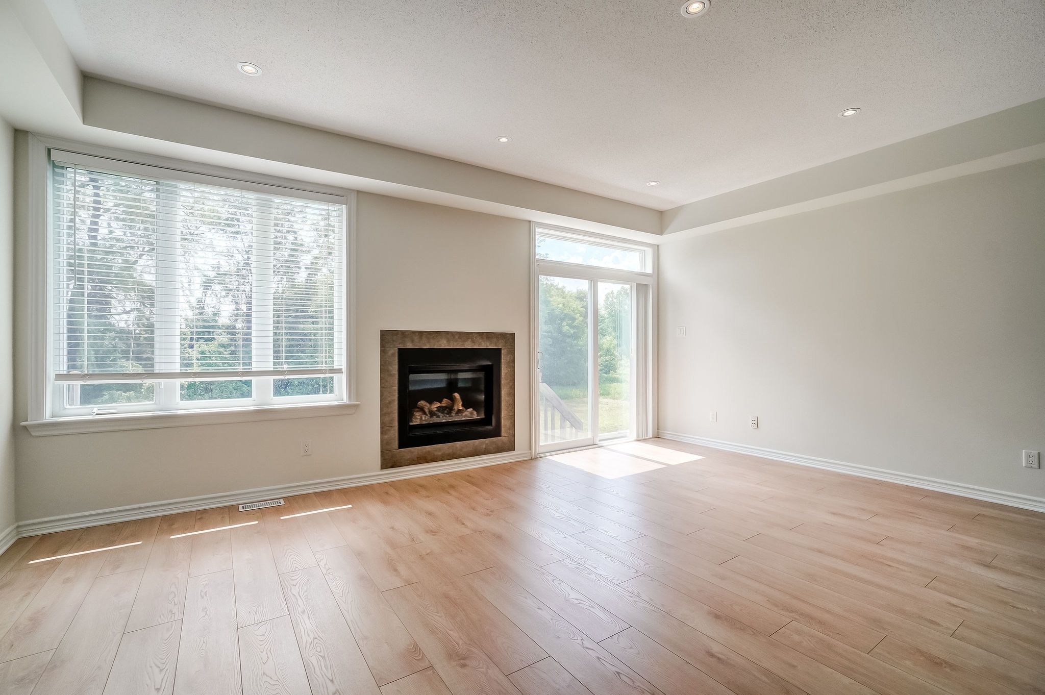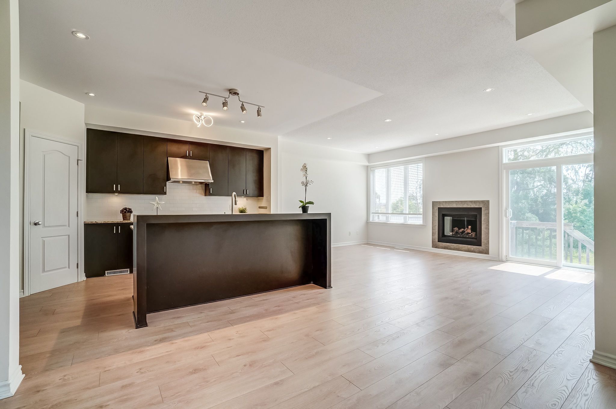 • Open-concept great room features a cozy fireplace and 9ft ceilings.