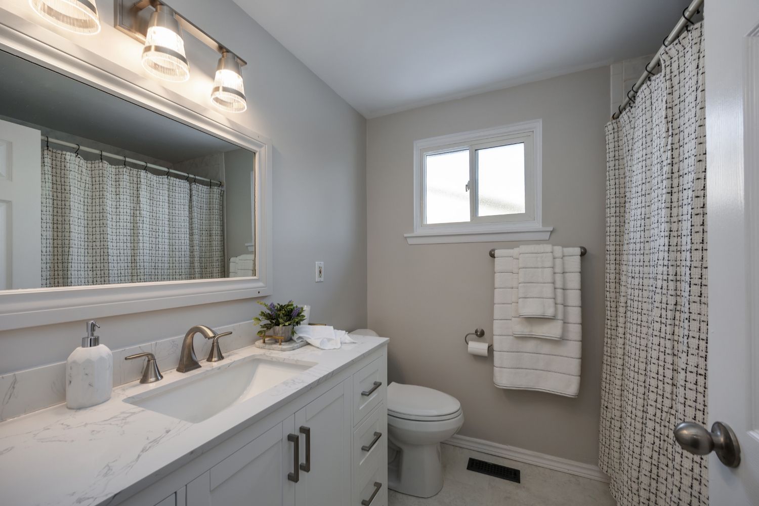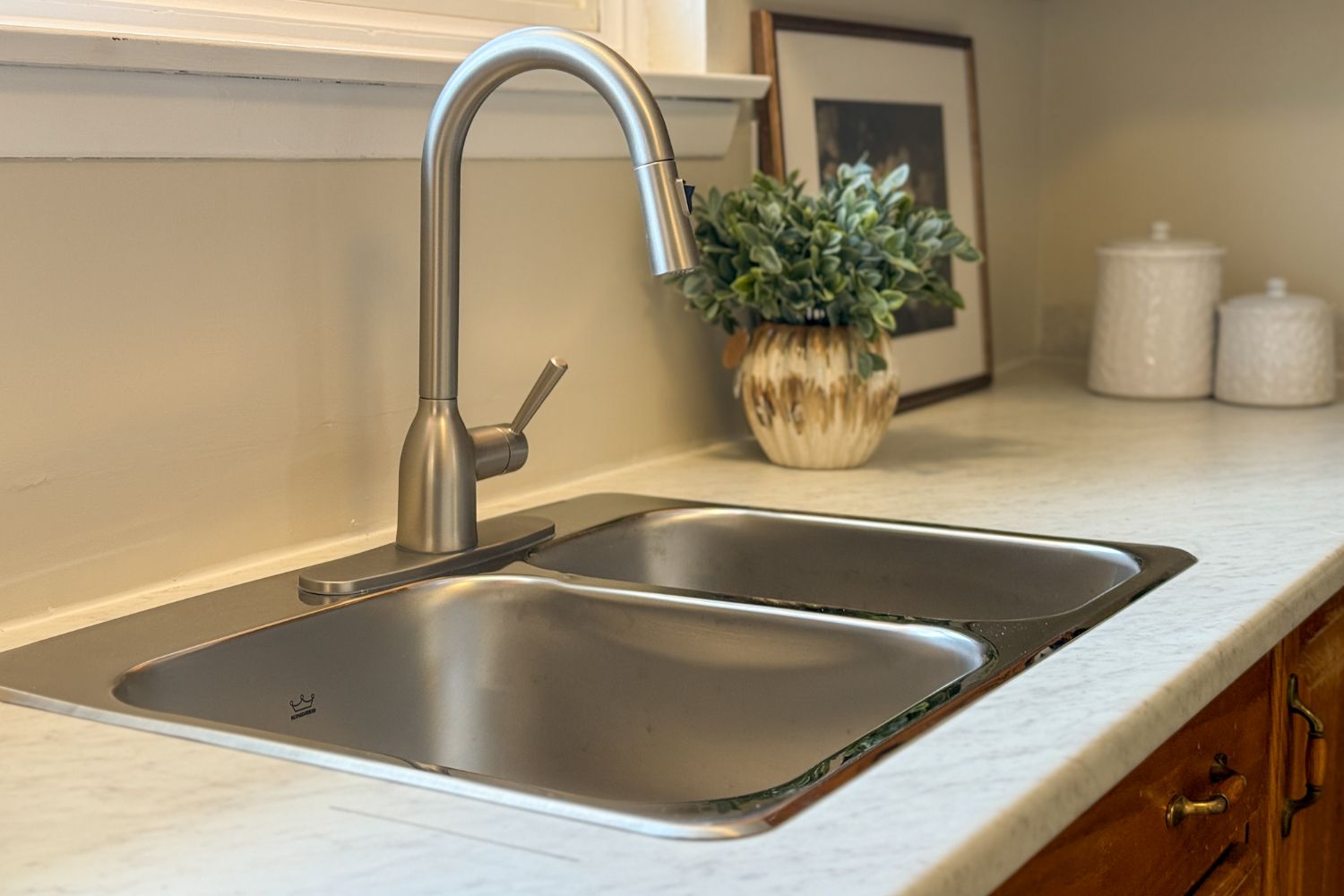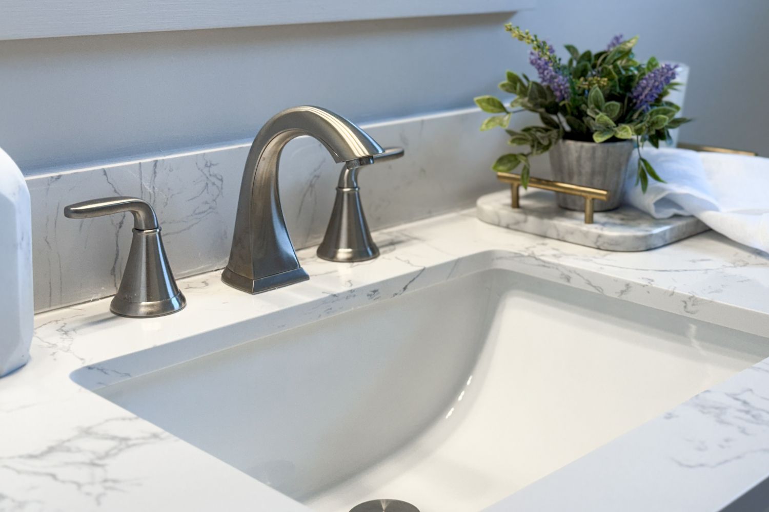 • Updated bathroom with modern vanity, faucet, and clean design.
