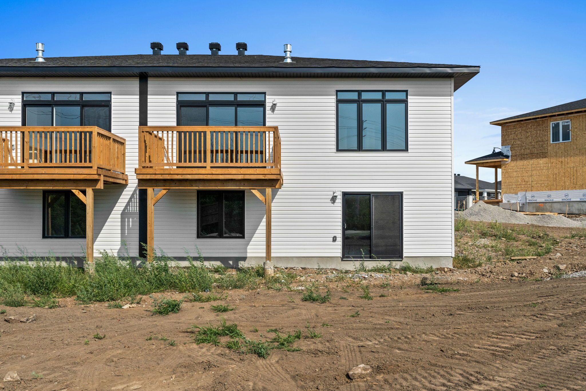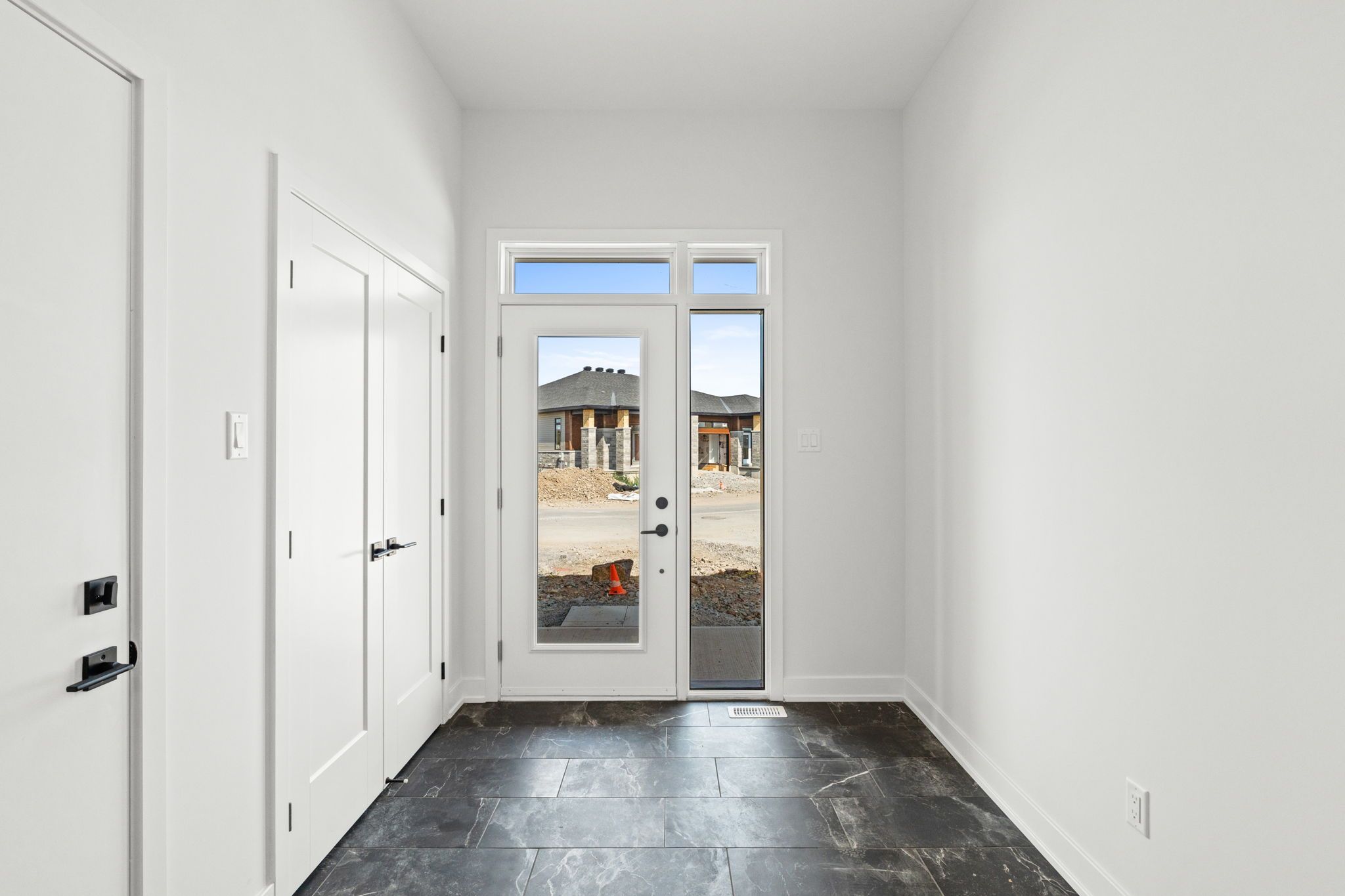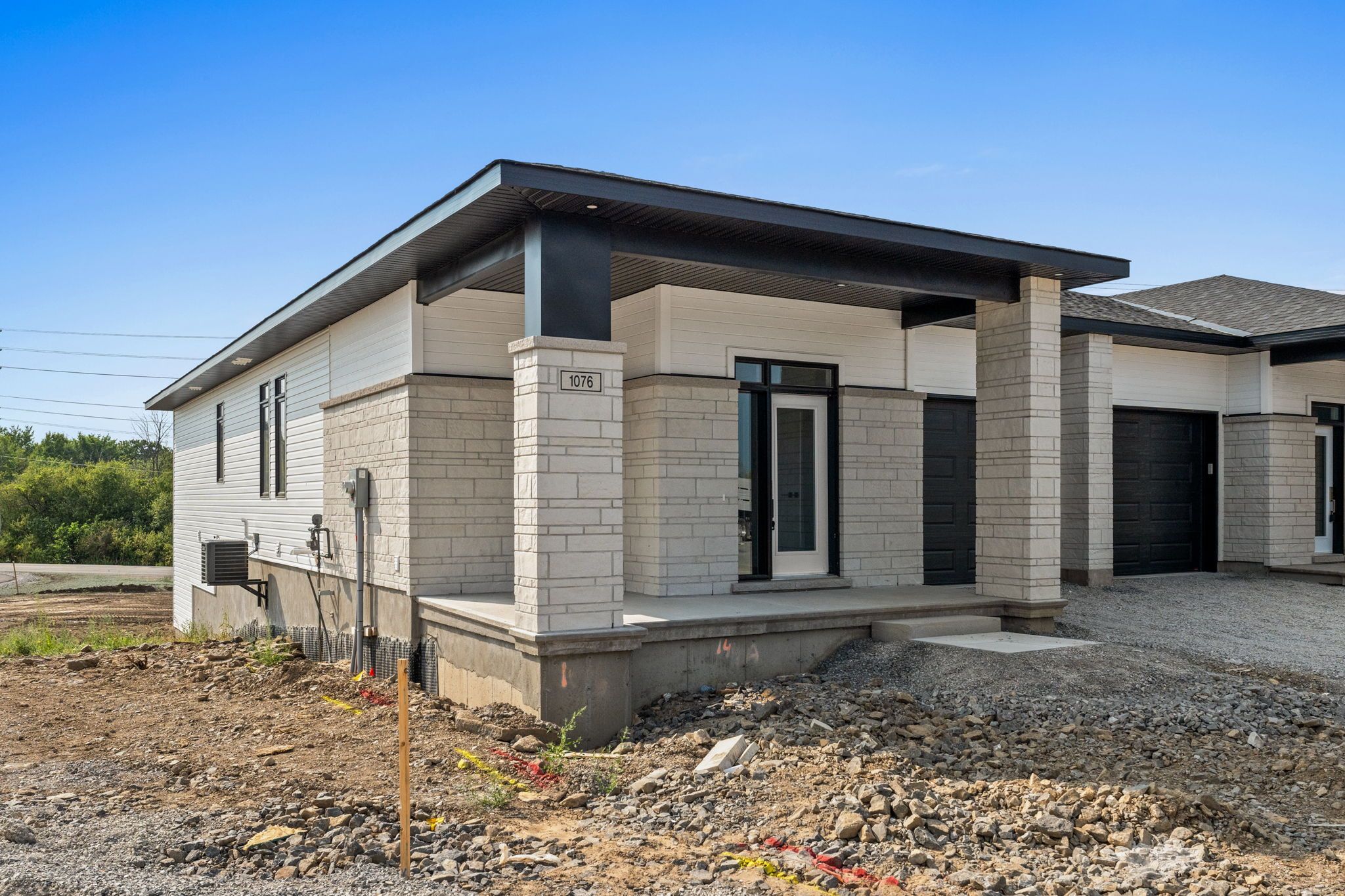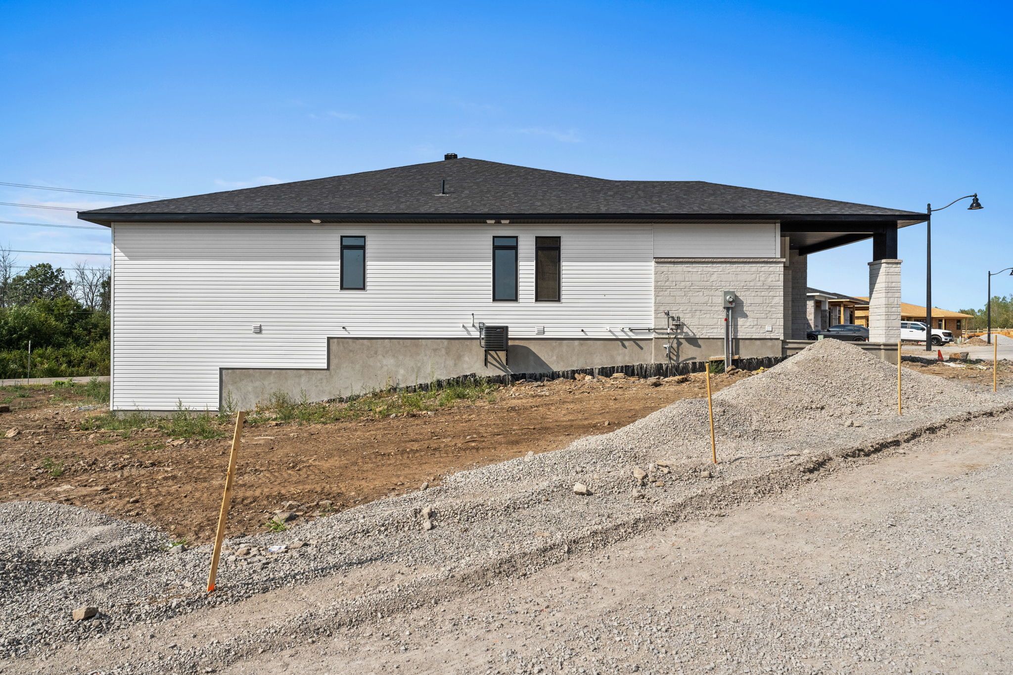 Set in brockville's stirling meadows, this newly built semi-detached bungalow blends contemporary design with a convenient location, just moments from highway 401 and close to shopping, dining, and recreational amenities. The grenville walkout model by mackie homes offers approximately 1,580 square feet of thoughtfully designed living space, including three bedrooms, two bathrooms, main-level laundry, a single-car garage, and a desirable walkout elevation that opens to the backyard. A covered front porch welcomes you inside, where a bright, open-concept layout connects the kitchen, dining area, and living room. The kitchen is appointed with ample cabinetry, quartz countertops, an elongated tile backsplash, a pantry, and a centre island that anchors the space. The living room features a natural gas fireplace and access to the sun deck, extending the living area outdoors. The primary bedroom includes a walk-in closet and a four-piece ensuite with a dual-sink vanity. Two additional bedrooms and a full bathroom complete the main-level layout.