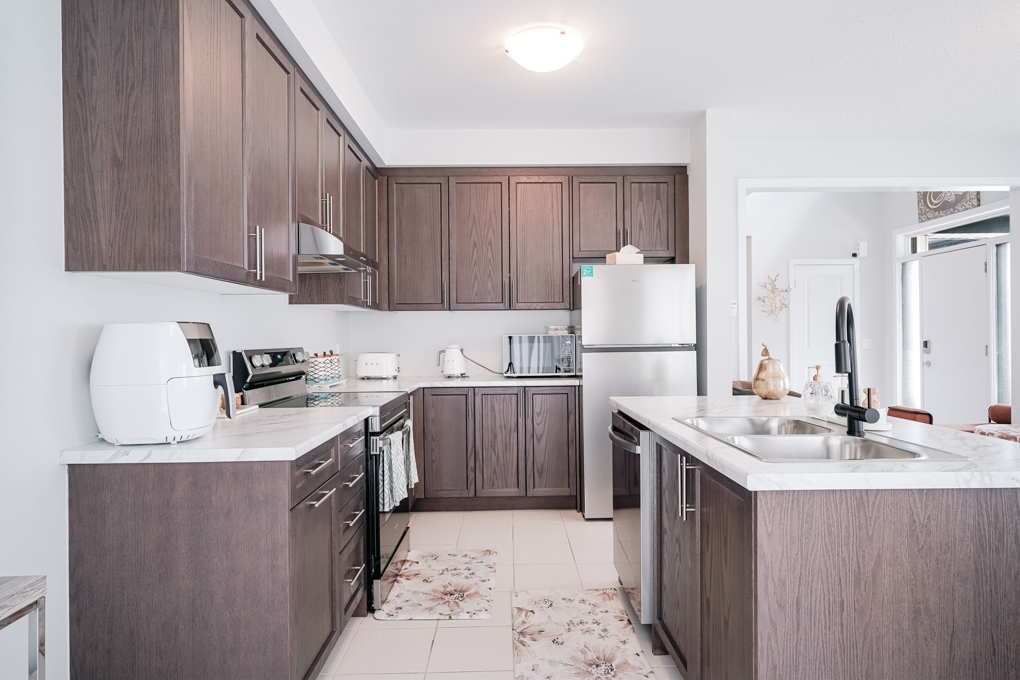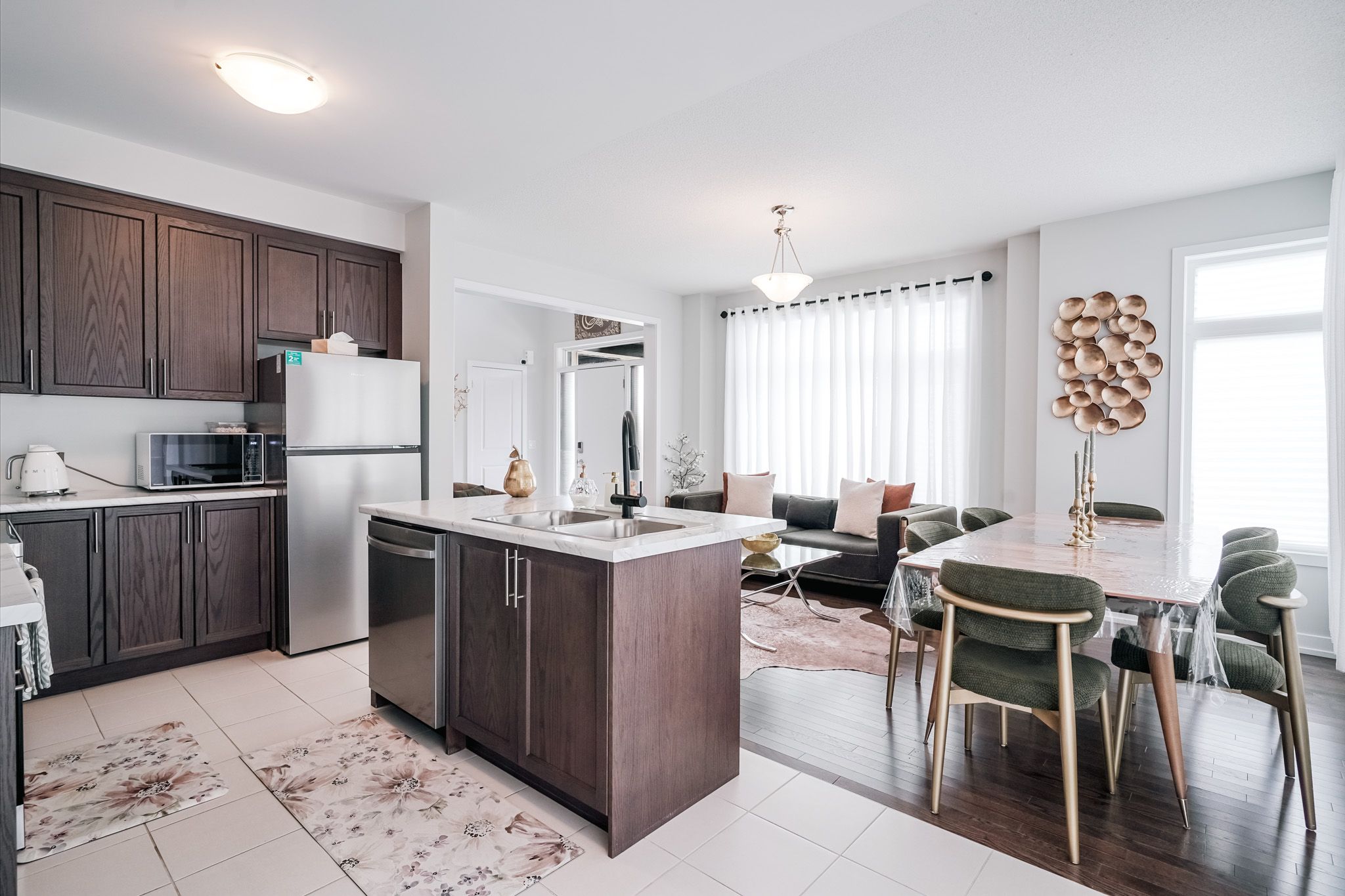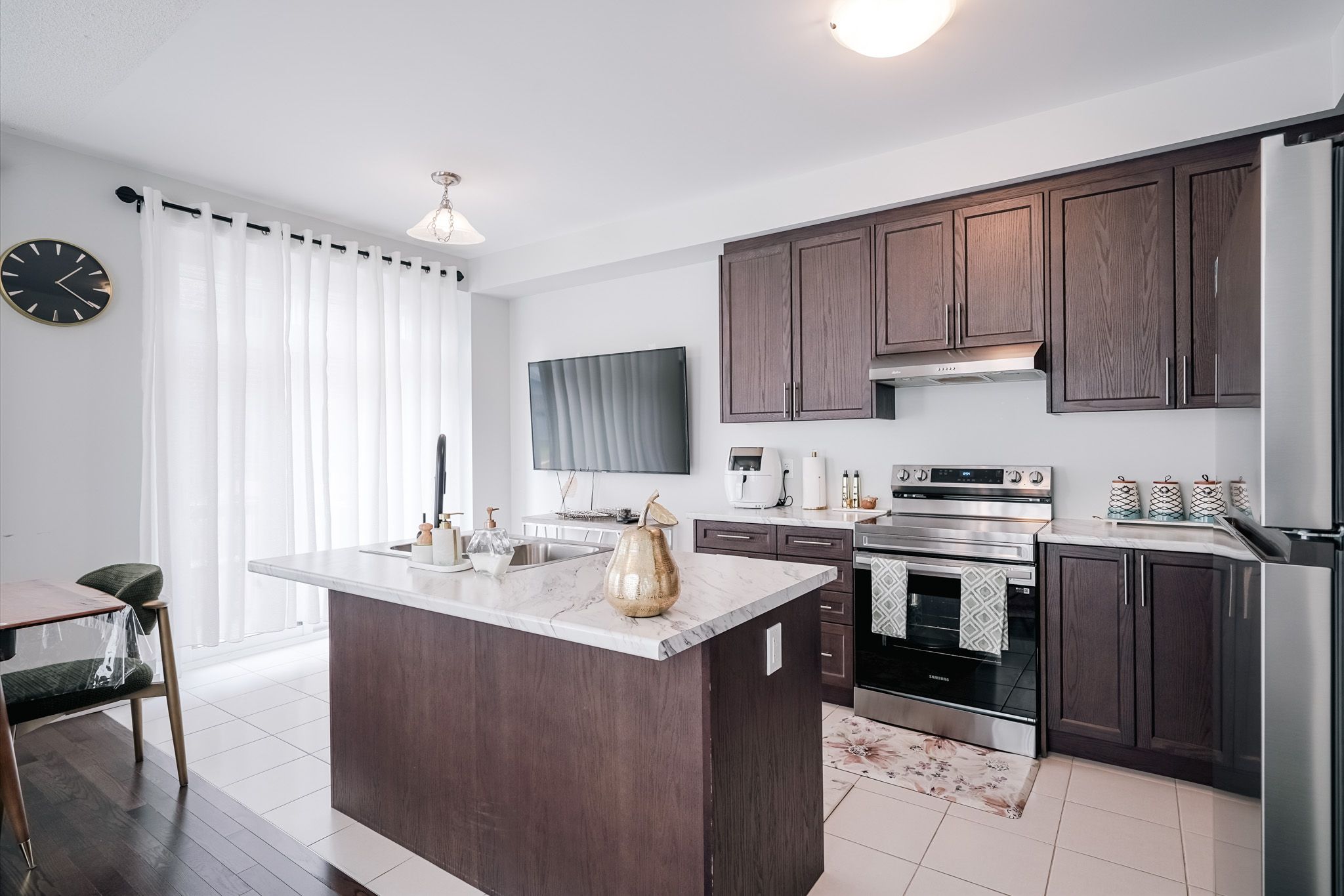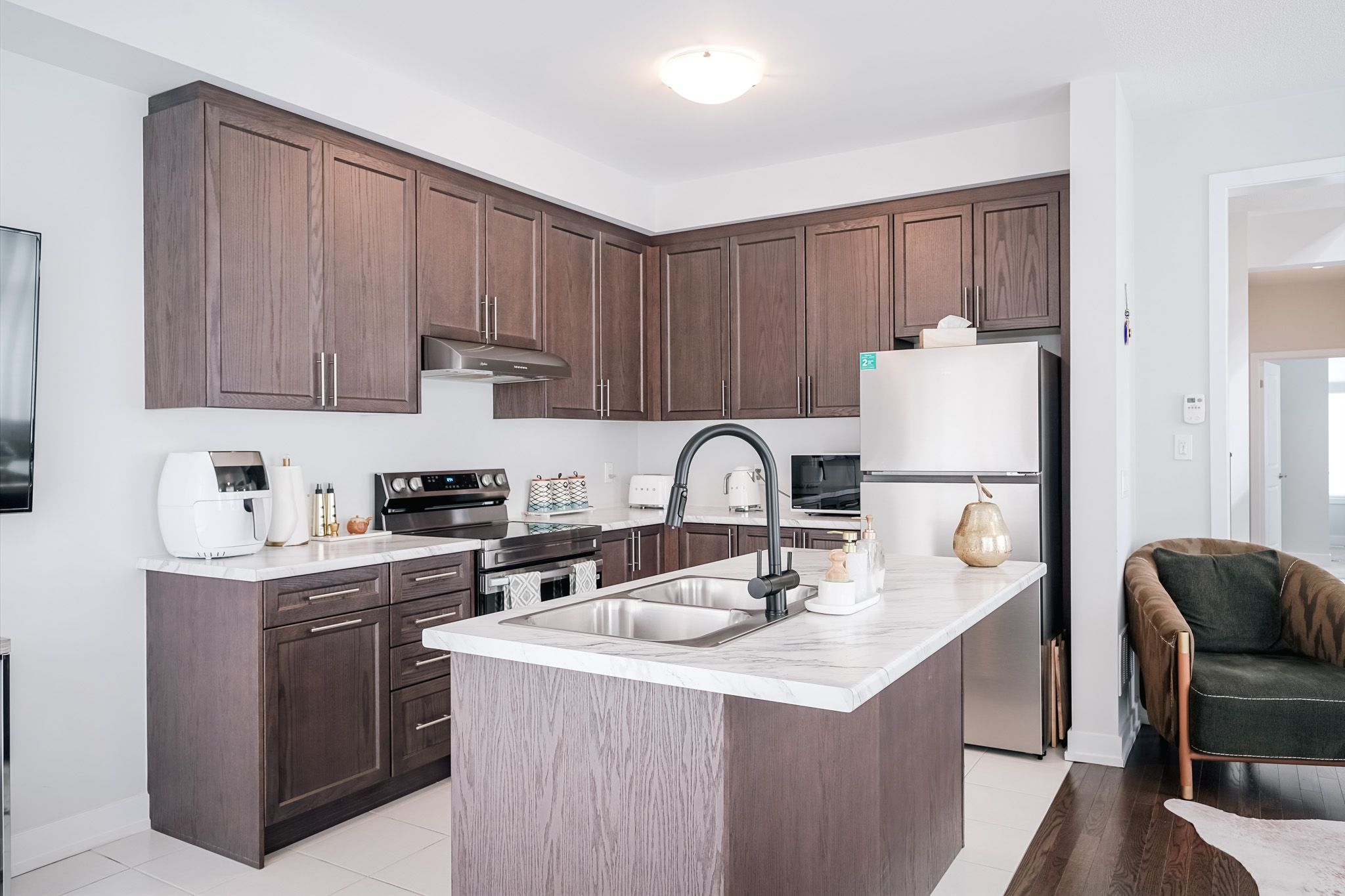 Welcome to this stunning corner townhouse in oshawa's newly developed kedron community by minto. Built just 1 year ago and offering 2,261 sq ft of thoughtfully designed living space, this home blends modern finishes with family functionality. The main floor features a guest suite with a full bathroom, perfect for in-laws or visitors. Smooth 9 ft ceilings and large windows create a bright, airy atmosphere, while the open-concept living, dining, and kitchen/breakfast area makes entertaining seamless. The kitchen boasts stainless steel appliances, ample cabinetry, and plenty of counter space. Rich hardwood flooring flows through the main level, with cozy carpeting in bedrooms and basement. Upstairs, you'll find three spacious bedrooms and two full bathrooms, including a huge primary retreat with a walk-in closet and spa-inspired ensuite. One of the bedrooms even features a charming juliet balcony. For convenience, the laundry room is located on the second floor. The professionally finished basement by the builder offers an additional level of living space with 8 ft ceilings, ideal as a recreation room, office, or gym. As a corner unit, this townhouse enjoys an abundance of natural light and extra privacy, making it feel more like a detached home. With its generous layout, its perfectly suited for a young family or multi-generational living. Nestled in kedron, one of oshawa's most desirable new communities, you'll enjoy proximity to parks, schools, shops, and easy access to major highways. This is not just a home its a lifestyle opportunity in one of durham's fastest-growing neighborhoods.