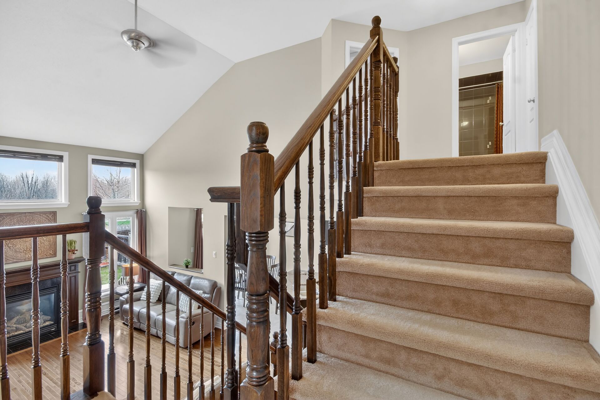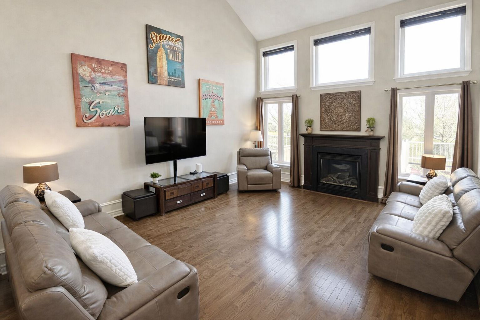 • Open-concept main floor with vaulted ceilings and cozy gas fireplace.