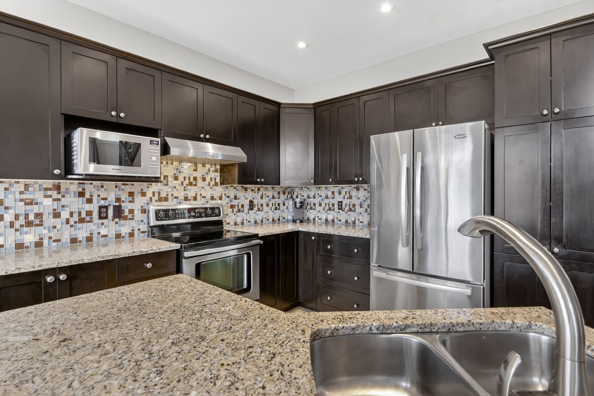 • Gourmet kitchen with granite countertops, solid wood cabinetry, and bar seating.