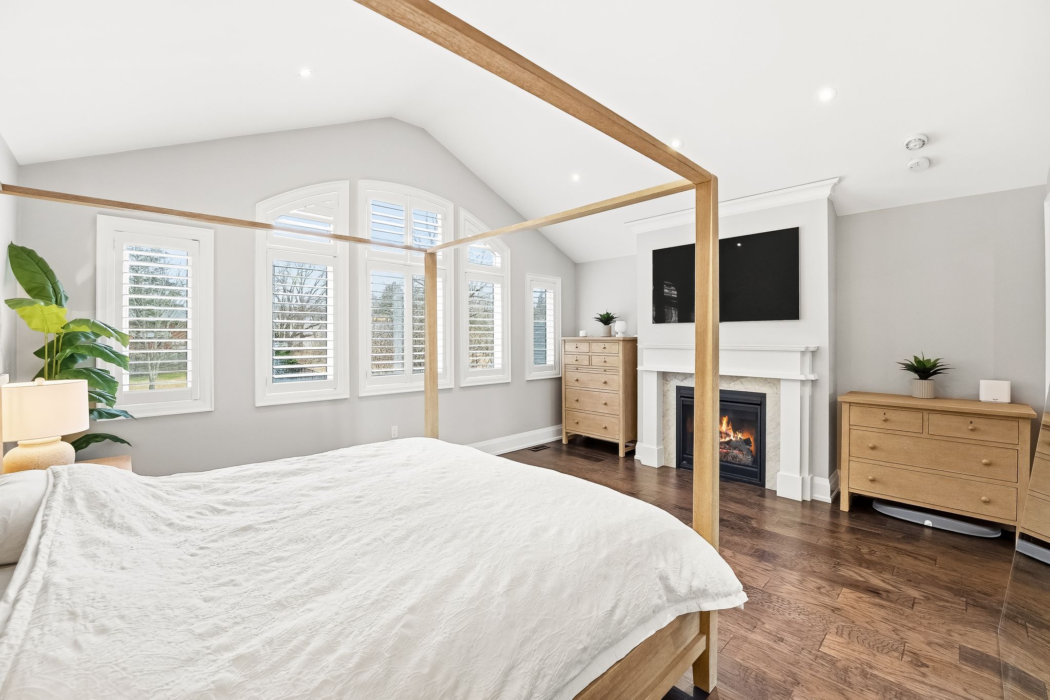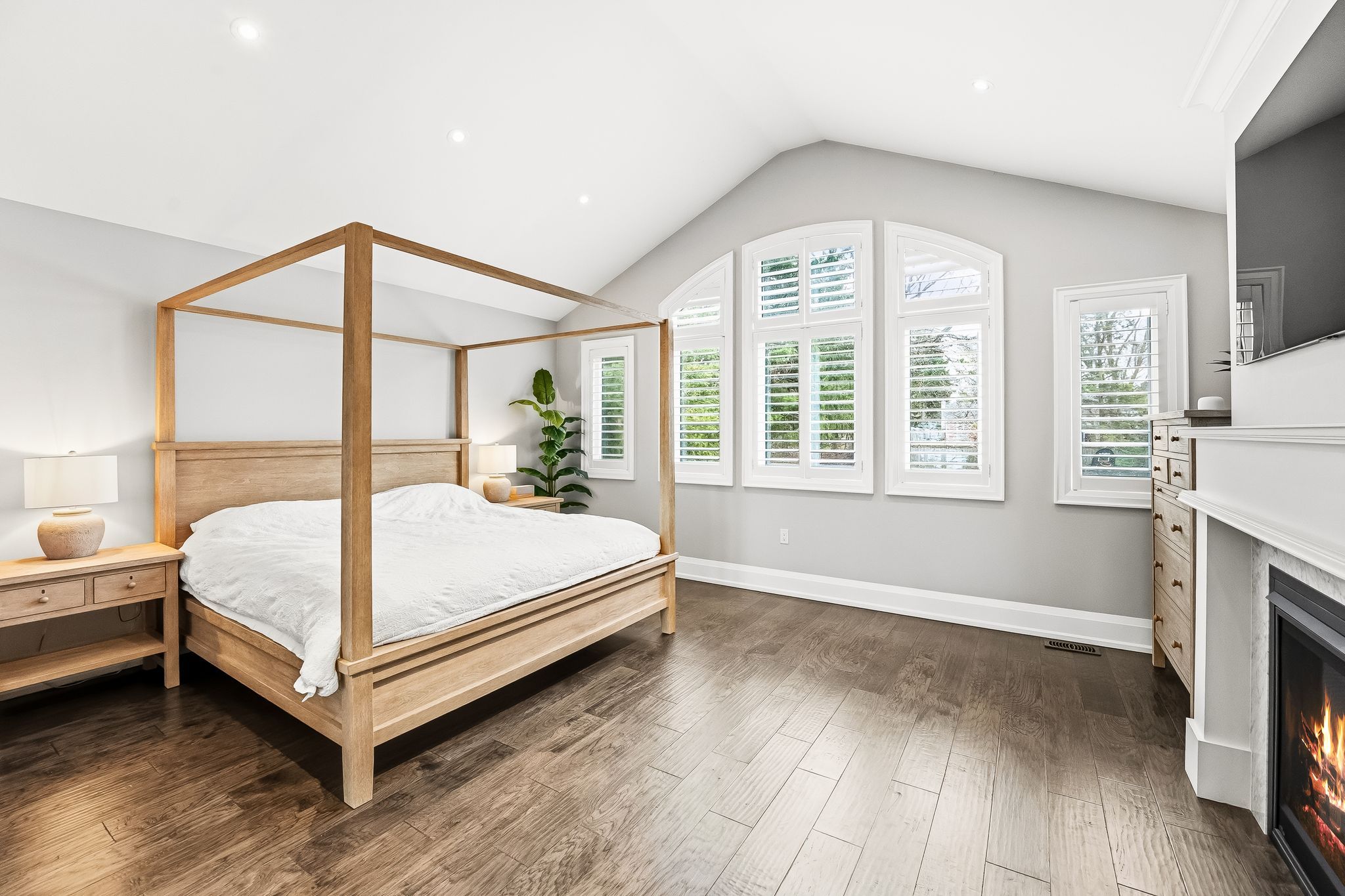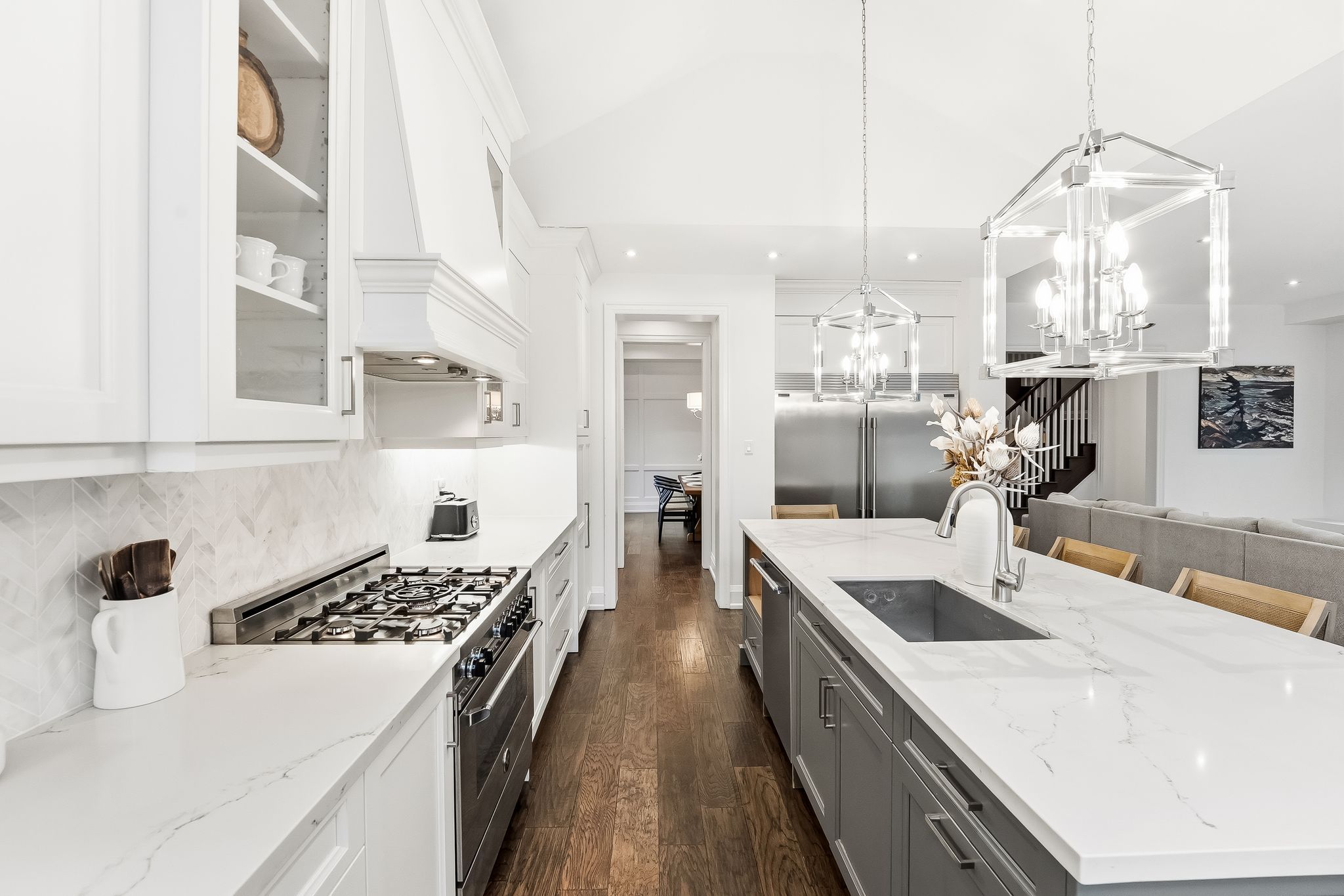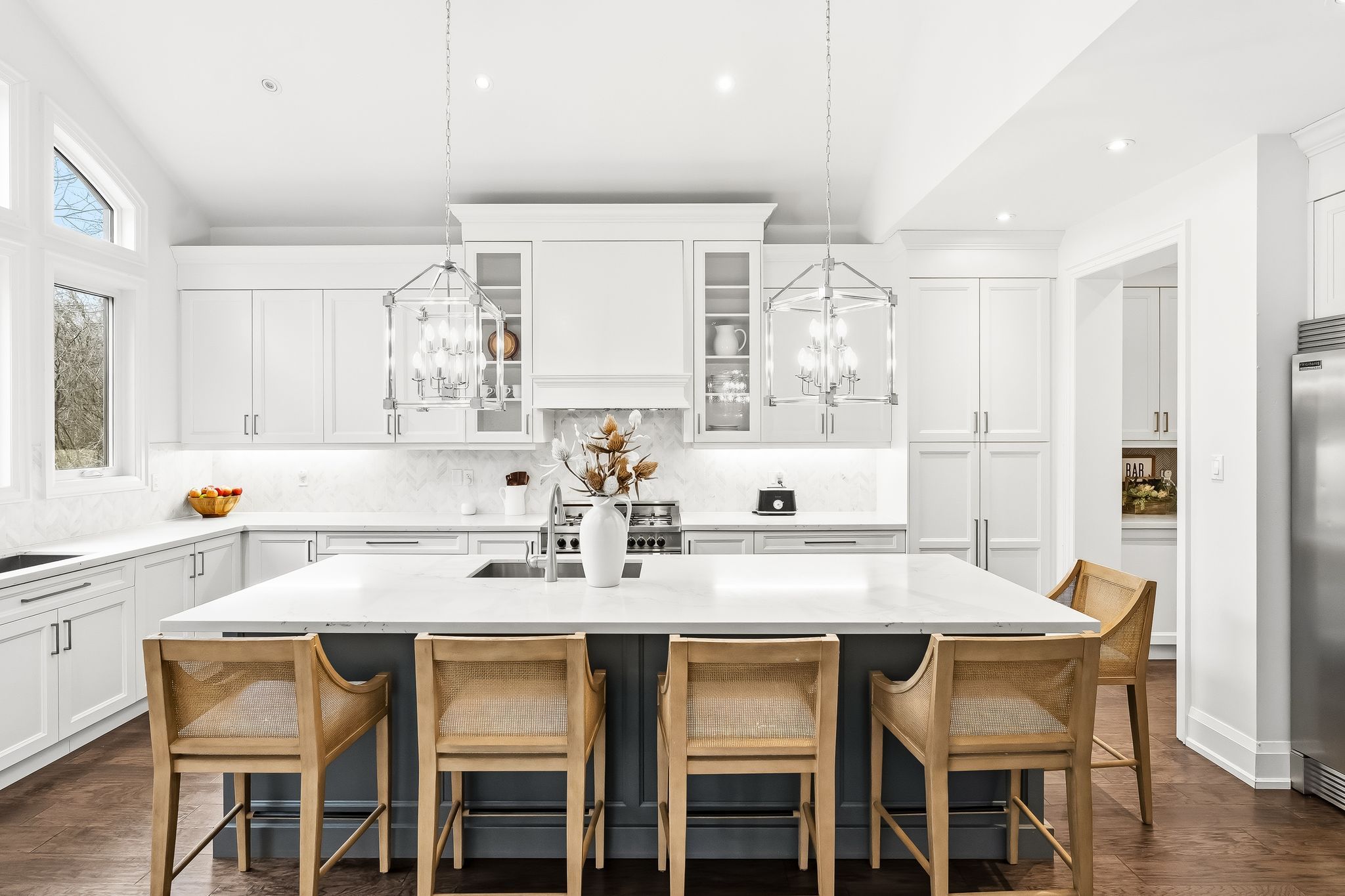 • Chef-inspired kitchen featuring quartz countertops and vaulted ceilings.
