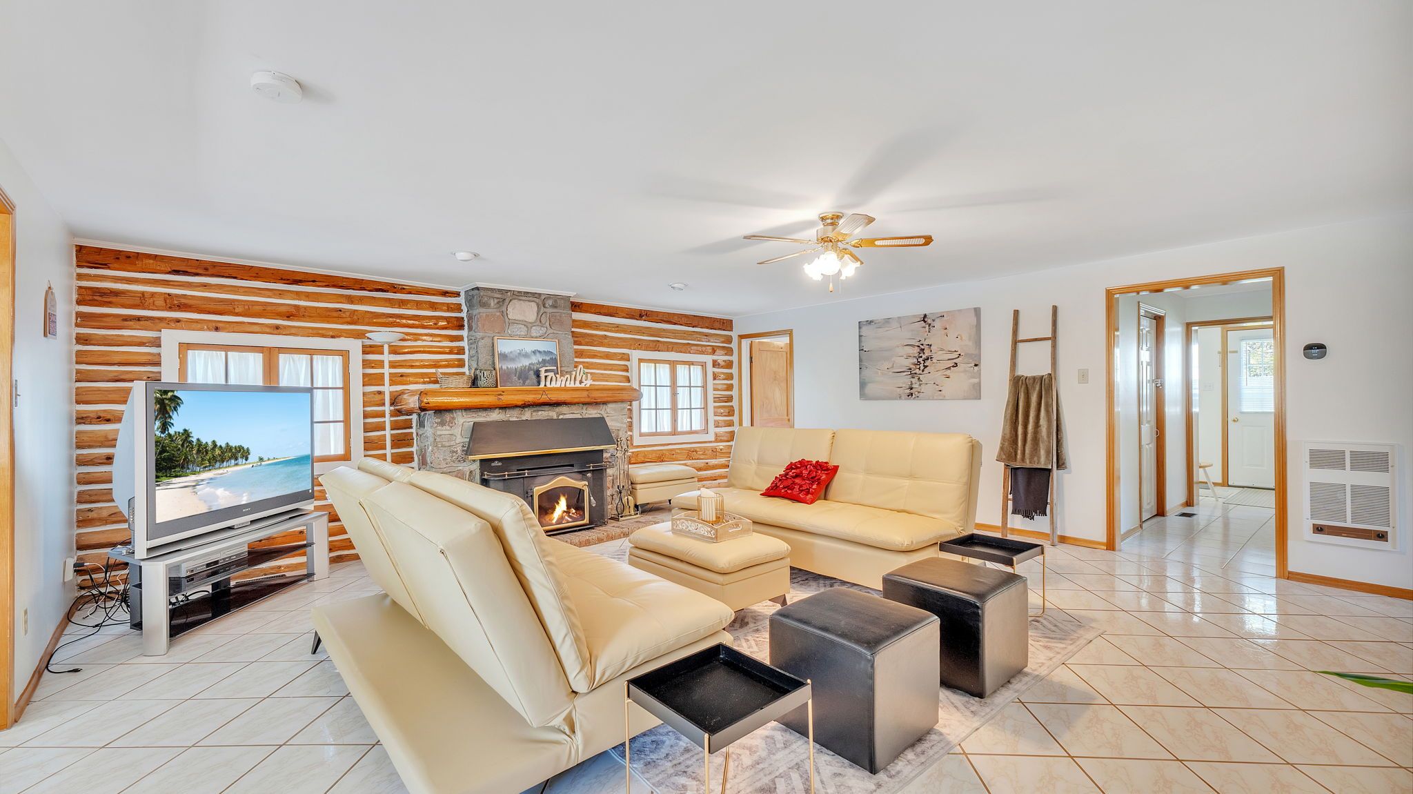 • Main cottage features three bedrooms, rustic fireplace, and central air conditioning.