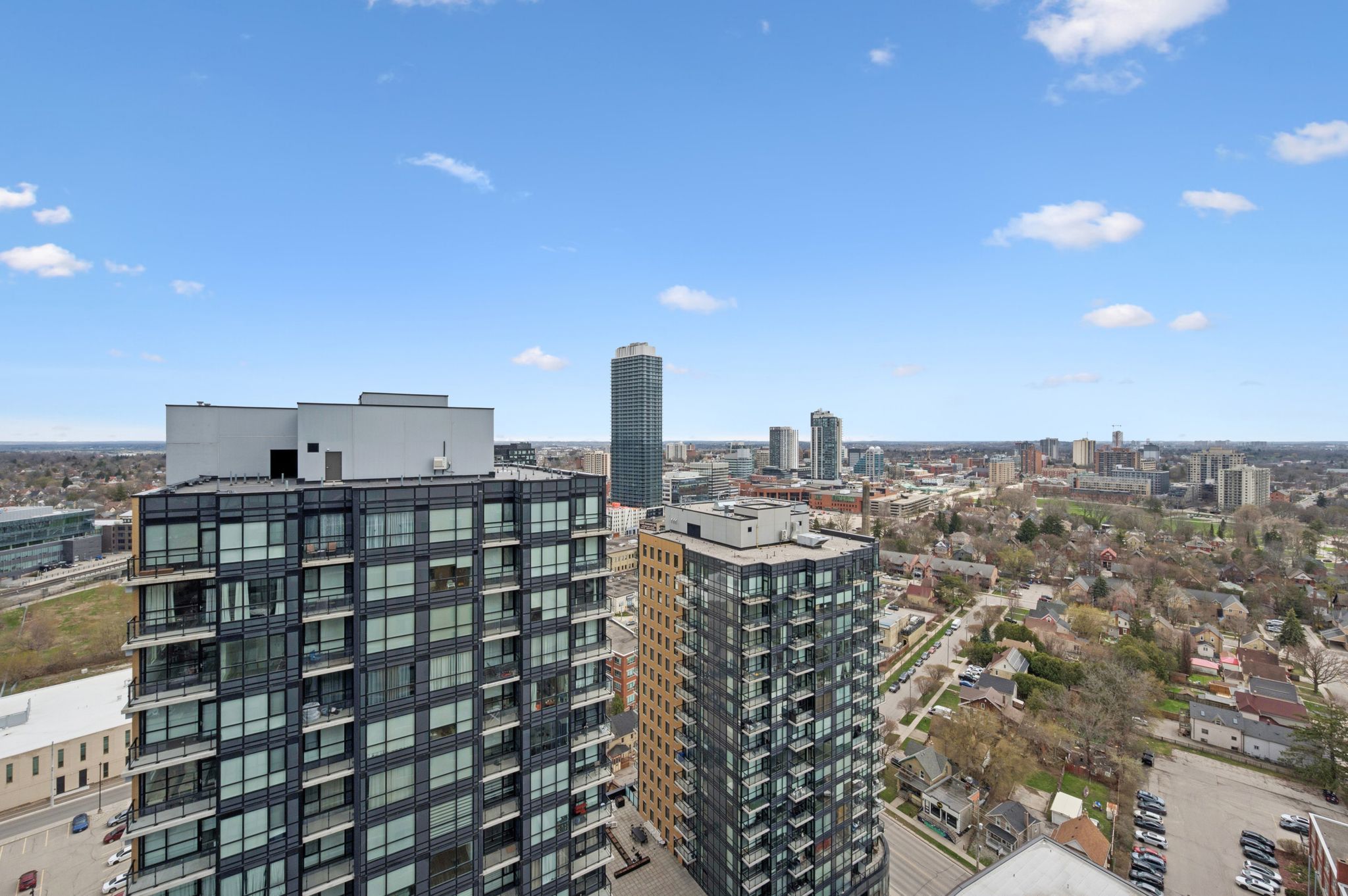 There's something about being this high up that shifts your perspective... The light, the energy, the quiet above it all. From the 25th floor at 108garment street, every morning begins with uninterrupted sunrise views stretching over king street and the innovation district, with google right in your sightline. This one-bedroom suite has been thoughtfully upgraded and meticulously cared for, offering nearly $20,000 in elevated finishes. Owner occupied and never rented, it shows in the details. Quartz countertops, engineered wide plank flooring, oversized tile, upgraded cabinetry, and sleek chrome fixtures create a clean, modern backdrop, while the upgraded stainless steel appliances bring both style and function to the kitchen. The living space has been elevated with custom panelling and mouldings, adding warmth and character you don't often find in condo living. Freshly painted in 2026, the entire unit feels crisp, intentional, and completely move-in ready. Smart storage has been seamlessly integrated with built-ins in the closets, maximizing functionality without compromising the aesthetic. The bathroom is finished with a glass and tile shower for a polished, spa-like feel, and the private balcony offers the perfect place to take in the views and ease into your morning or unwind at the end of the day. Beyond your suite, the building is designed for lifestyle. A landscaped rooftop terrace with bbqs, fitness centre, pool, basketball court, dog park, games room, theatre, and party lounge create a full-service experience right at home. Set in the heart of downtown kitchener's innovation district, you're steps to the lrt, transit hub, restaurants, cafés, shopping, and the region's thriving tech community, with victoria park just a short walk away. It's a location that blends energy and ease effortlessly. A polished, well-cared-for space with thoughtful upgrades, strong views, and a lifestyle that truly delivers