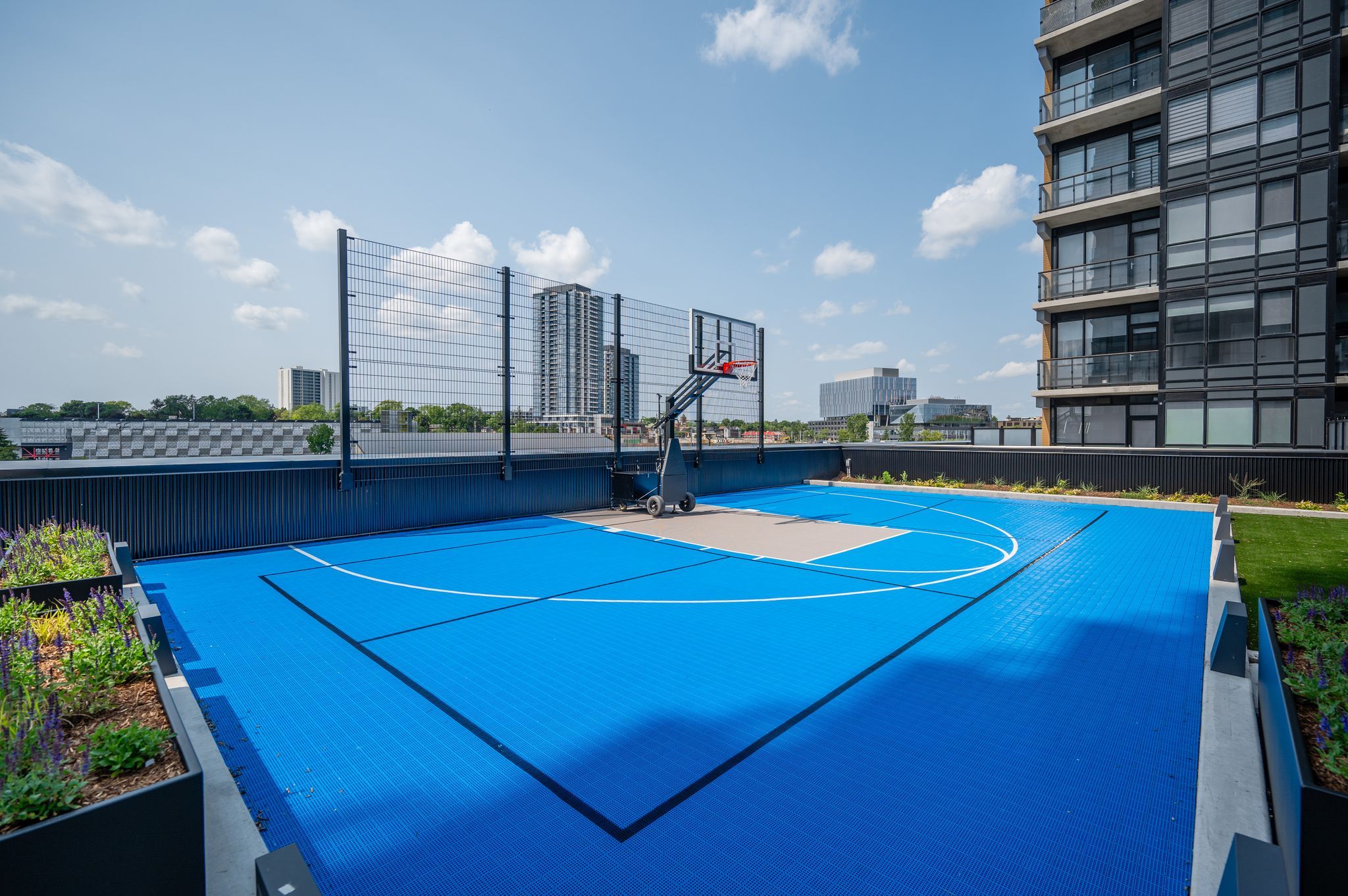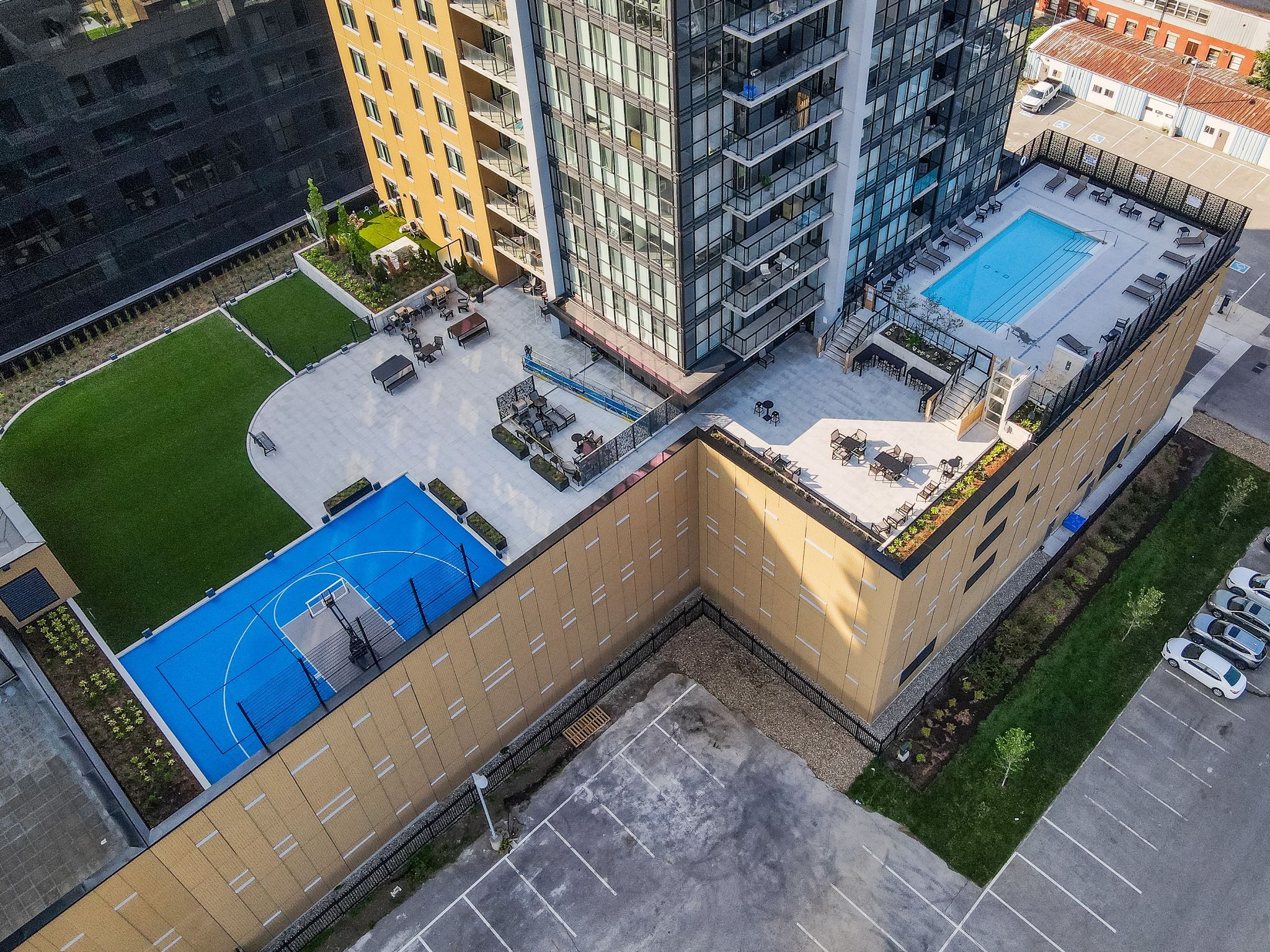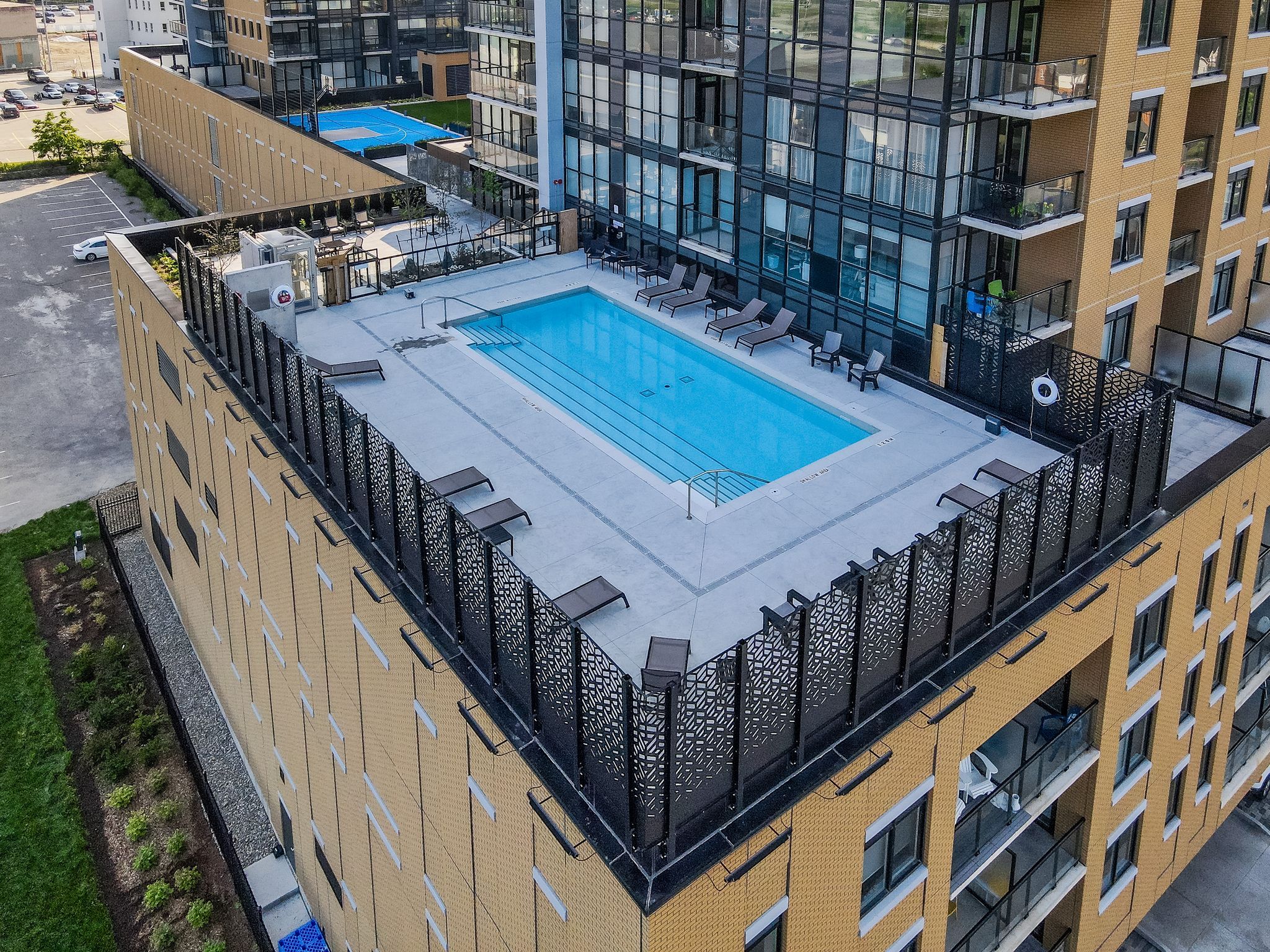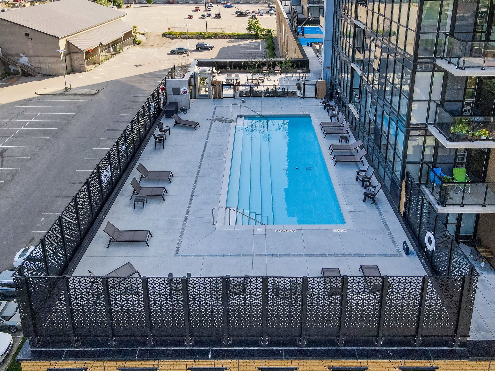 • Full-service building with rooftop terrace, fitness centre, and pool.