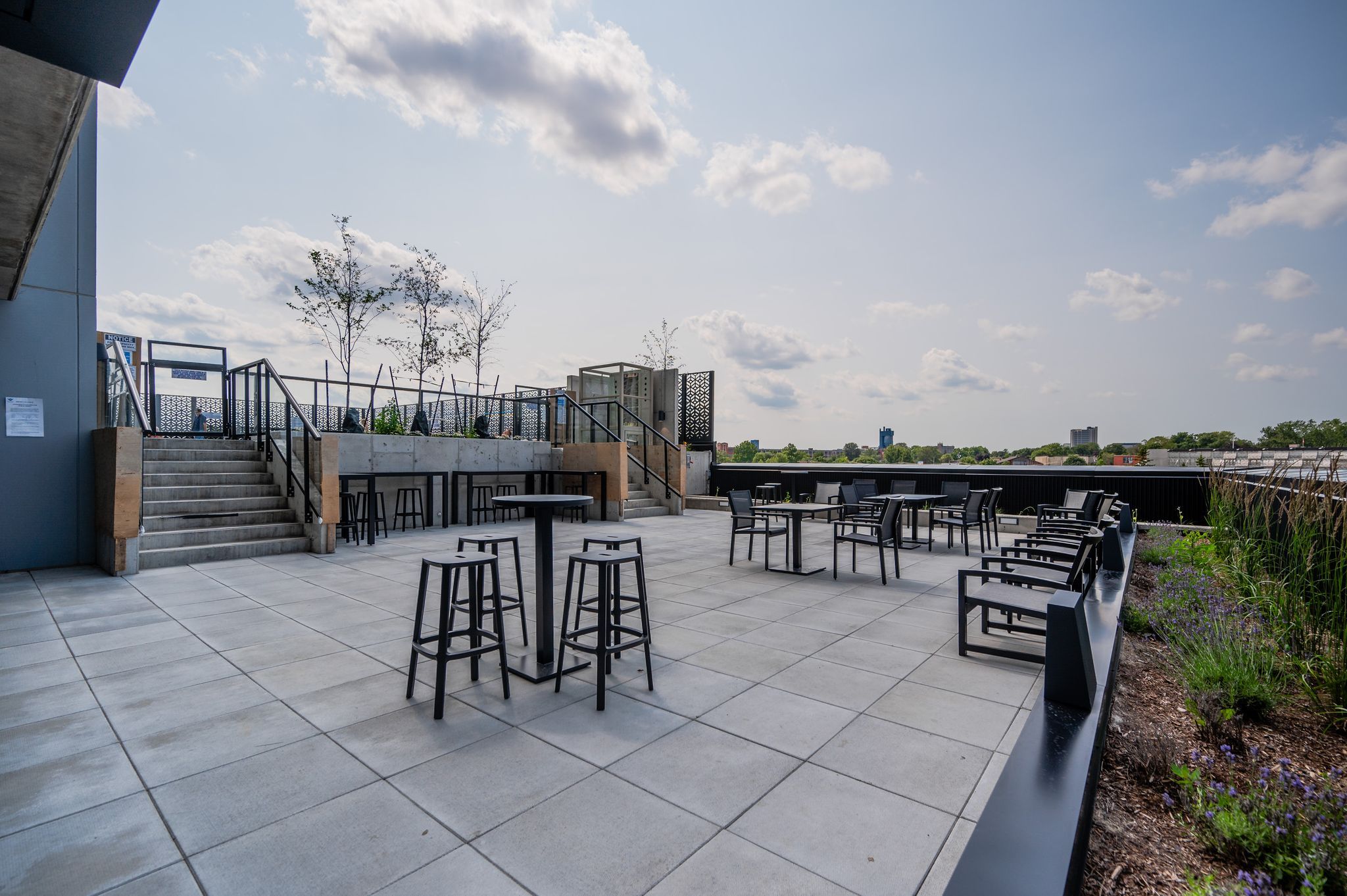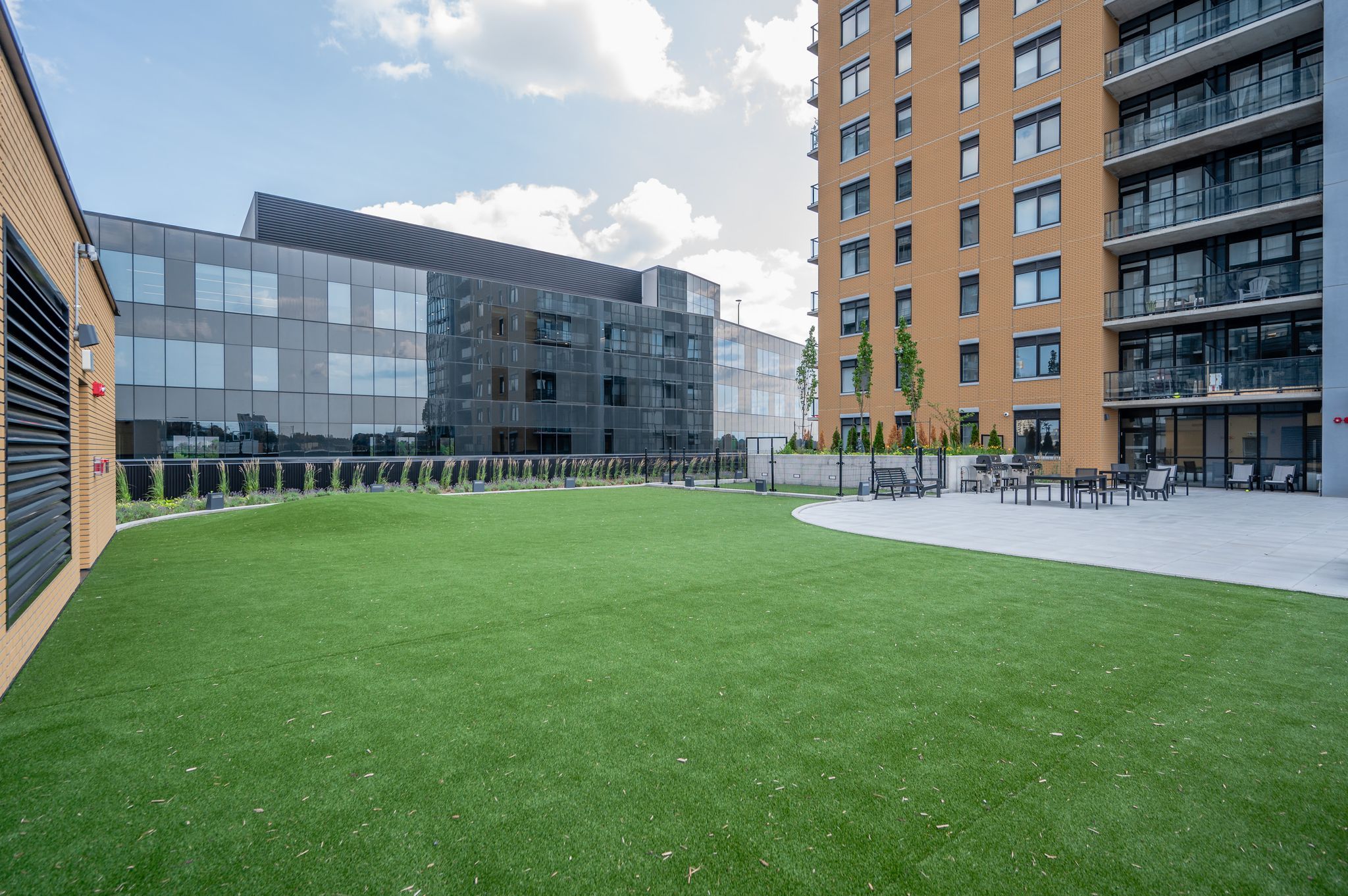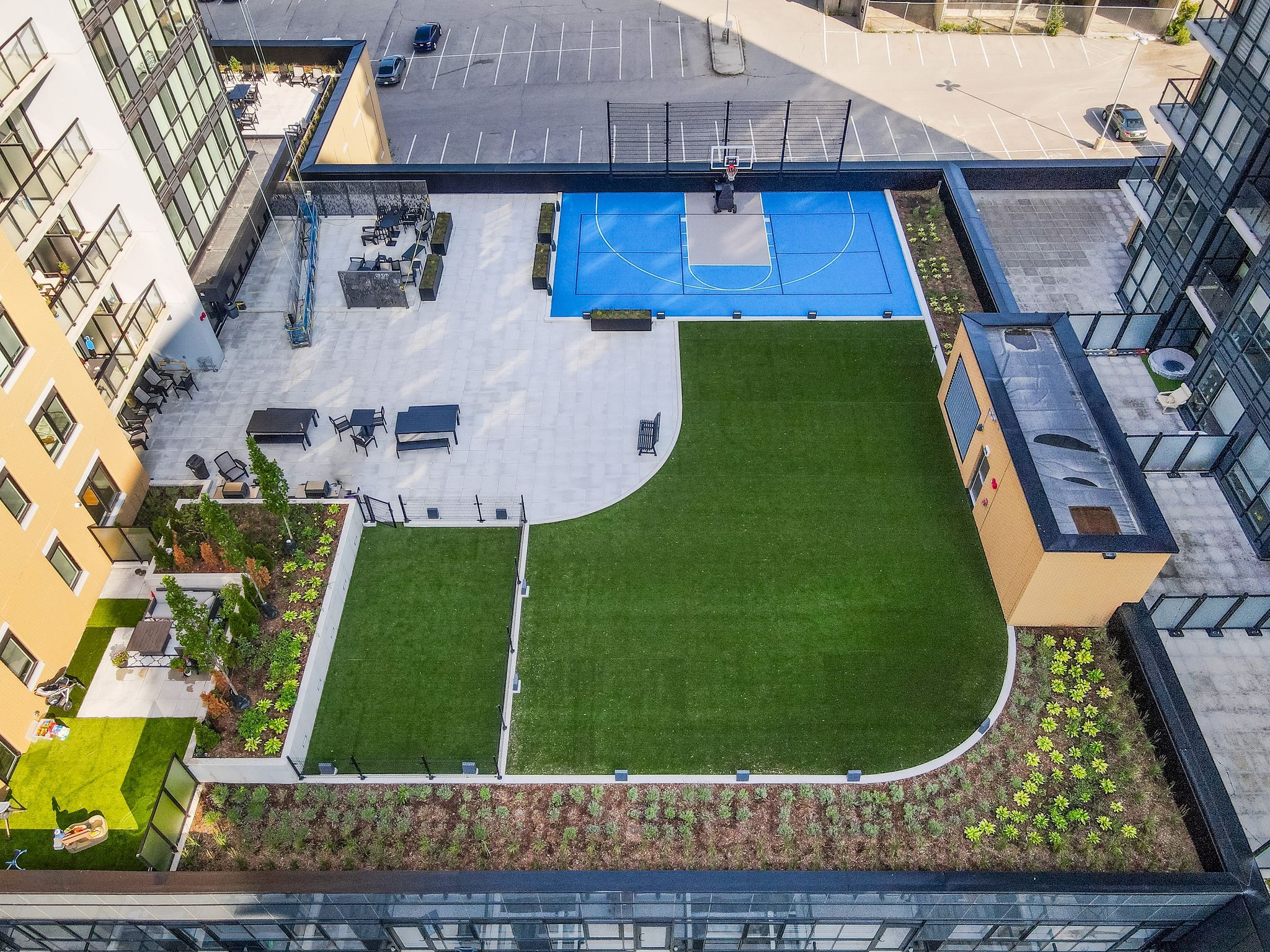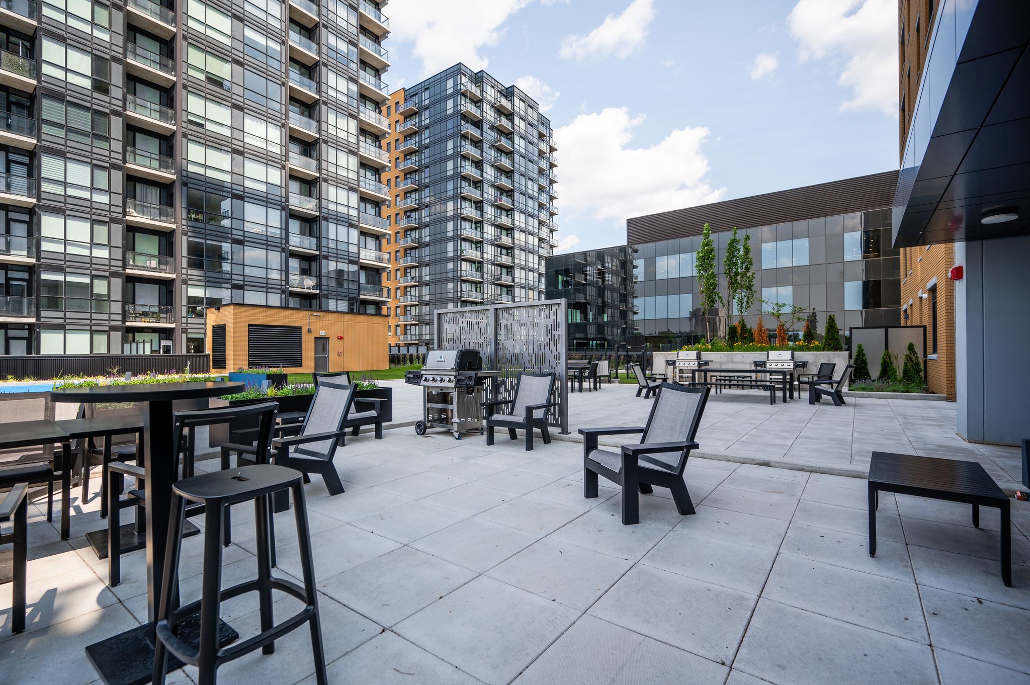 • Full-service building with rooftop terrace, fitness centre, and pool.