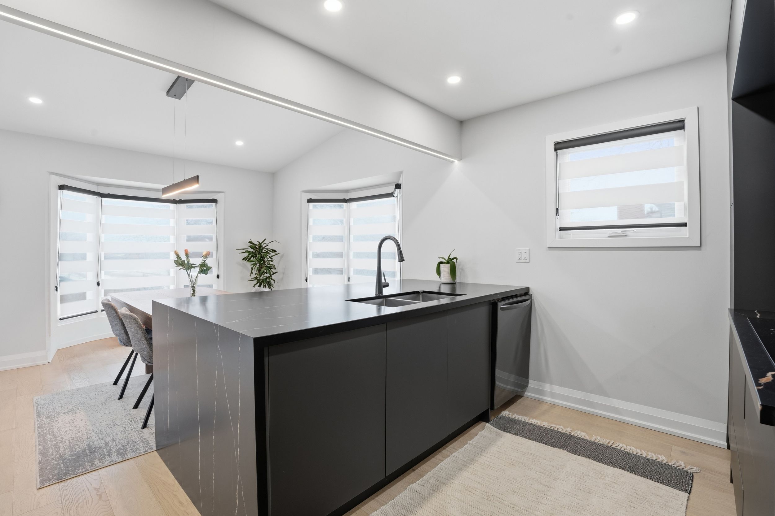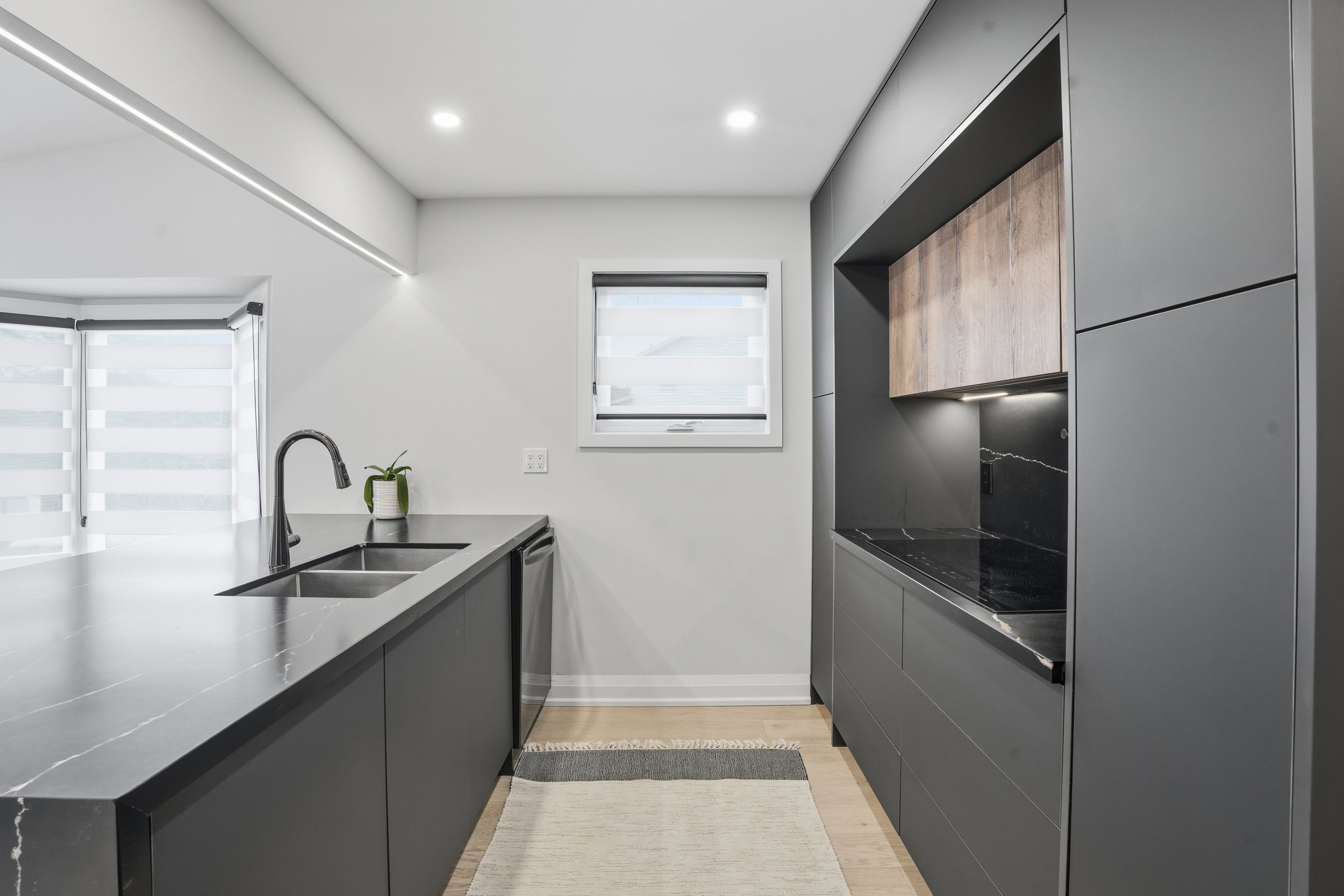 • Modern kitchen equipped with built-in appliances and stylish wet bar.