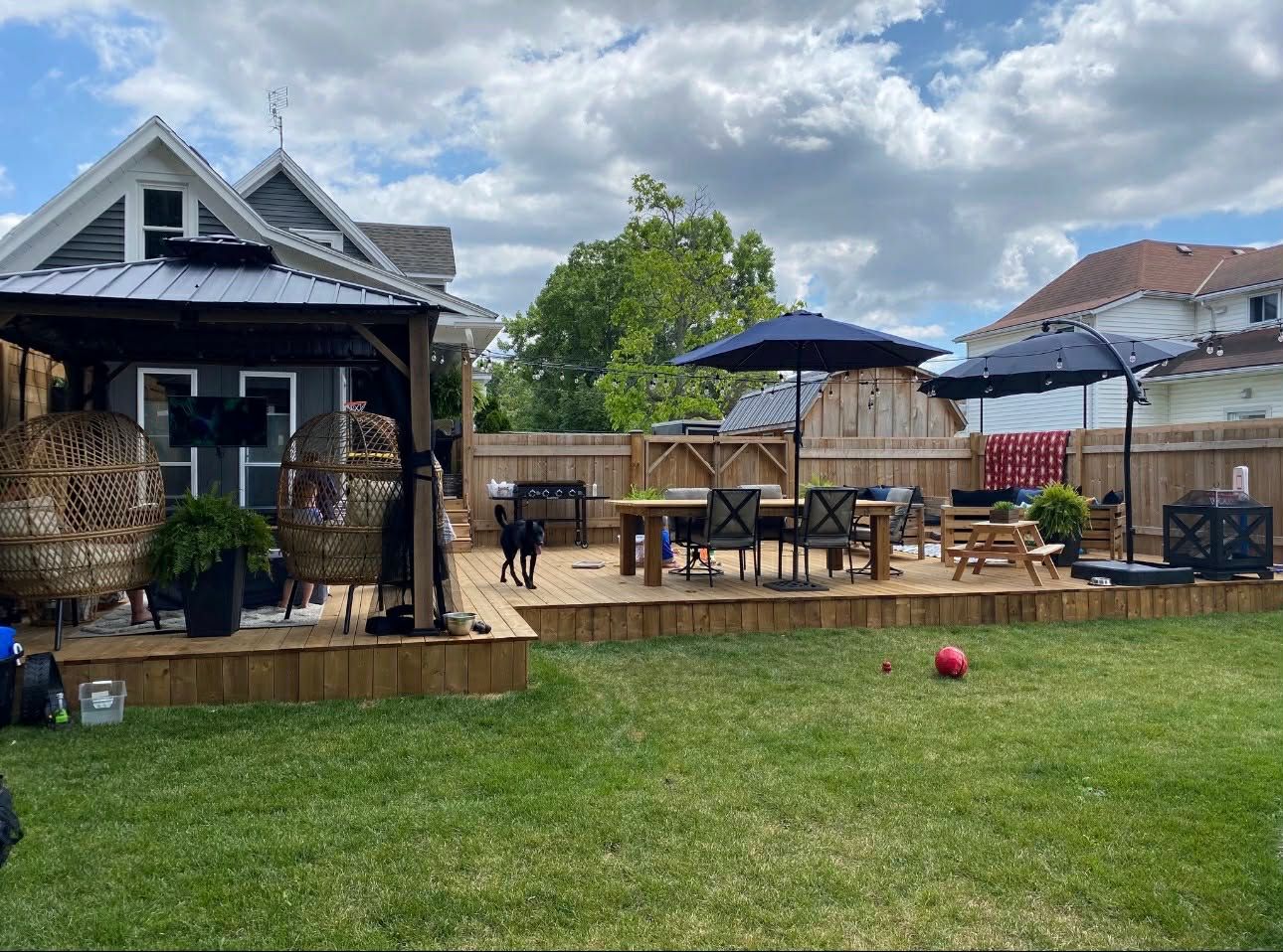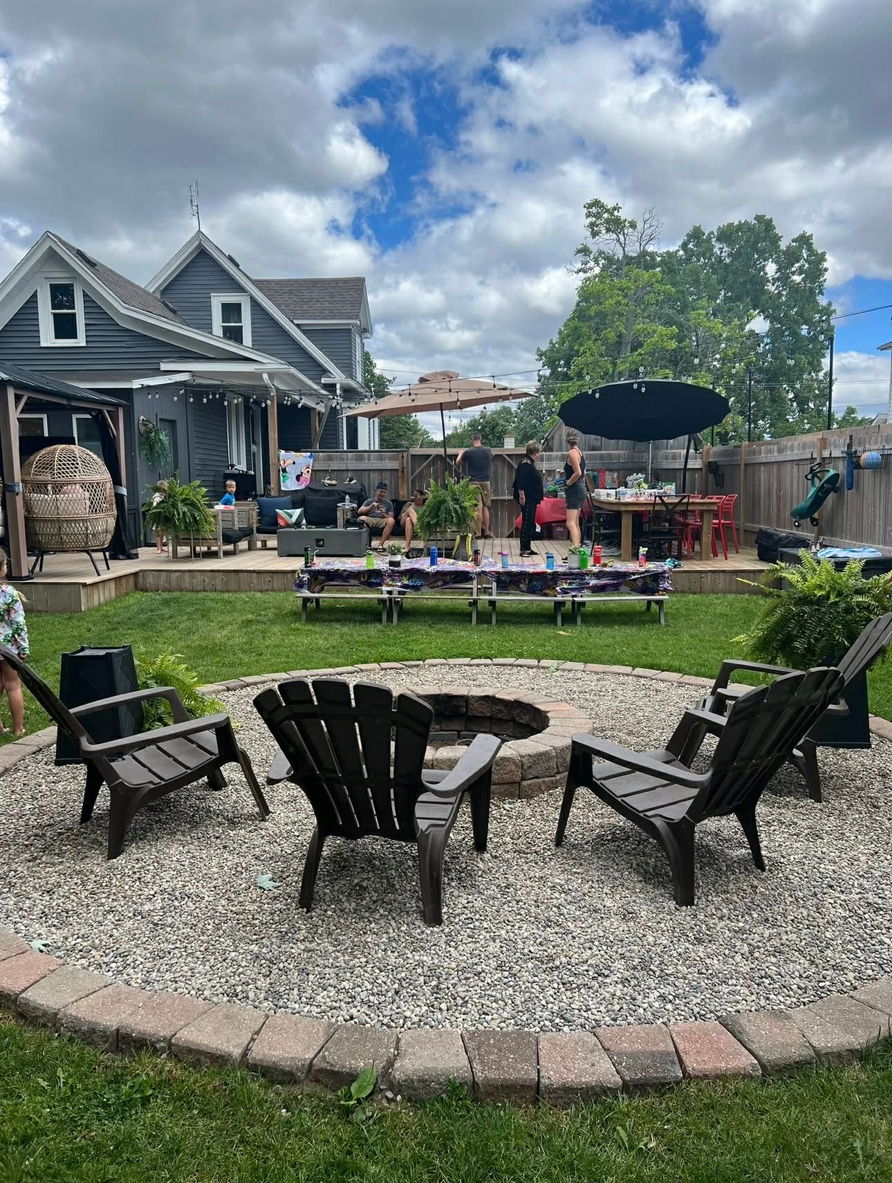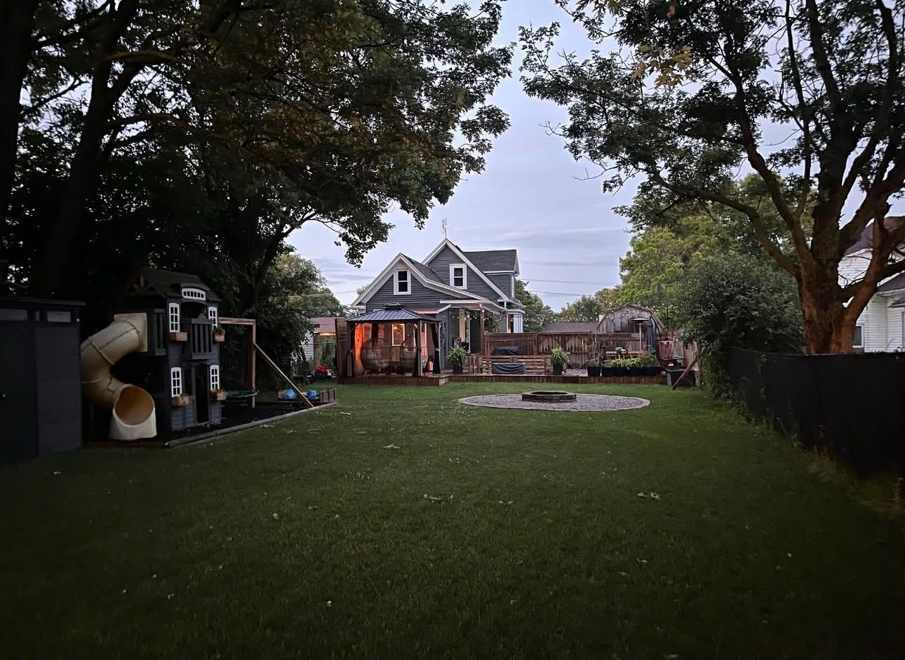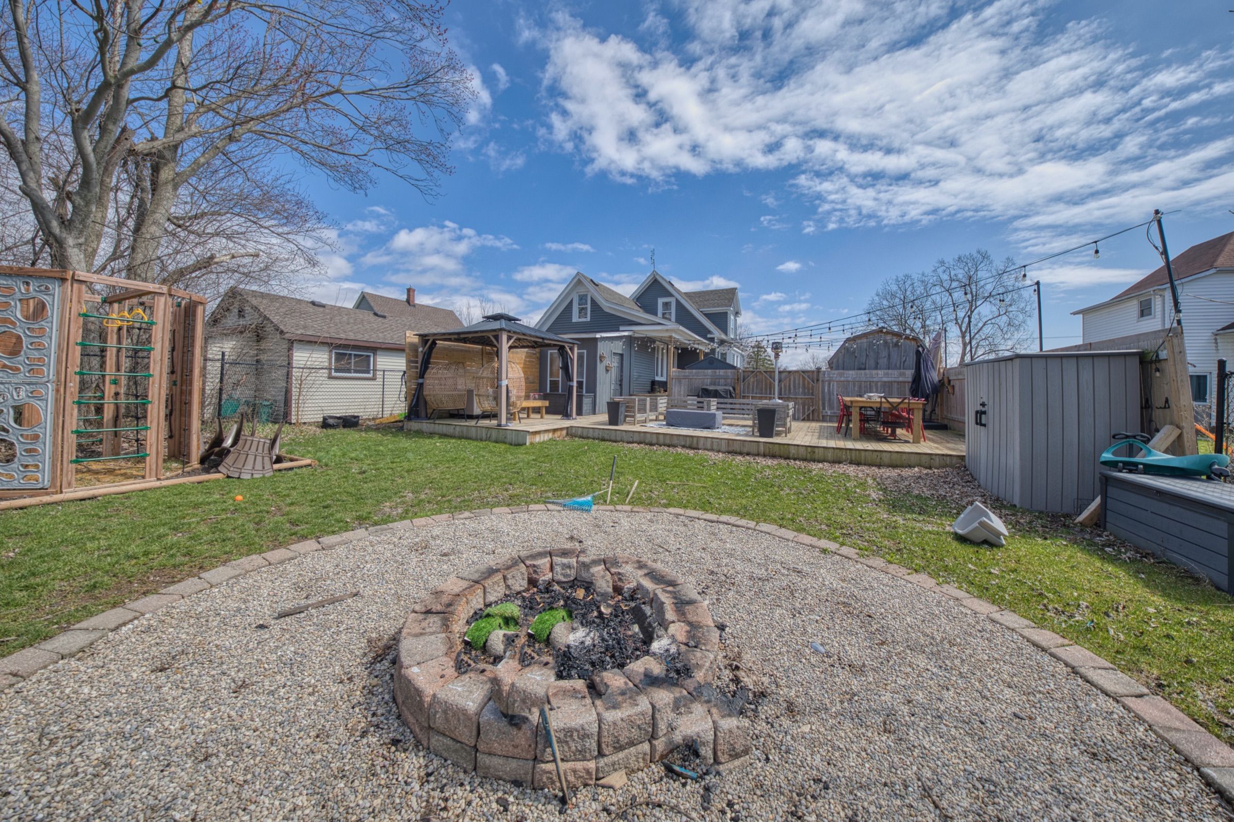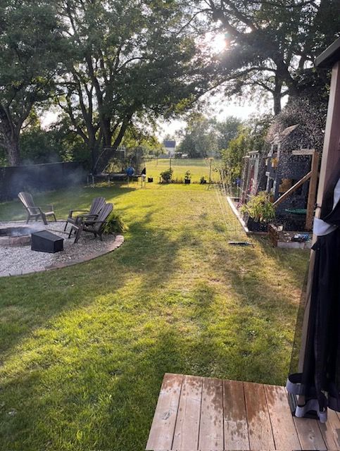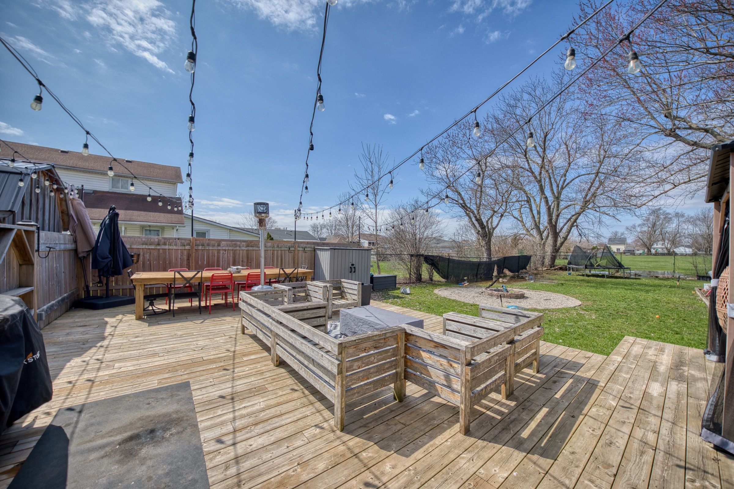 • Huge backyard with deck, firepit, and space for outdoor activities.