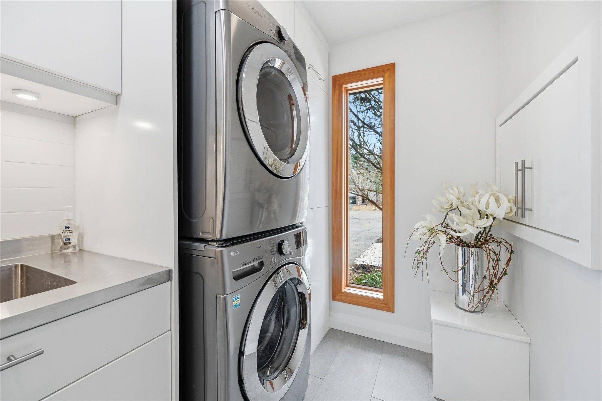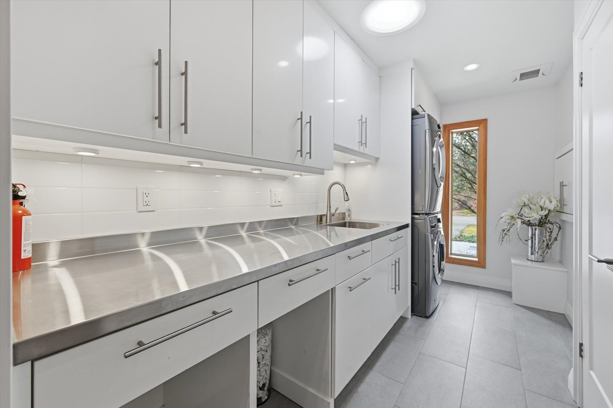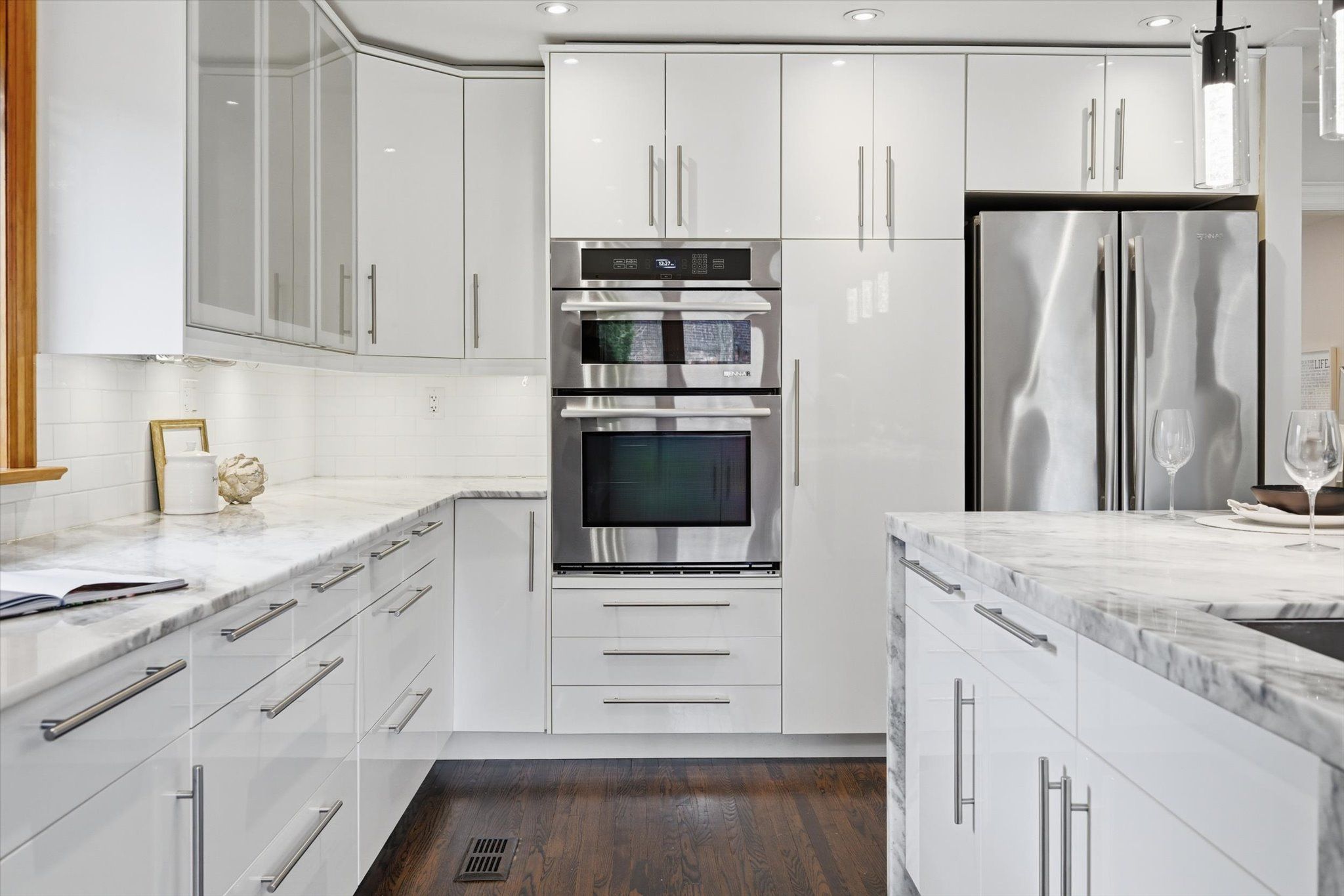 • Modern kitchen features a Super White granite waterfall island for cooking.