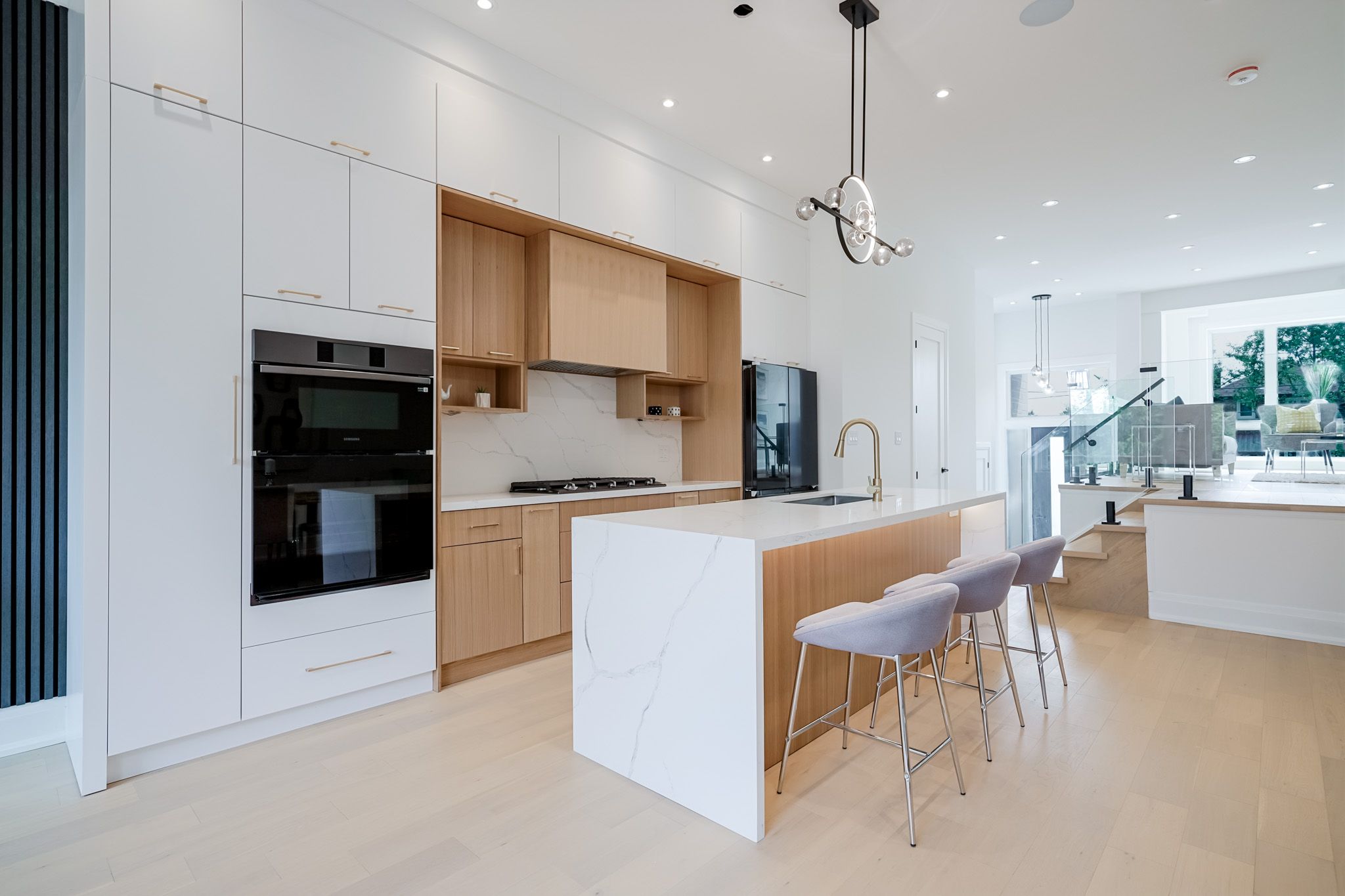 • Chef's kitchen includes quartz counters, gas range, and waterfall island.