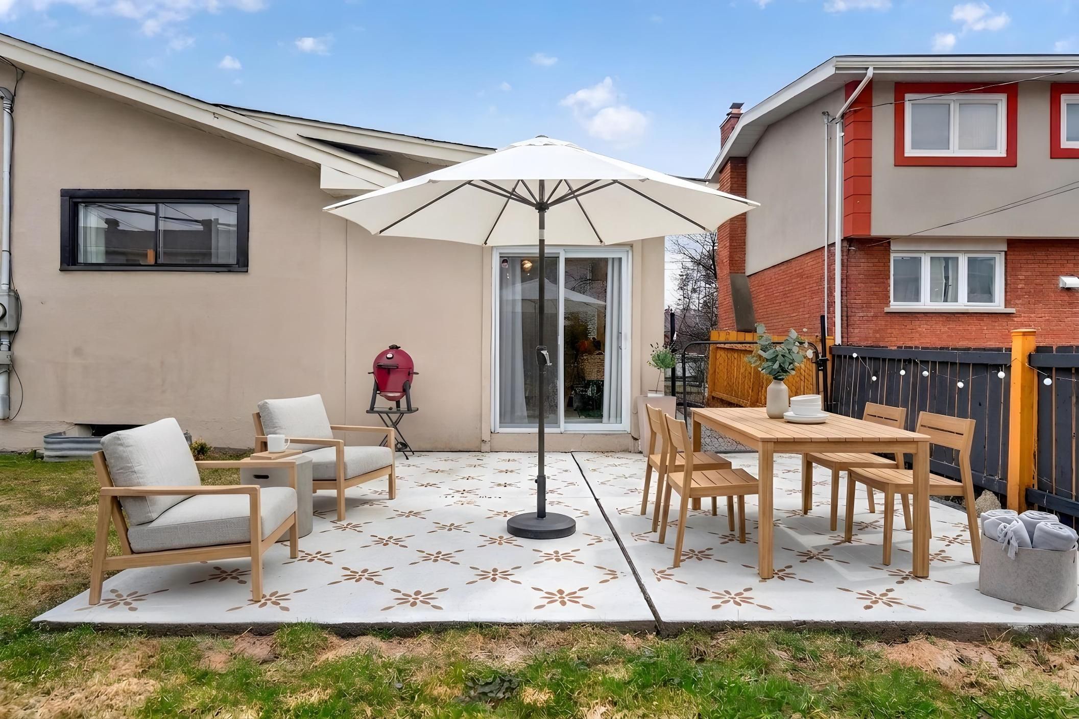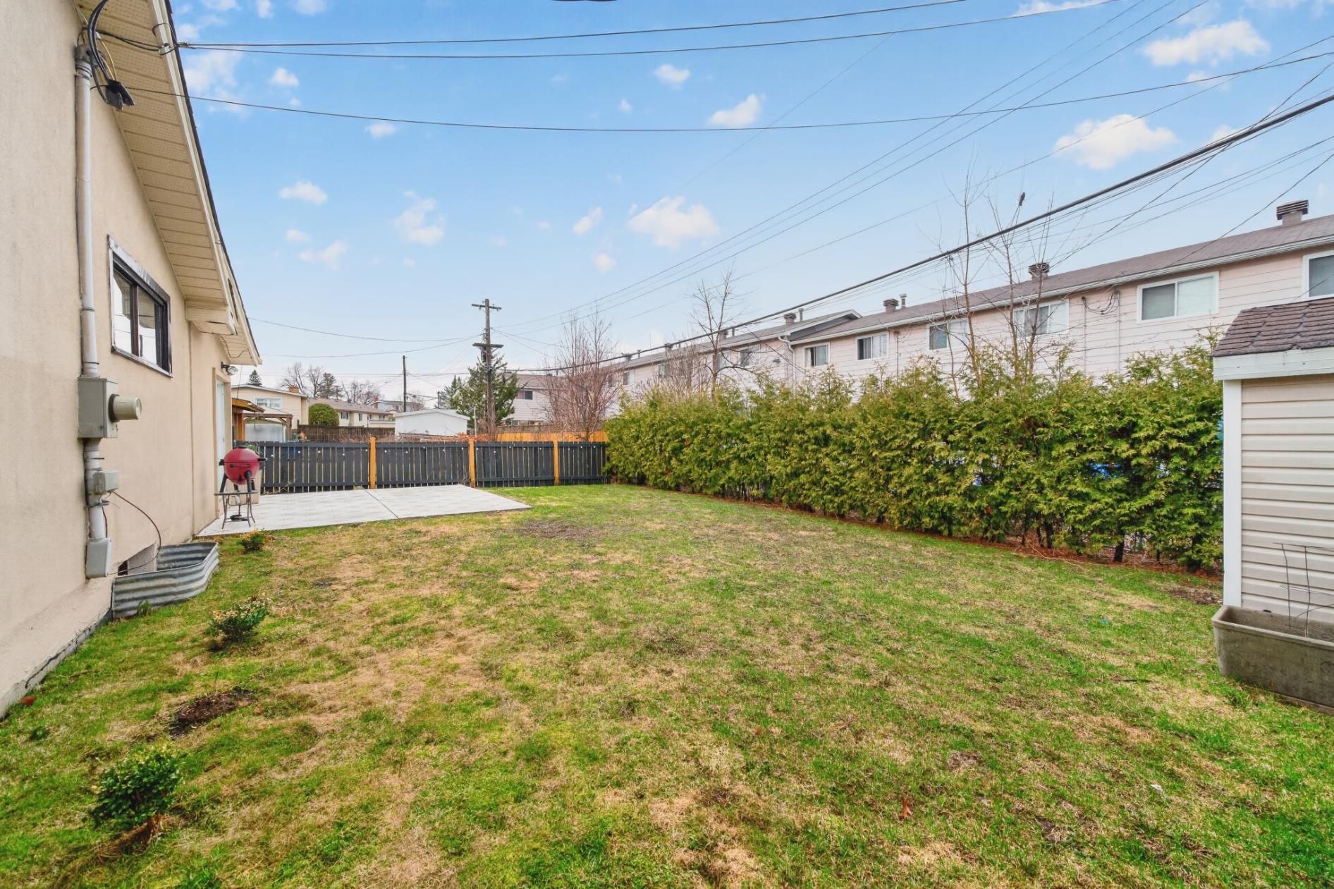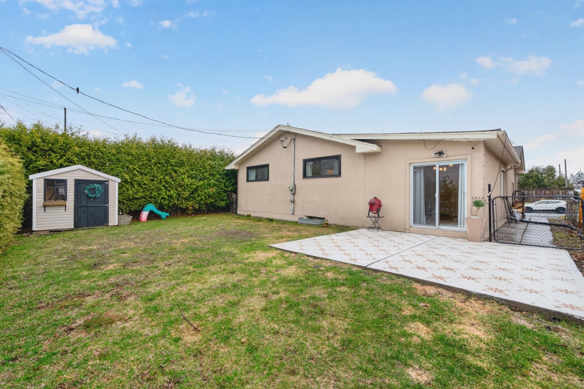 • Private backyard with patio, garden shed, and cedar hedges for seclusion.