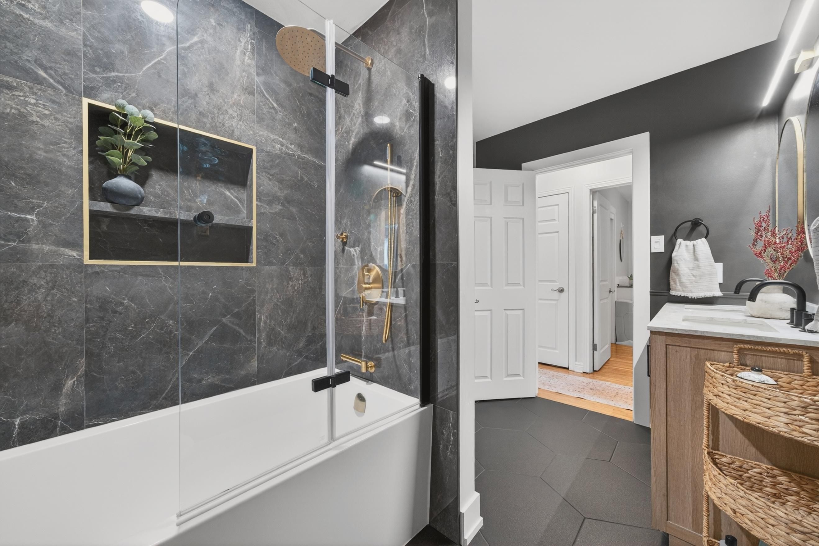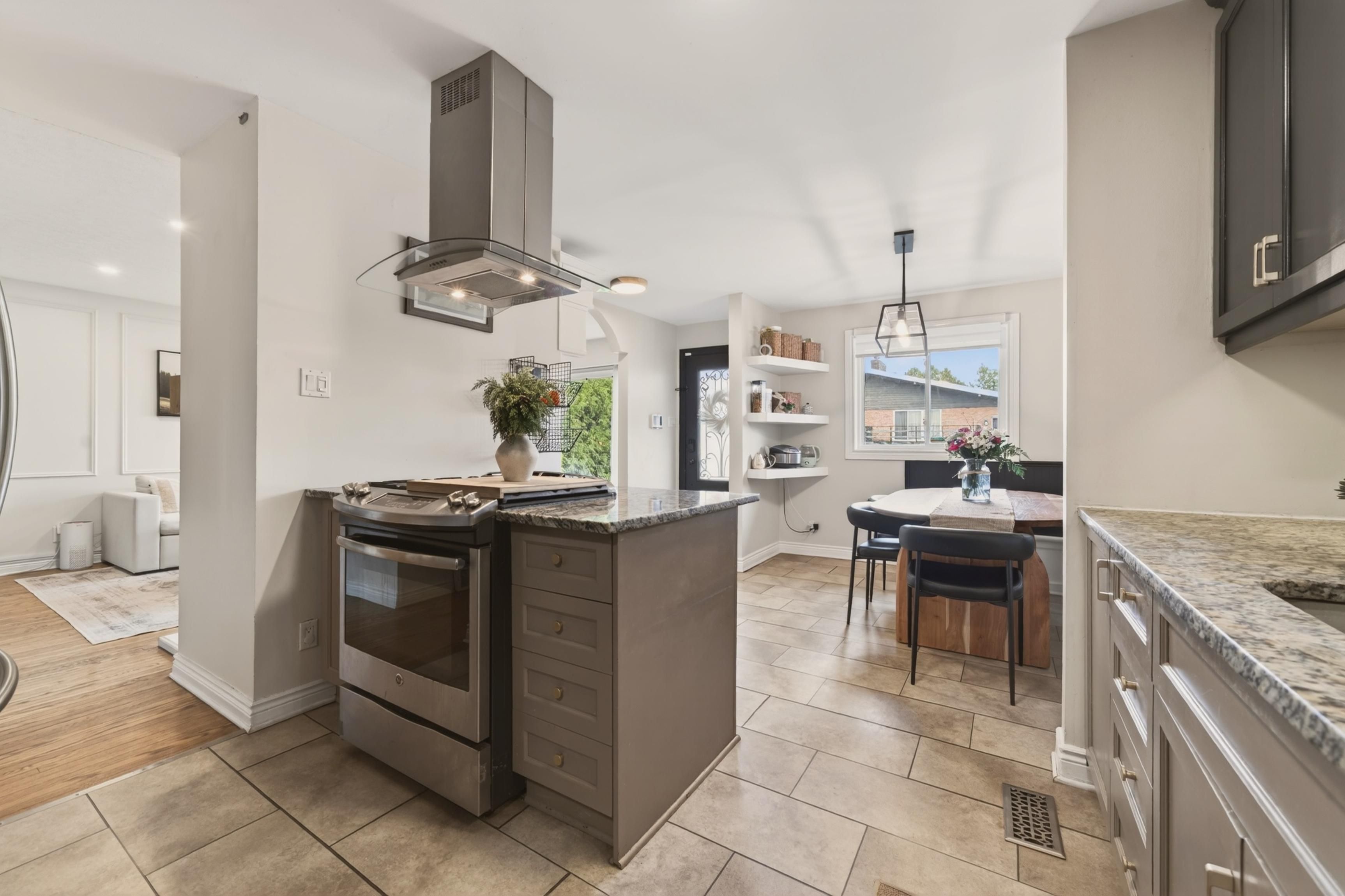 • Modern kitchen with granite counters and stainless steel appliances.