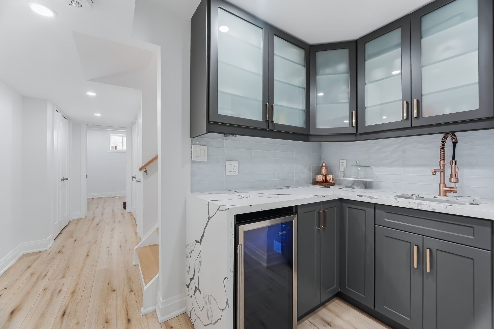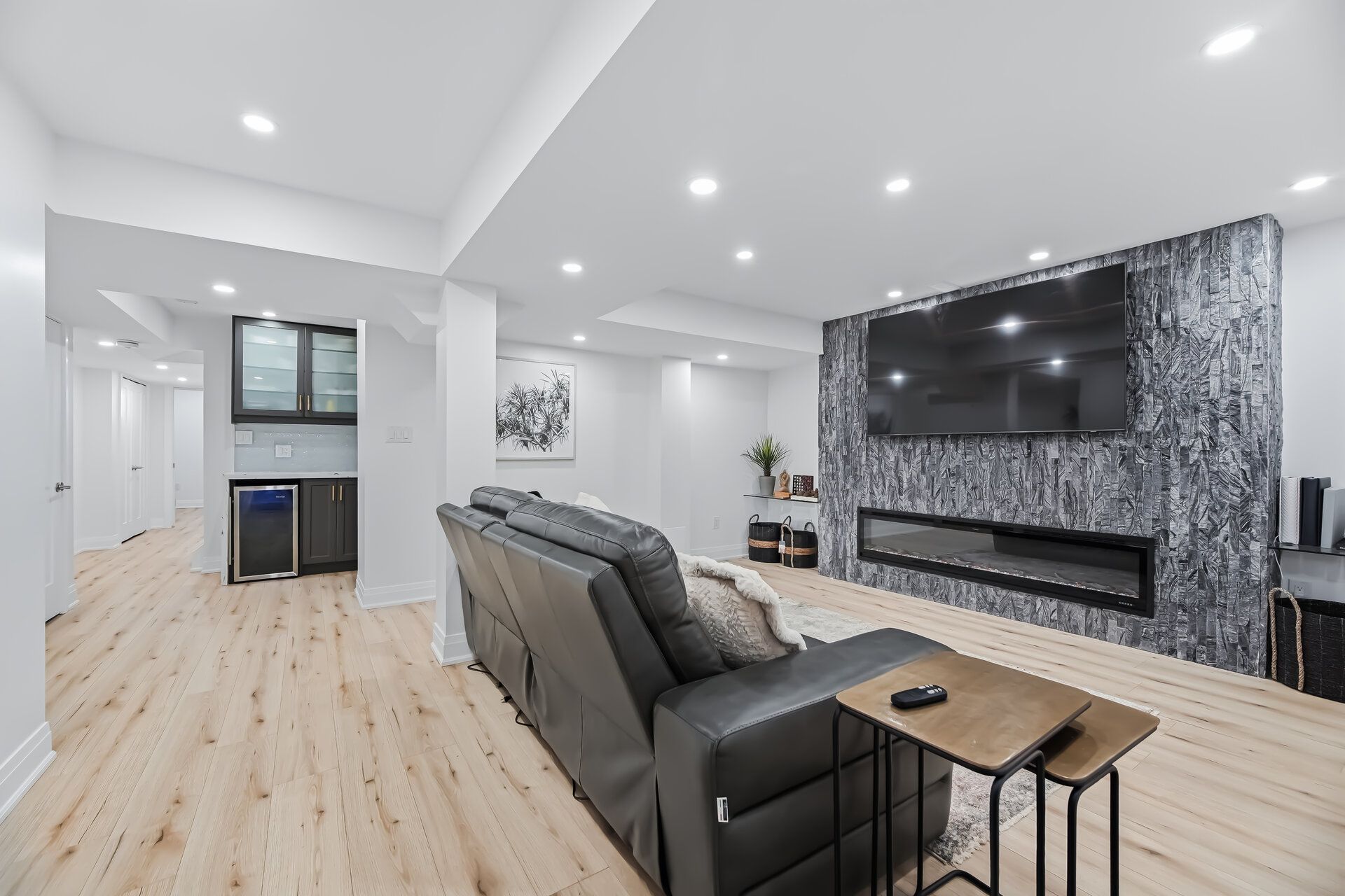 • Finished basement with recreation room, electric fireplace, and bar area.