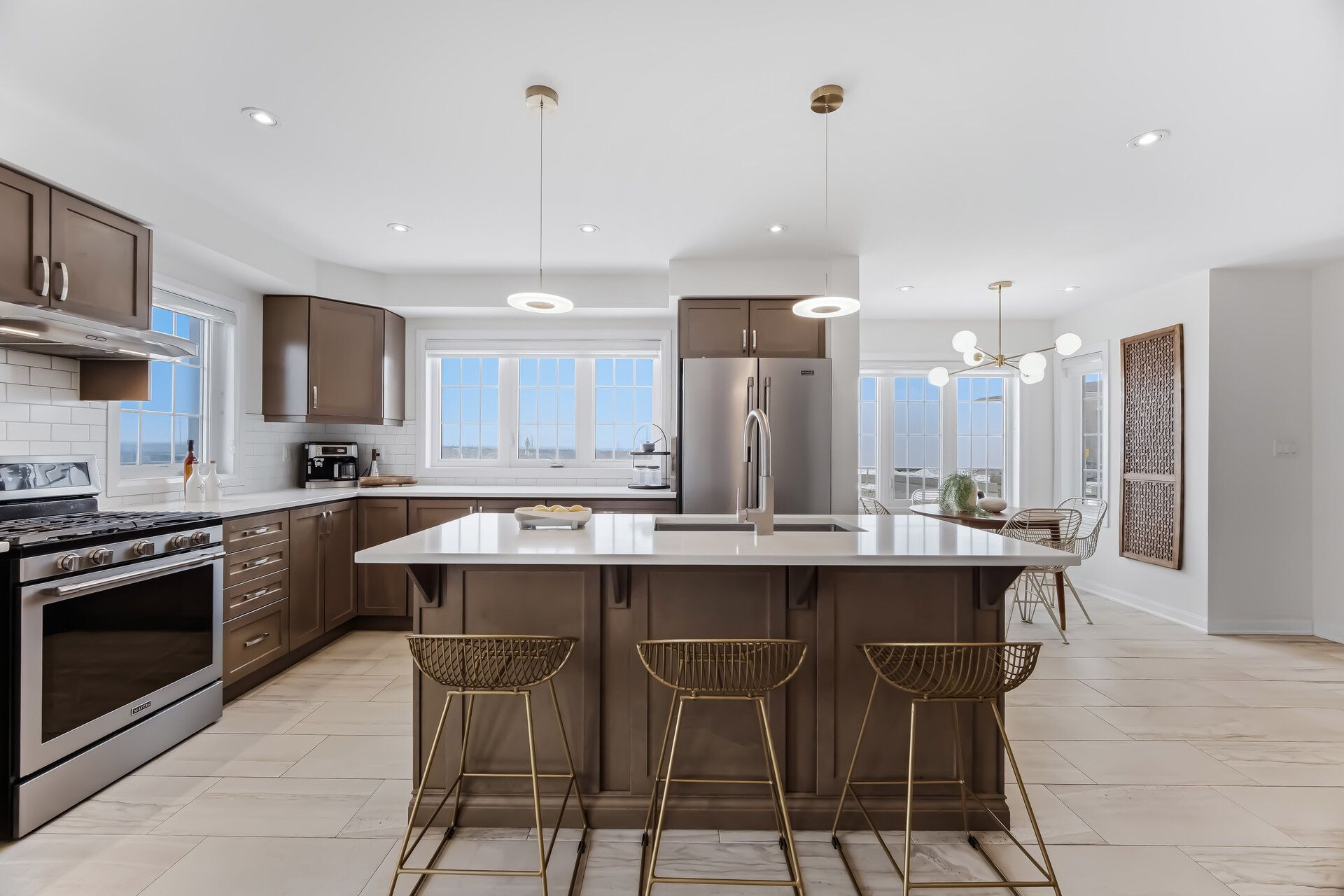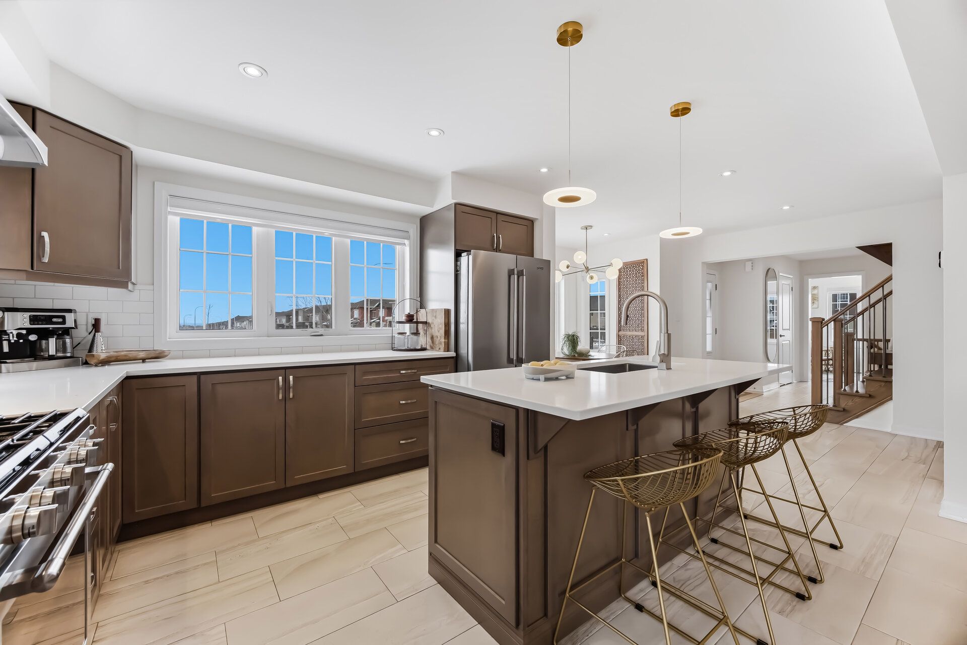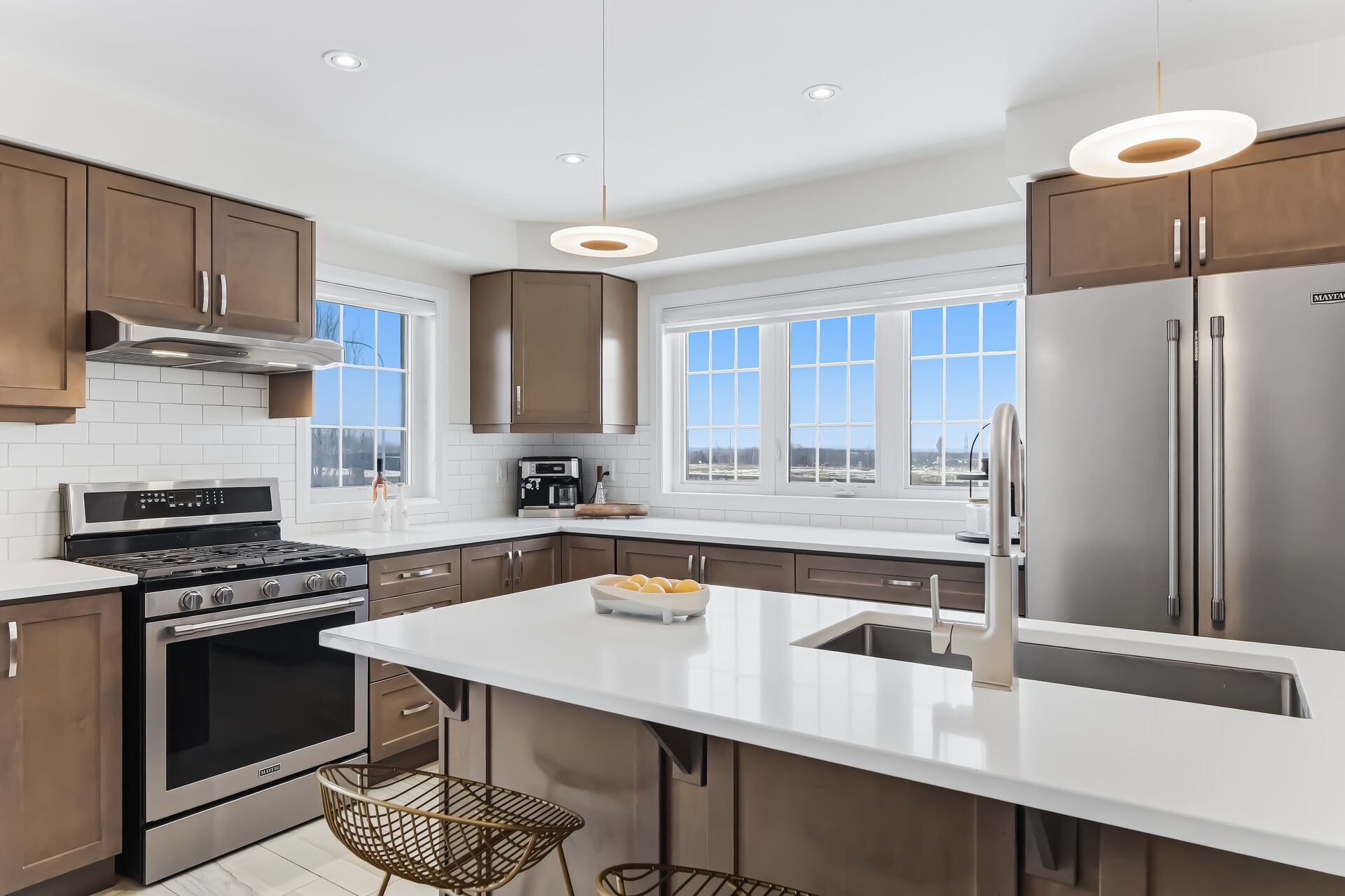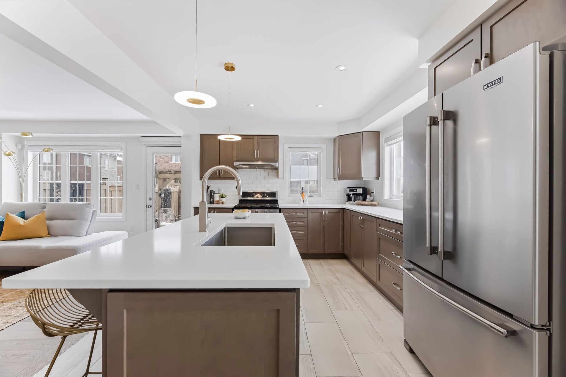 • Stylish kitchen featuring quartz counters, backsplash, and center island.