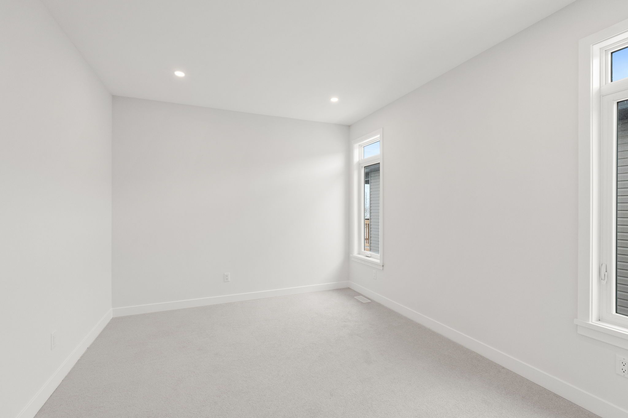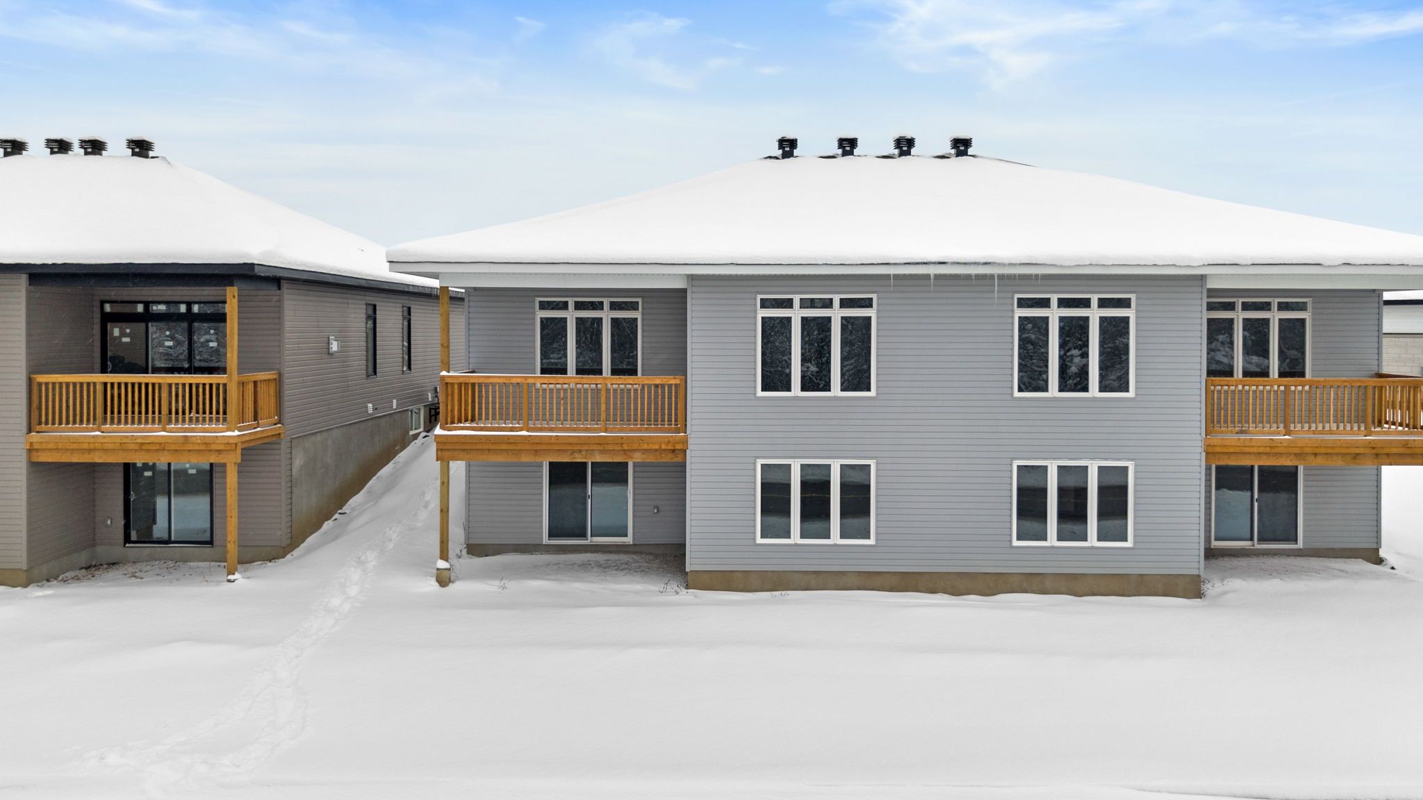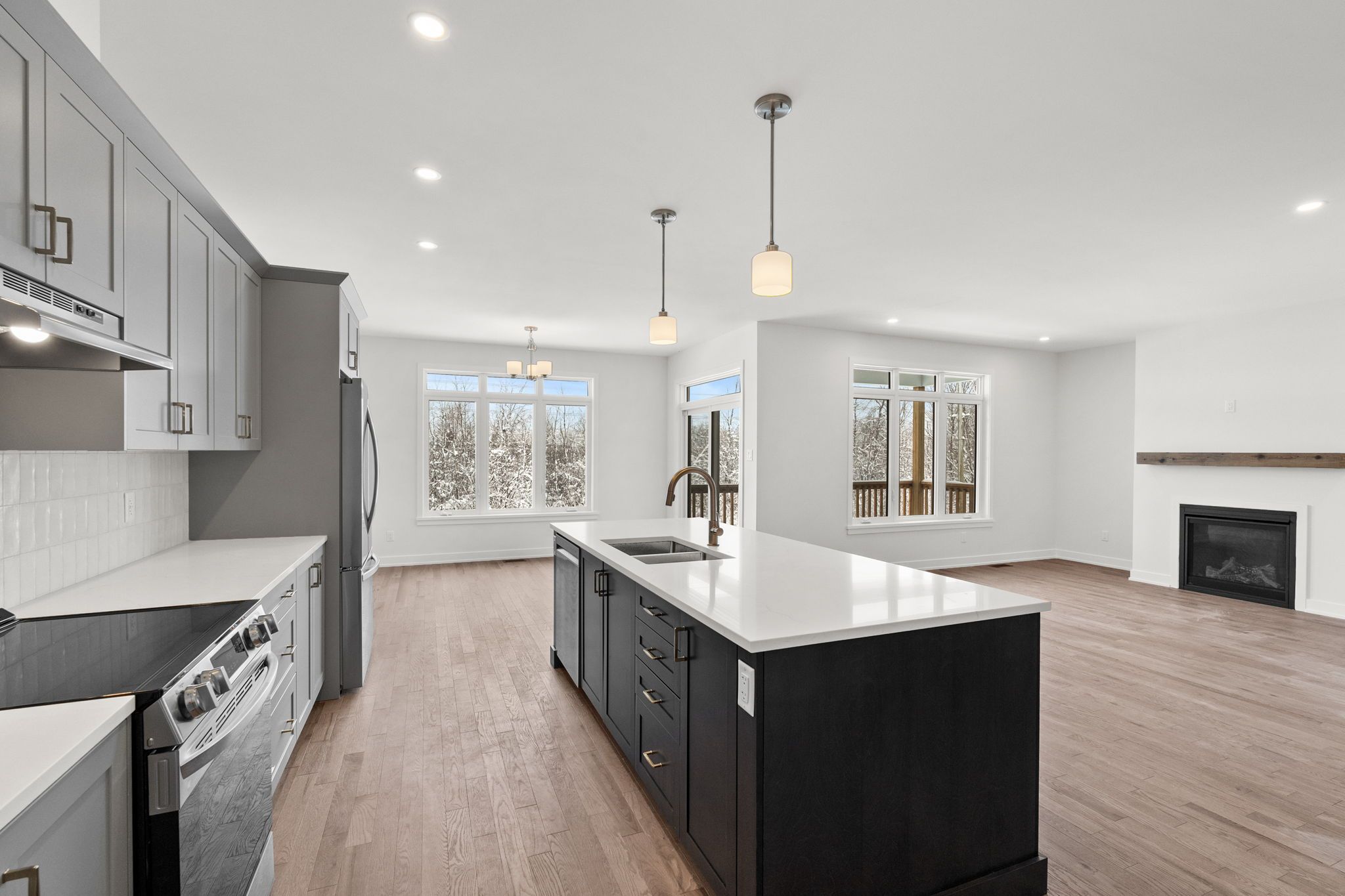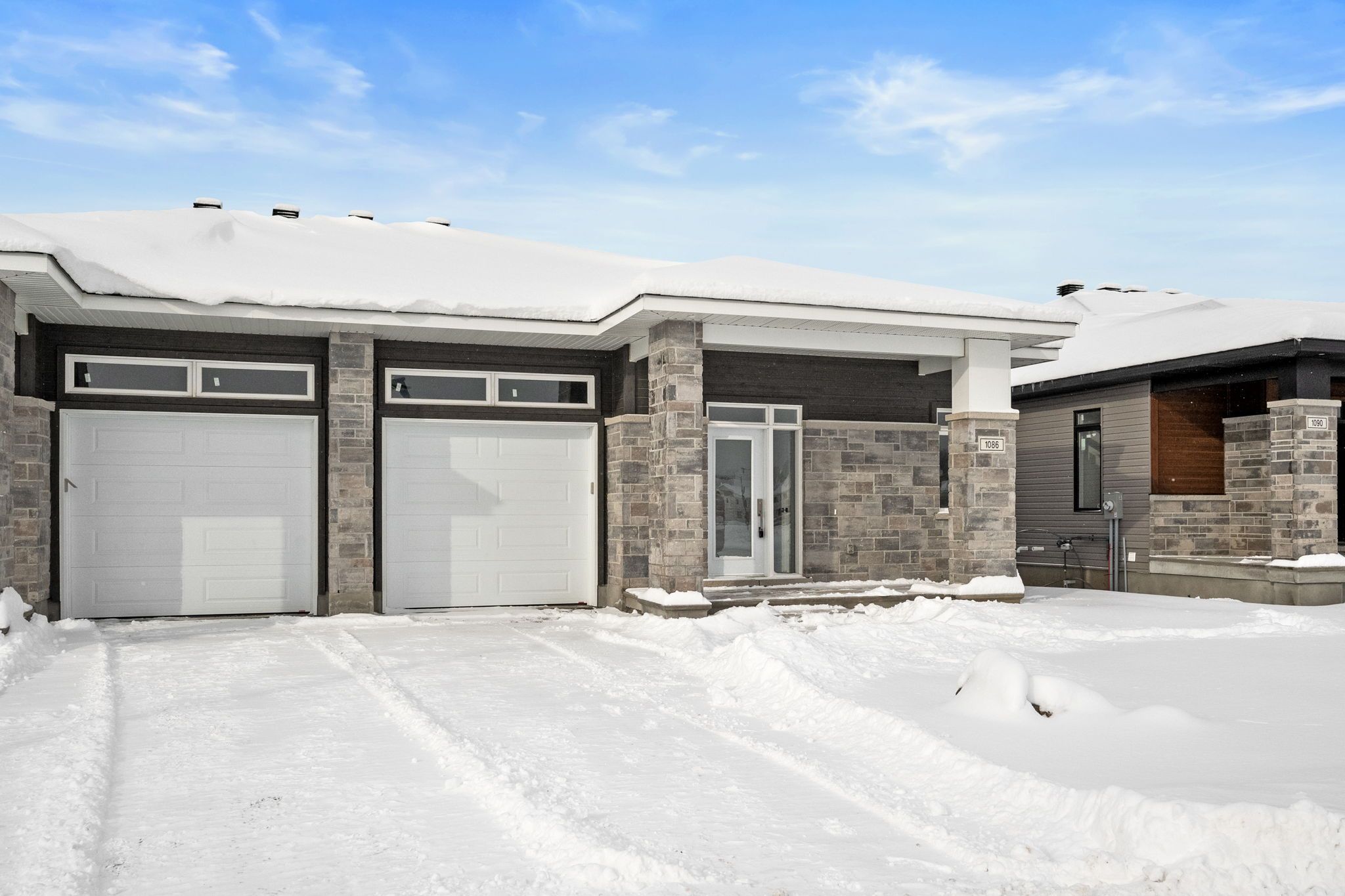 Located in brockville's stirling meadows, this newly completed semi-detached bungalow combines modern design with convenient access to highway 401 and nearby shopping, dining, and recreation. The leeds walkout model by mackie homes offers approximately 1,509 square feet of thoughtfully designed living space, featuring two bedrooms, two bathrooms, and a walkout elevation that enhances the home's appeal. The main level boasts a front-facing office nook and an open-concept living area filled with natural light from large windows and transoms. The kitchen showcases two-toned cabinetry, quartz countertops, a tile backsplash, a pantry, and a spacious centre island with an undermount sink, flowing seamlessly into the living room with fireplace and the dining area with access to the covered porch. The primary bedroom features a walk-in closet and a three-piece ensuite. The lower level extends the living space with a finished recreation room, complete with a fireplace and patio door, providing valuable additional space and direct access to the outdoors.