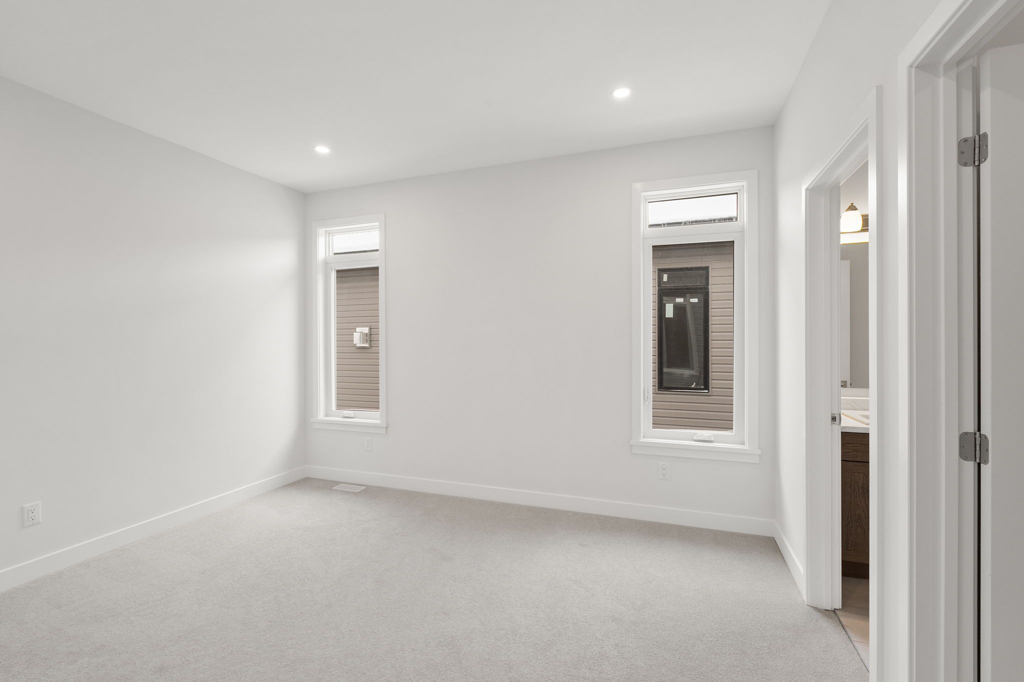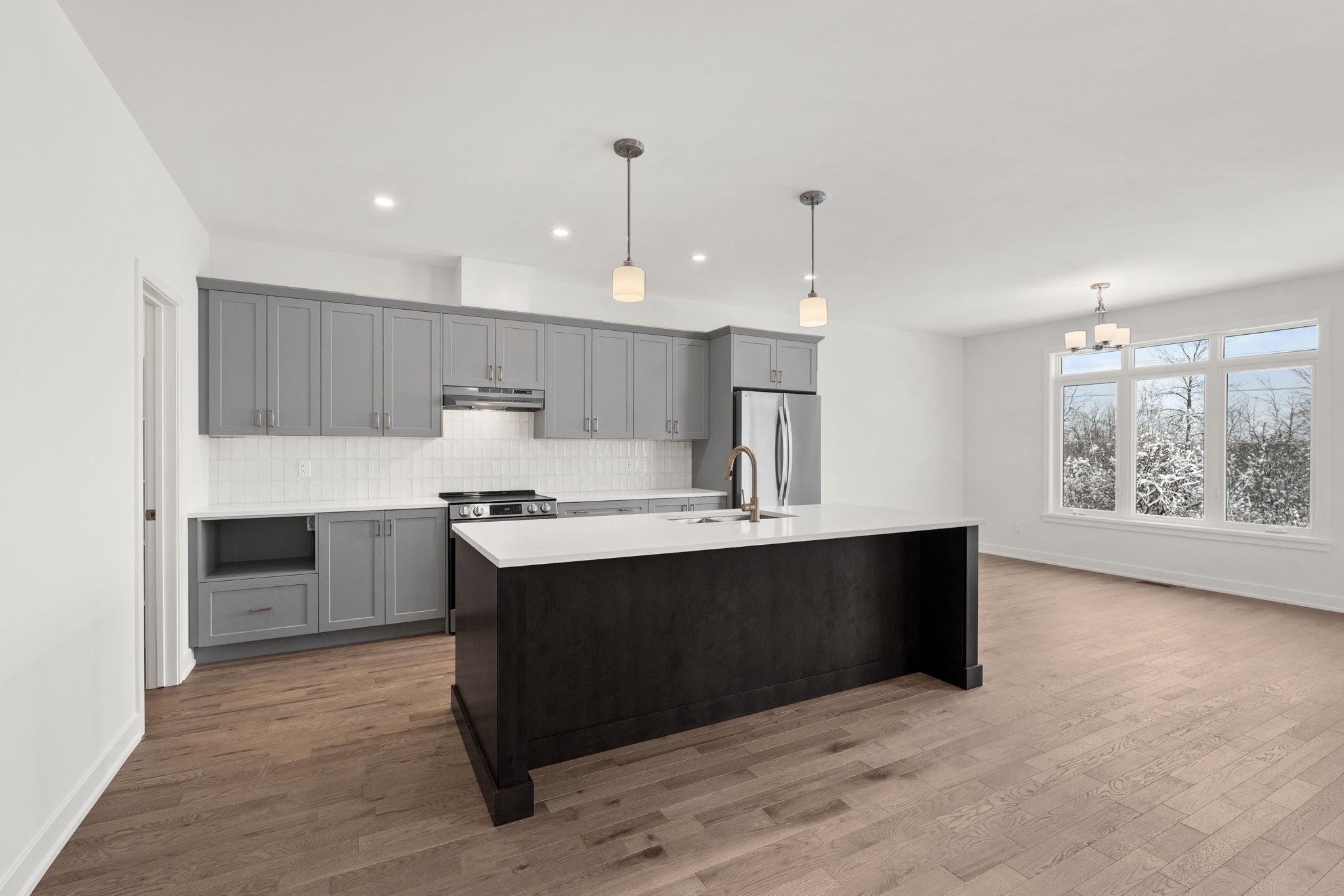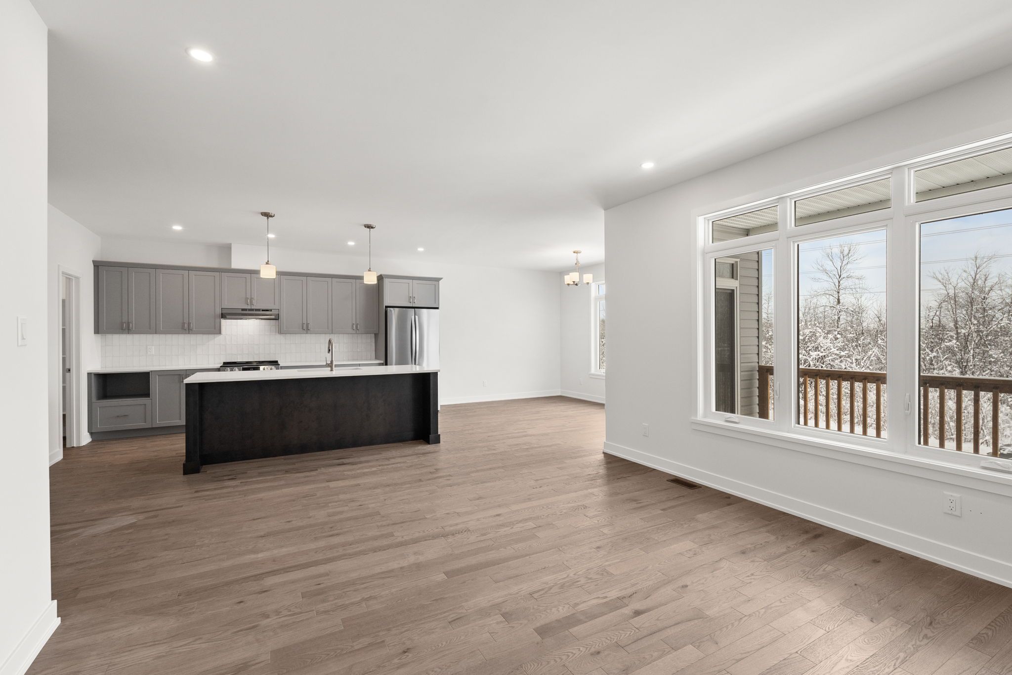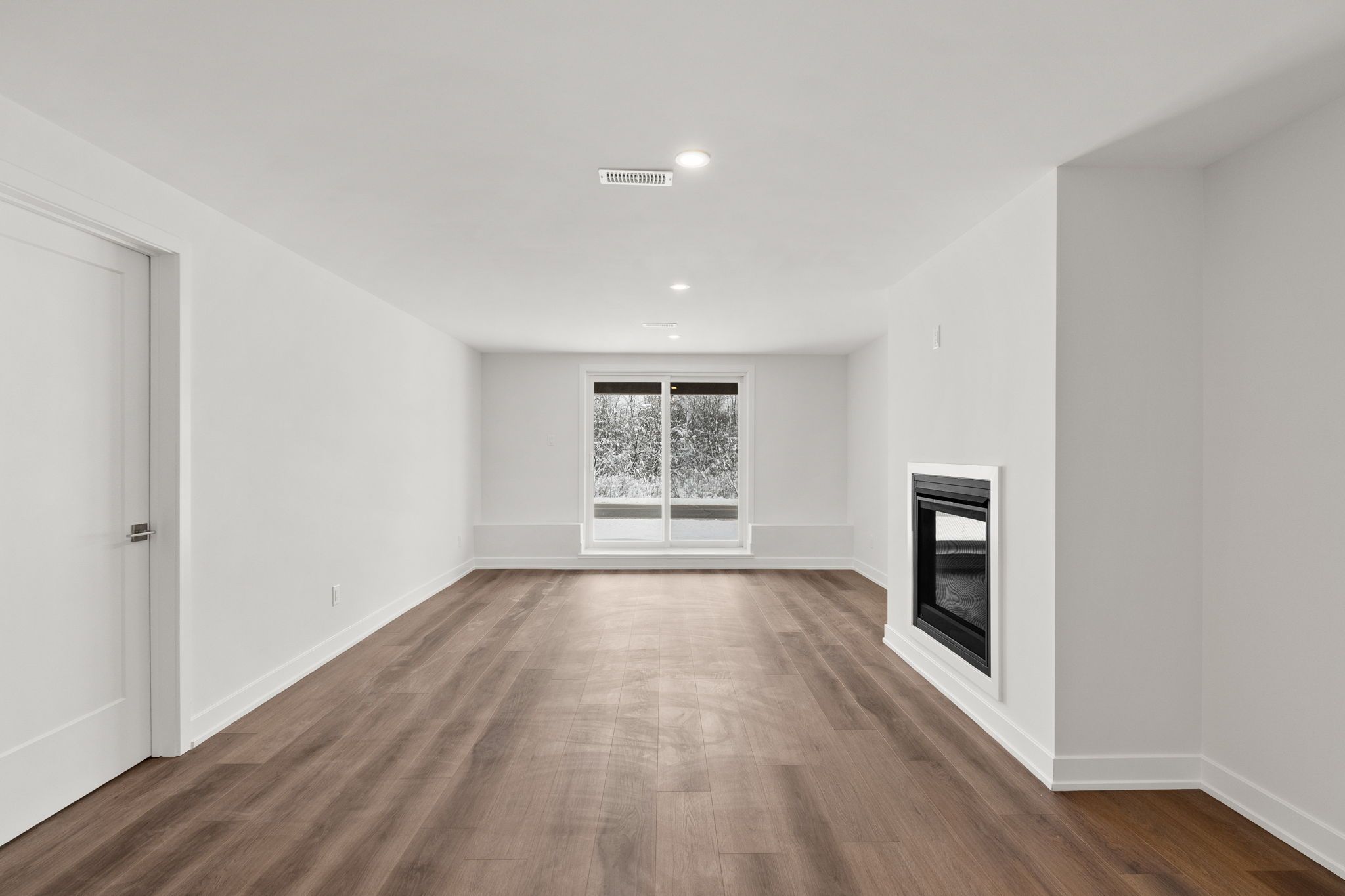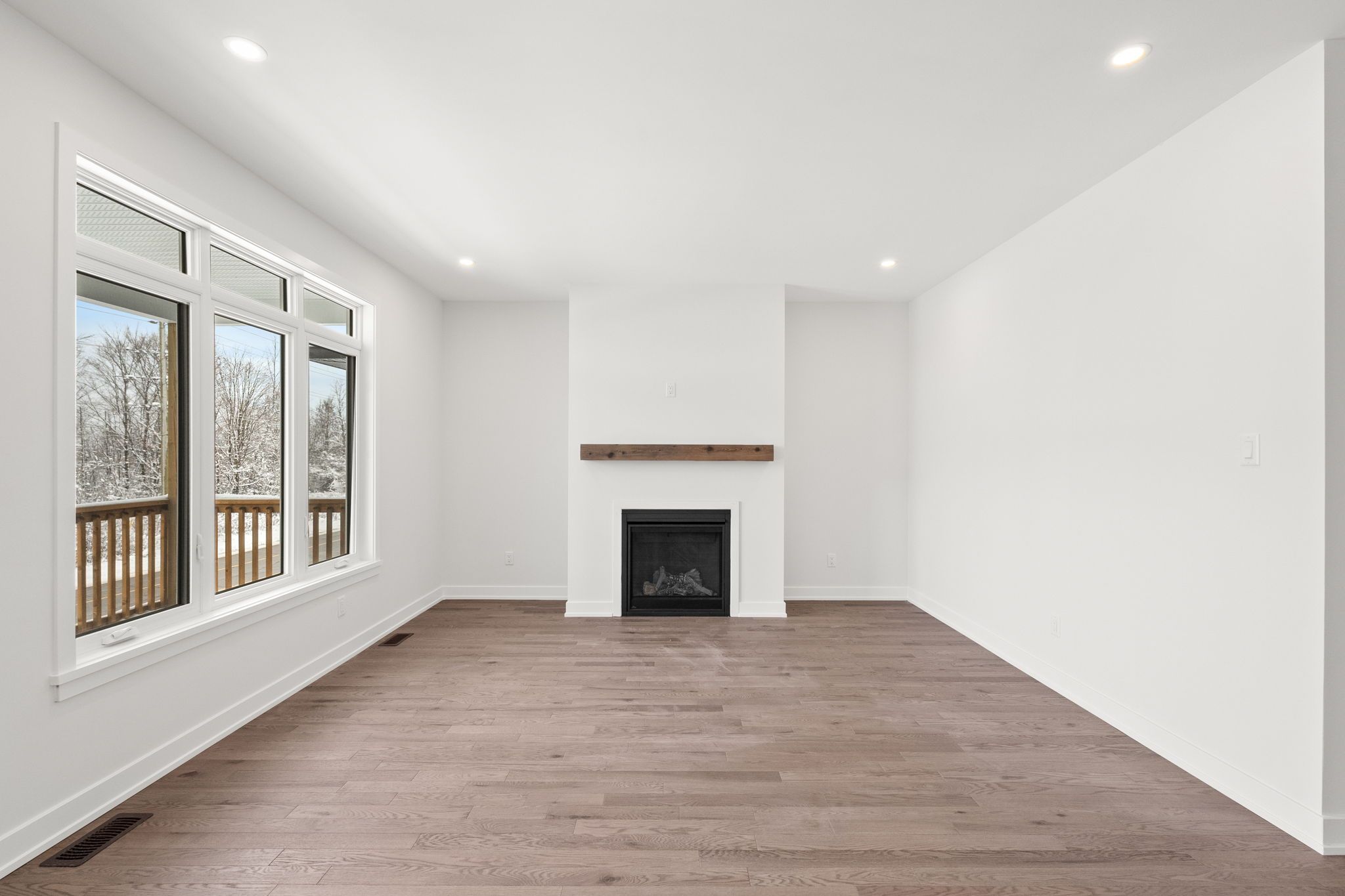 Located in brockville's stirling meadows, this newly completed semi-detached bungalow combines modern design with convenient access to highway 401 and nearby shopping, dining, and recreation. The leeds walkout model by mackie homes offers approximately 1,509 square feet of thoughtfully designed living space, featuring two bedrooms, two bathrooms, and a walkout elevation that enhances the home's appeal. The main level boasts a front-facing office nook and an open-concept living area filled with natural light from large windows and transoms. The kitchen showcases two-toned cabinetry, quartz countertops, a tile backsplash, a pantry, and a spacious centre island with an undermount sink, flowing seamlessly into the living room with fireplace and the dining area with access to the covered porch. The primary bedroom features a walk-in closet and a three-piece ensuite. The lower level extends the living space with a finished recreation room, complete with a fireplace and patio door, providing valuable additional space and direct access to the outdoors.