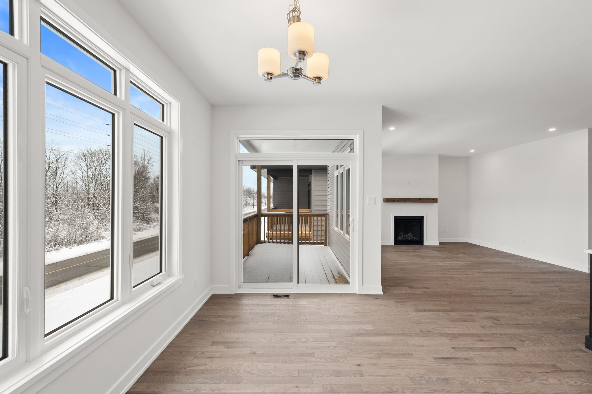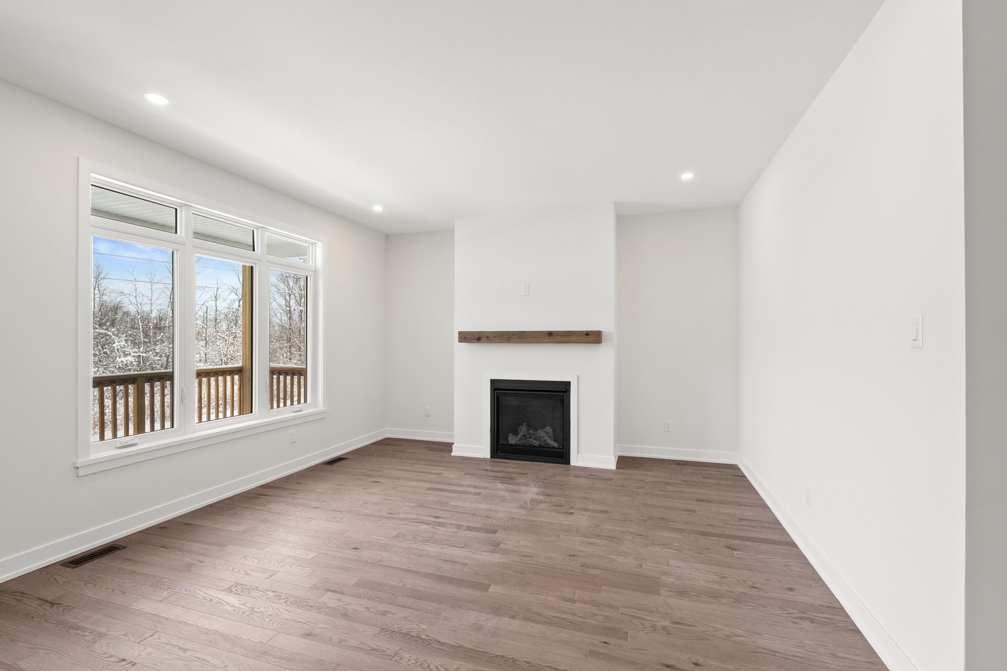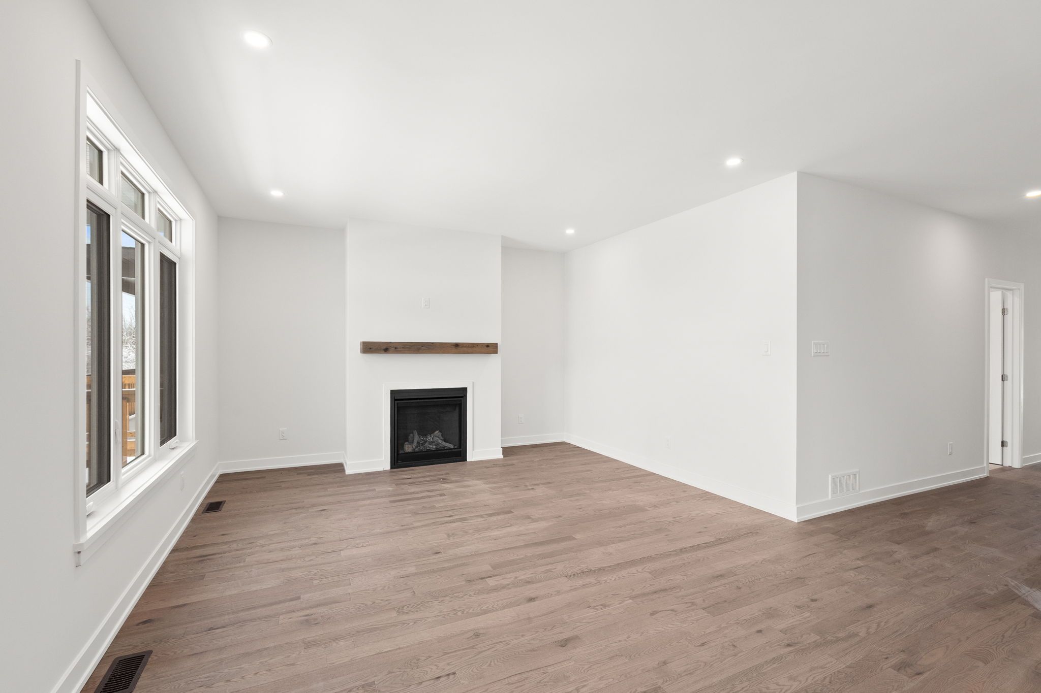• Bright open-concept living area with natural light and a cozy fireplace.