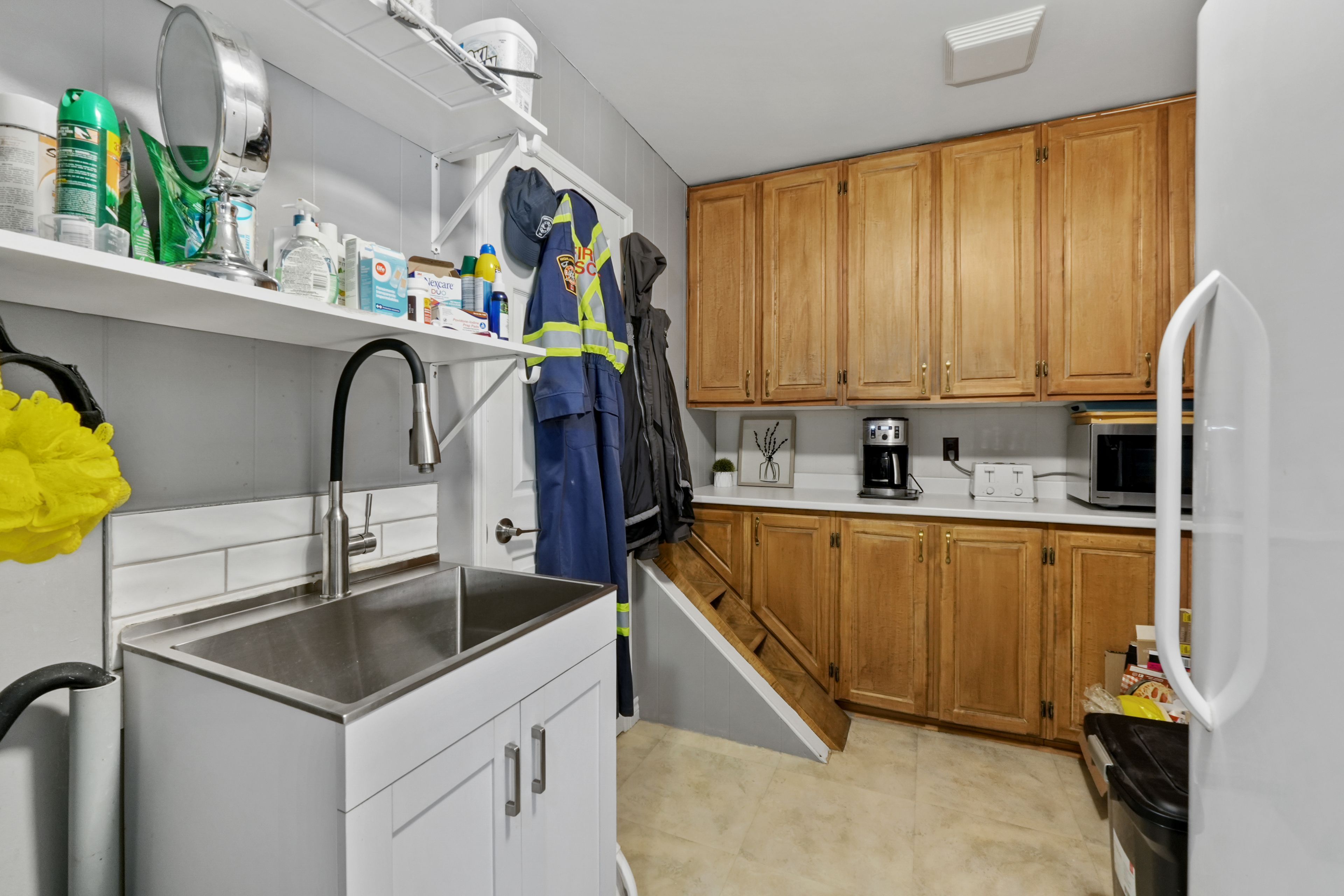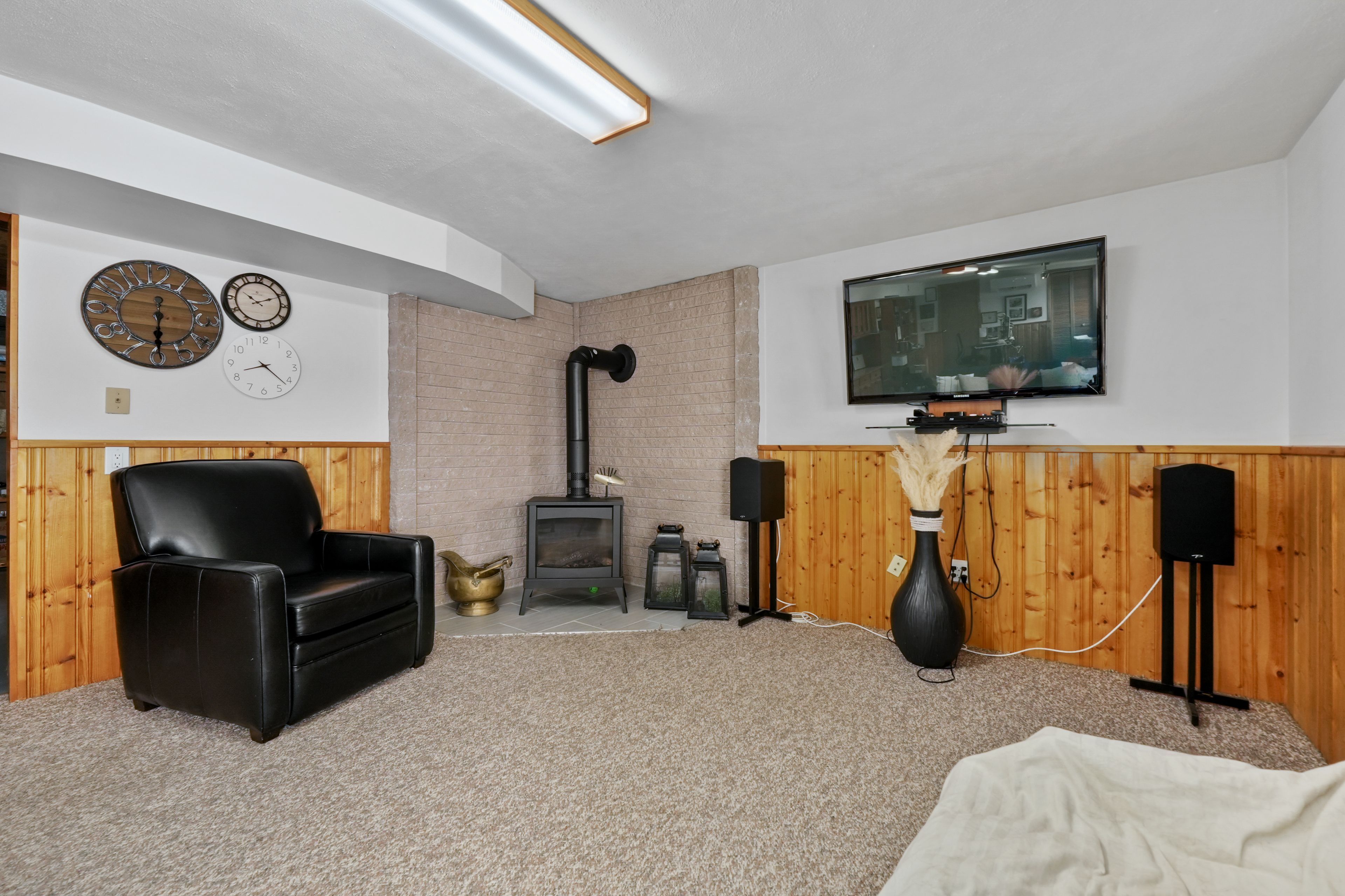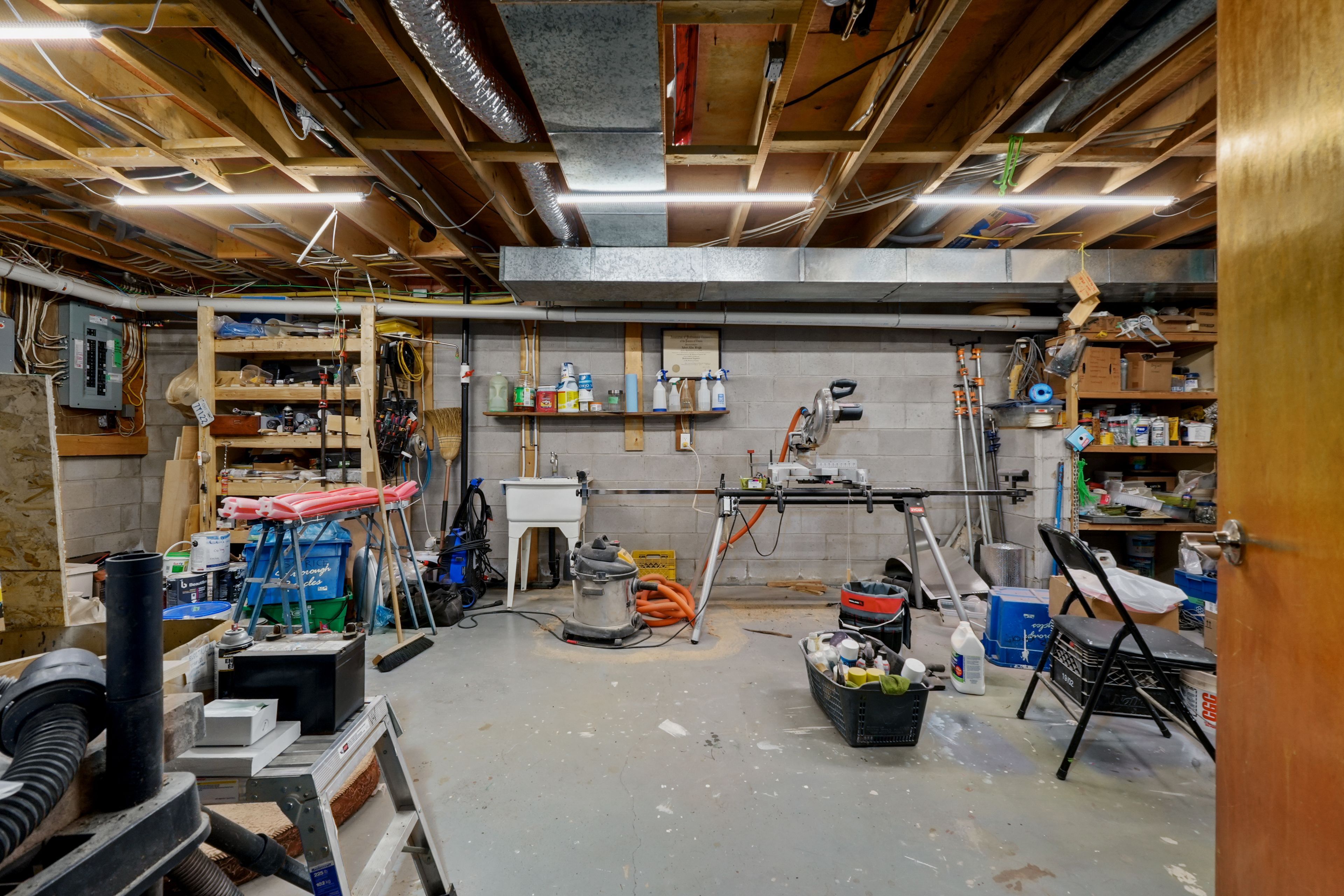 • Lower level includes workshop with cabinetry and separate propane fireplace.