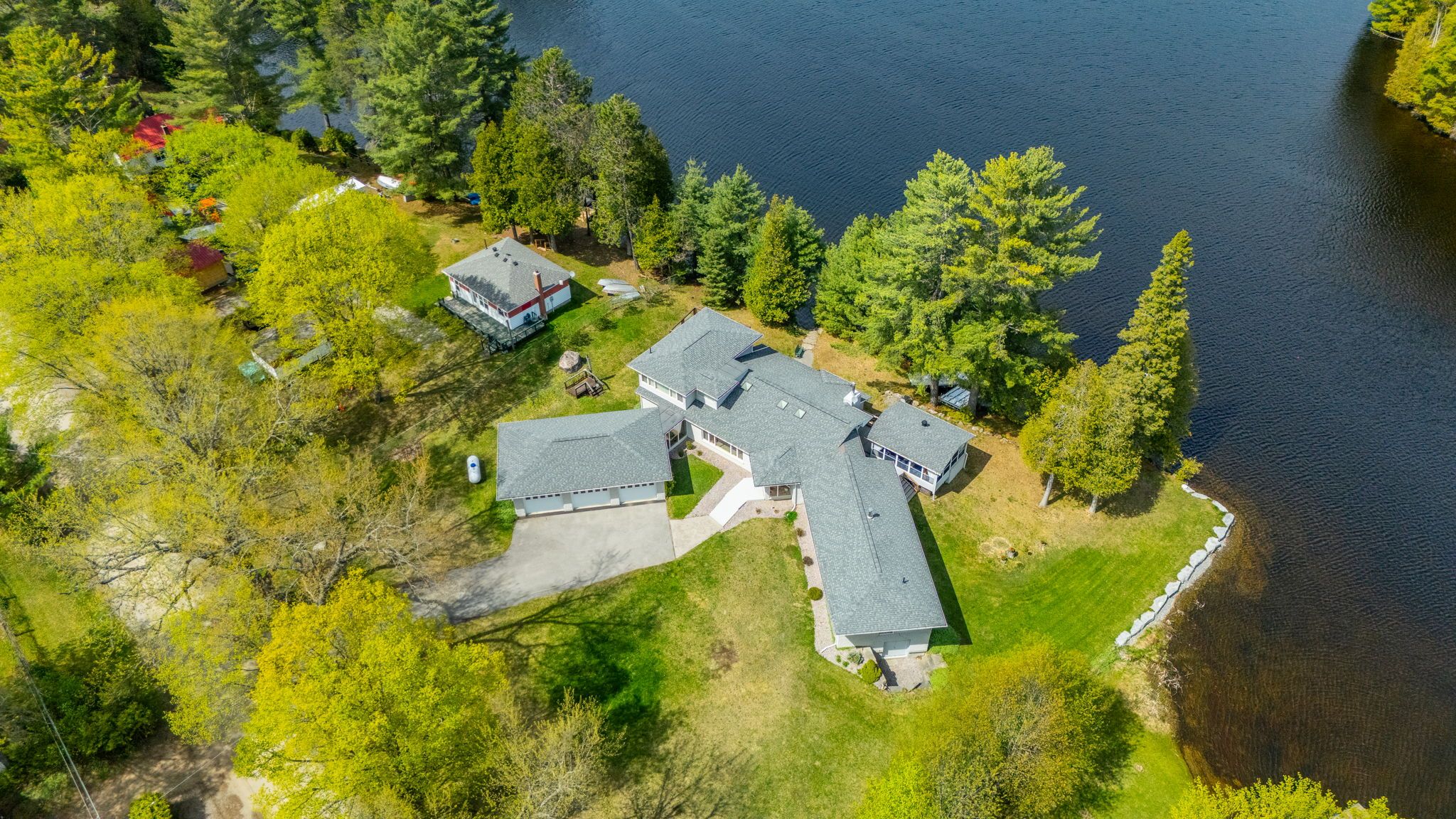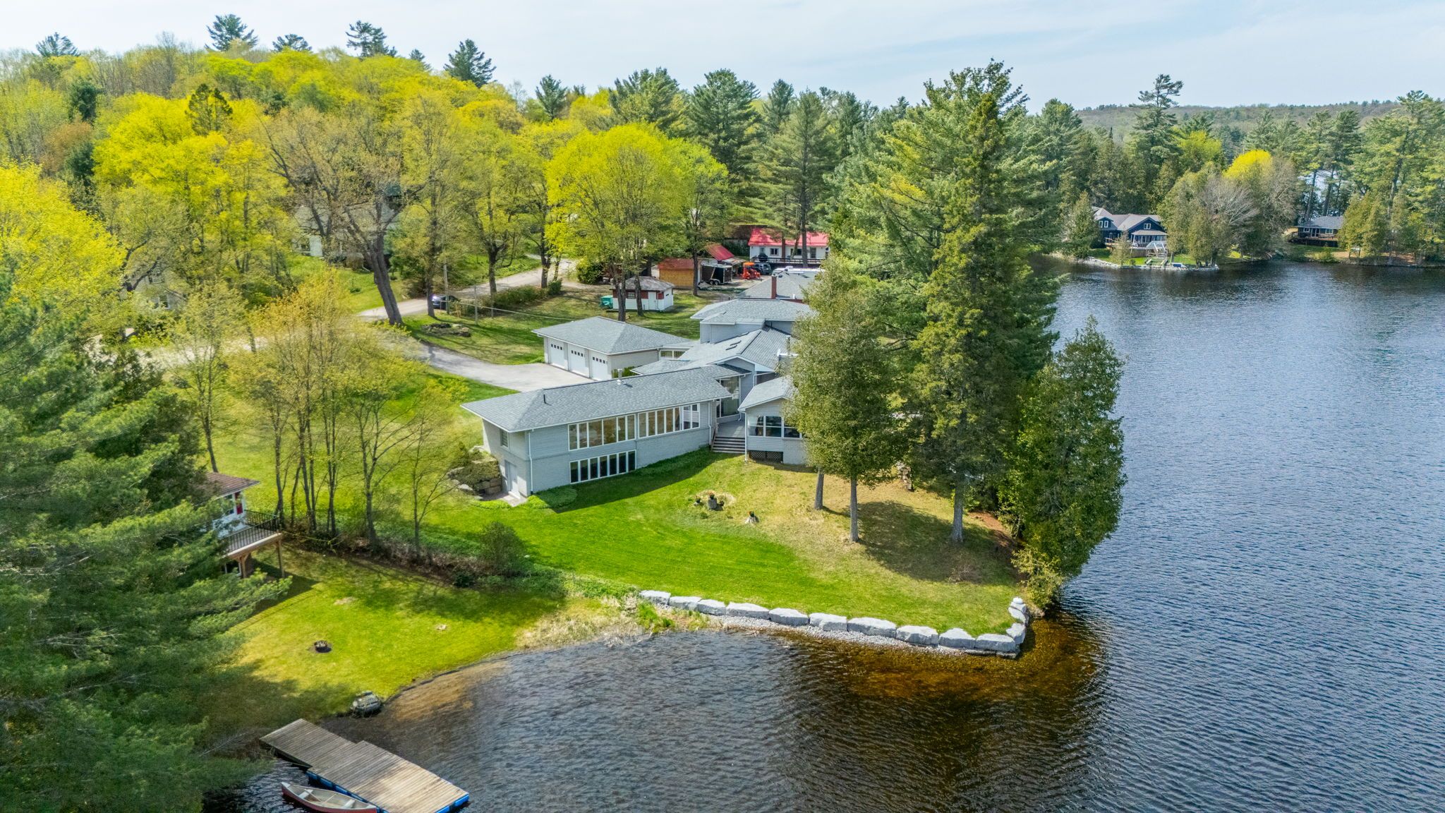 Architecturally designed, executive home on gooderham lake. Exceptionally maintained and showing pride of ownership, this gorgeous lakefront home offers over 4000sq. Ft. Of living space on a nicely landscaped, level lot. Starting at the waterfront, you'll love the beautiful sunrise views over the lake and the clean, sandy shoreline which is great for swimming. The lake also offers wonderful fishing and water sport opportunities. Just a few steps up from the water is where you'll find this spectacular home that offers something for everyone. All the interior rooms are open and spacious and many include tremendous views of the lake. From the airy living room with vaulted ceilings and a cozy fireplace, to the chef's kitchen with custom cherry cabinets and open access to the family sized dining room, you'll appreciate the attention to detail. The primary bedroom comes with his and hers walk-in closets and a masterful ensuite. Two other generously sized bedrooms are also on the main floor. One set of accessible stairs takes you up to a large space that is perfect as a family room or office with a walk-out to a lovely deck area. The other set takes you to the lower level where you'll find a media room, guest room and two workshops, one of which is sized at 43'x20' with heated floors, a 9' ceiling and a 16' window wall overlooking the lake! Whether you're a weekend hobbyist, a professional contractor or someone looking to start a home based business, this space is perfect. And don't overlook the massive screened-in haliburton room which expands your outdoor enjoyment. There are so many features to this one of a kind home including geothermal heating/cooling, auxiliary propane boiler heating system, drilled well with top-tier filtration/uv system, a 5-camera security system, and a 3-car insulated garage with enclosed walkway to the house, all located within walking distance to gooderham. Priced substantially lower than replacement value. Must be seen to be appreciated!