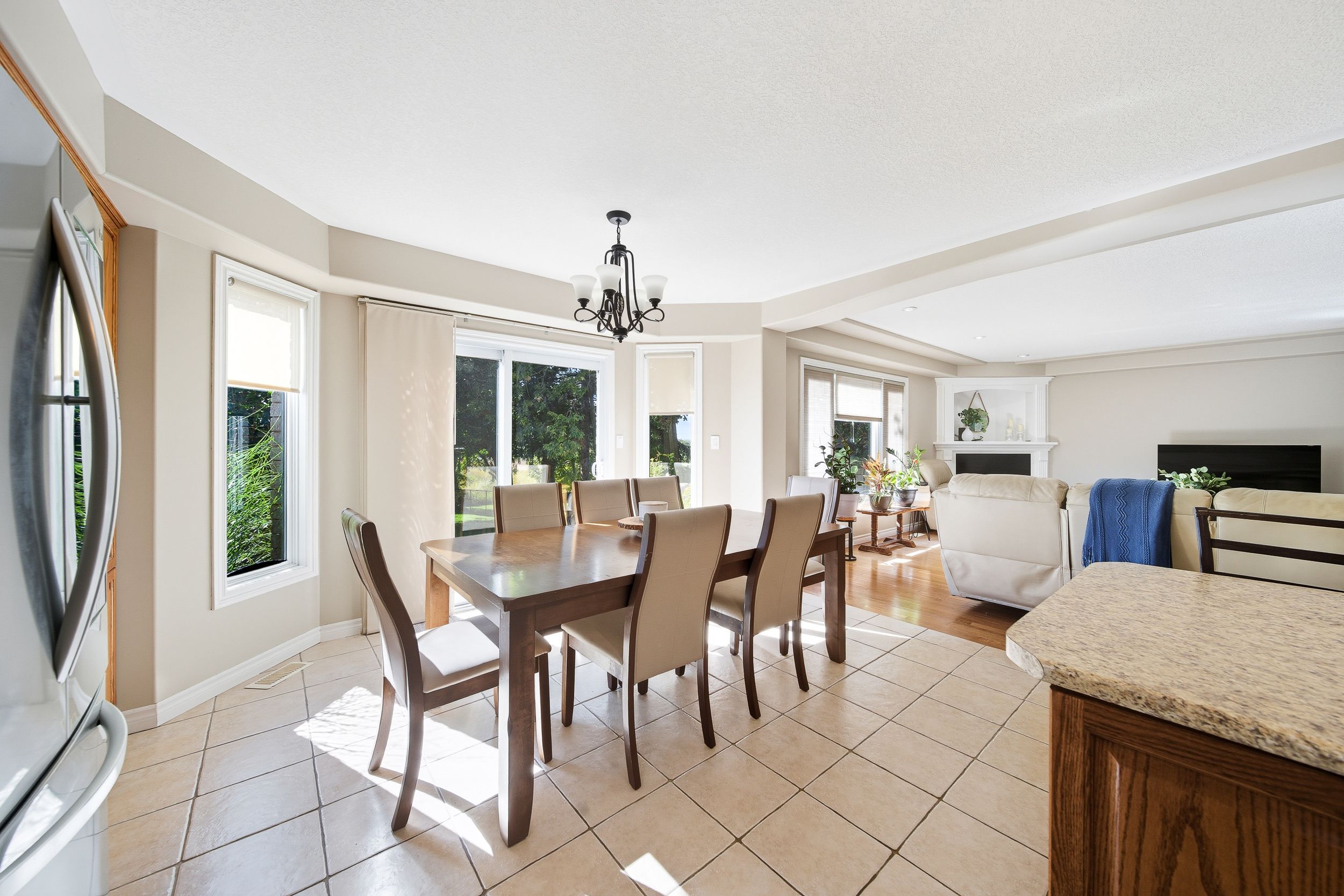 • Open-concept family room with gas fireplace connected to a well-equipped kitchen.