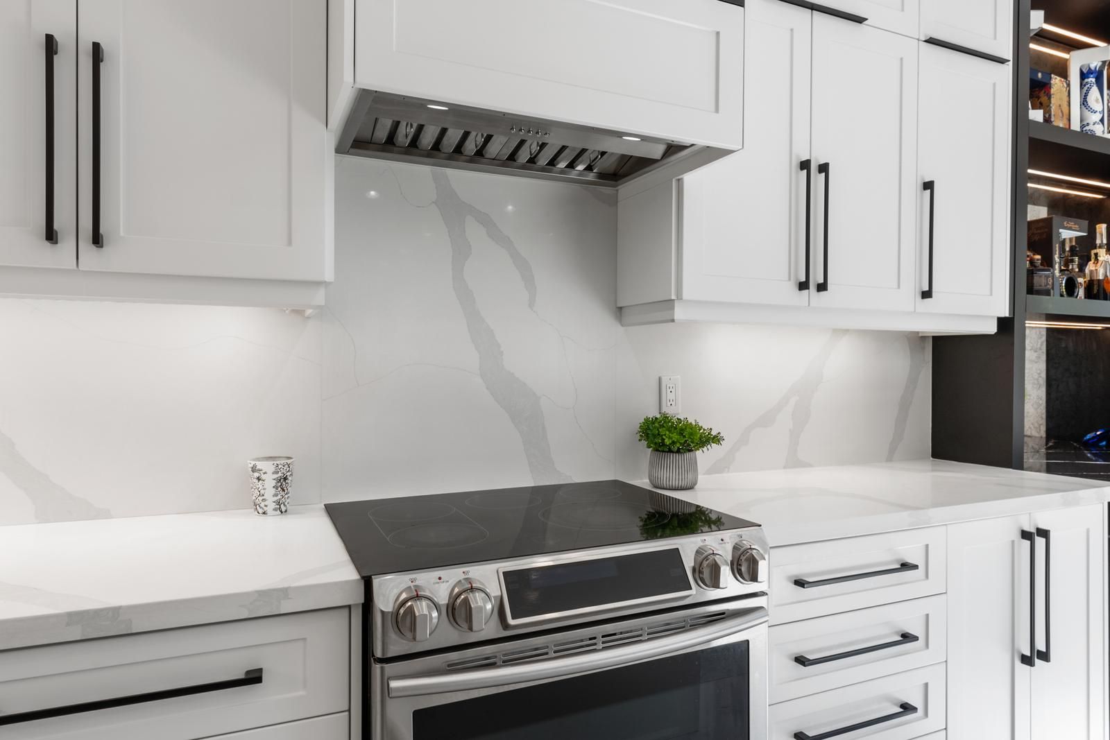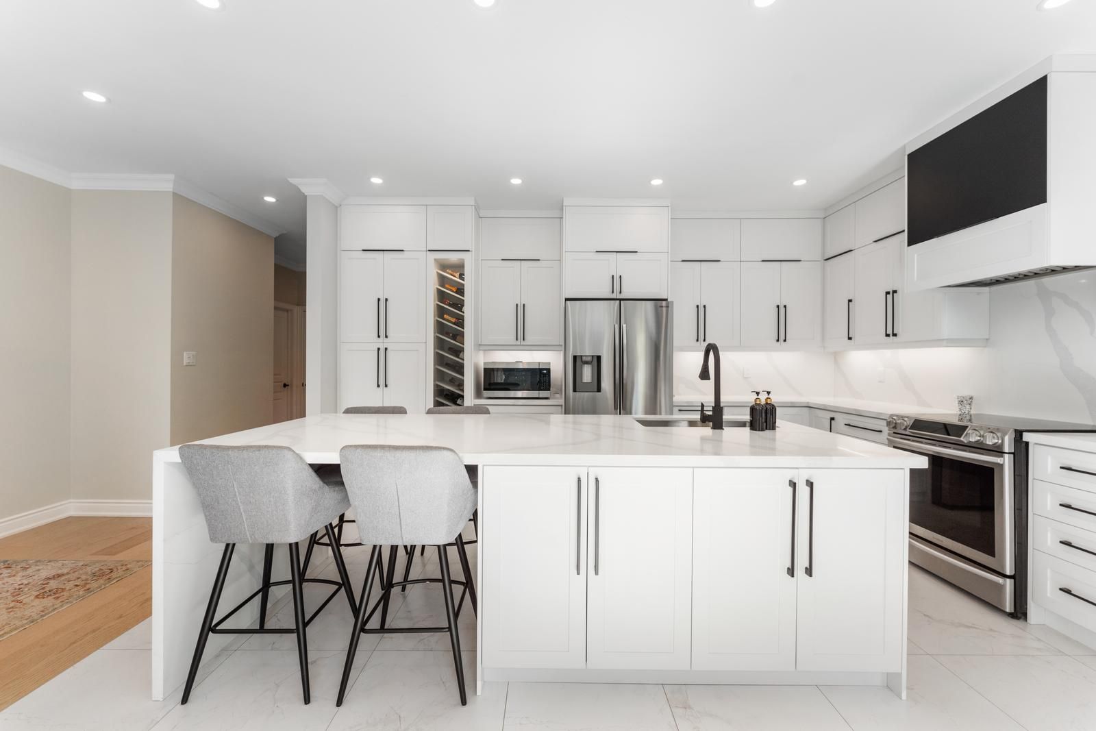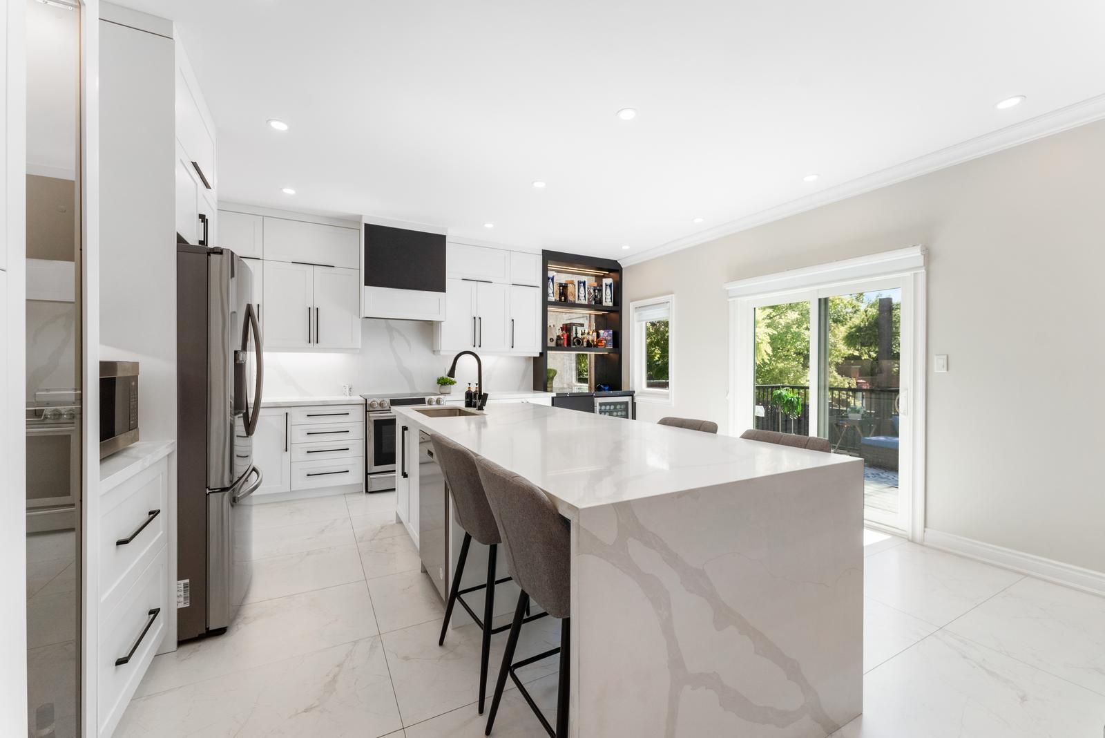 • Modern kitchen with stainless steel appliances and large island.