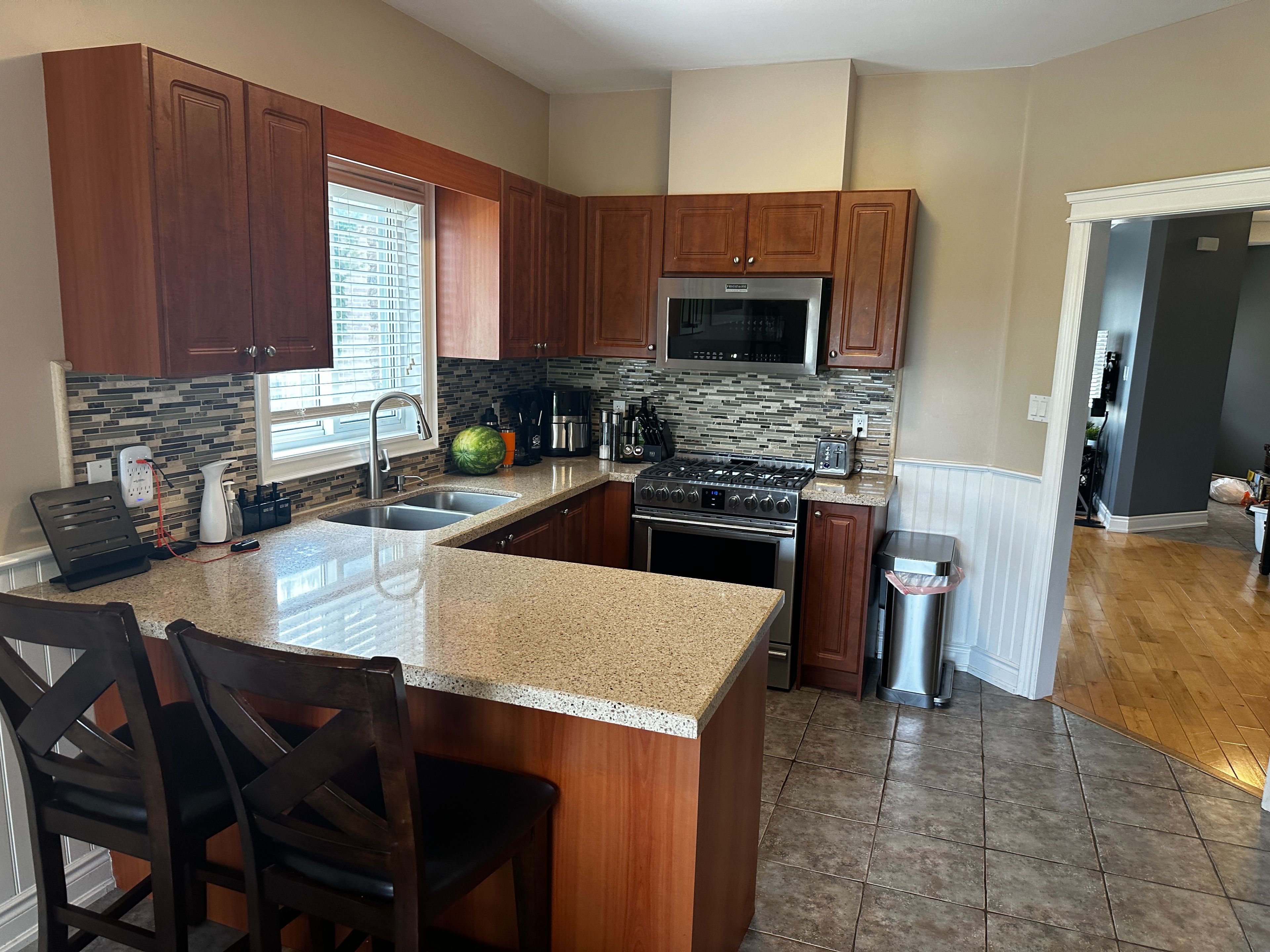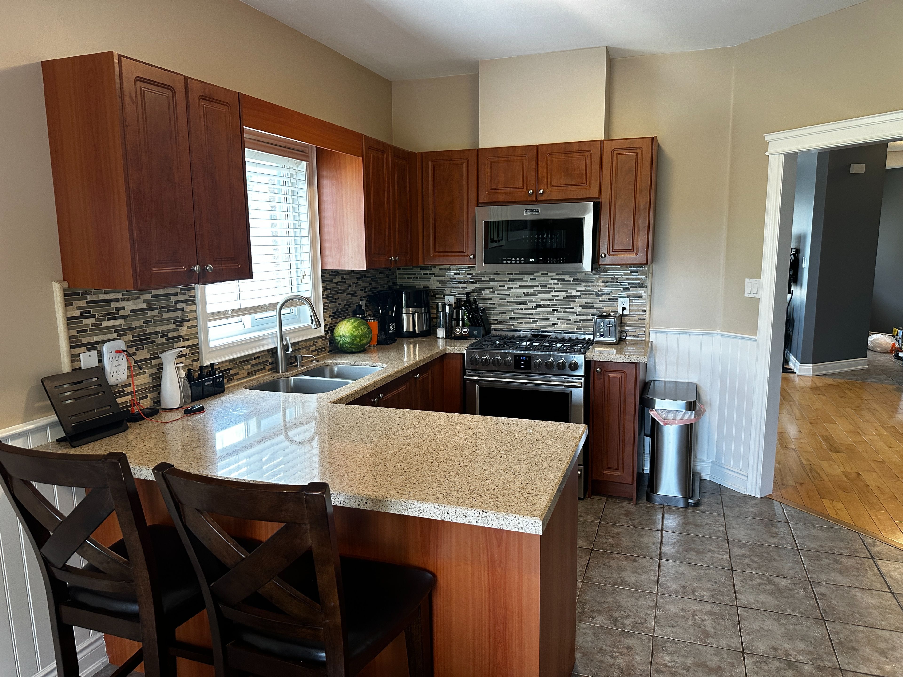 • Modern kitchen with stainless steel appliances and quartz countertops.