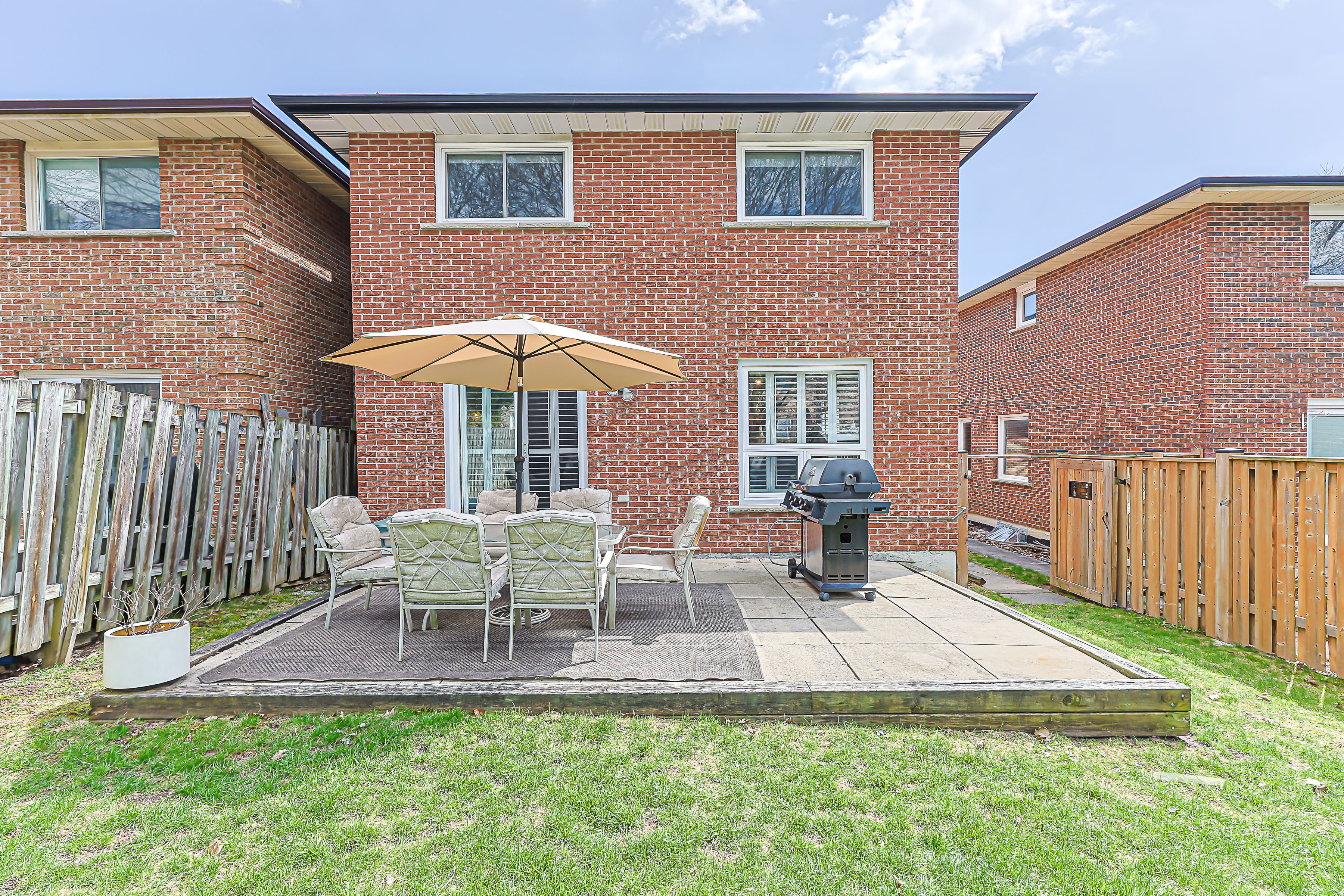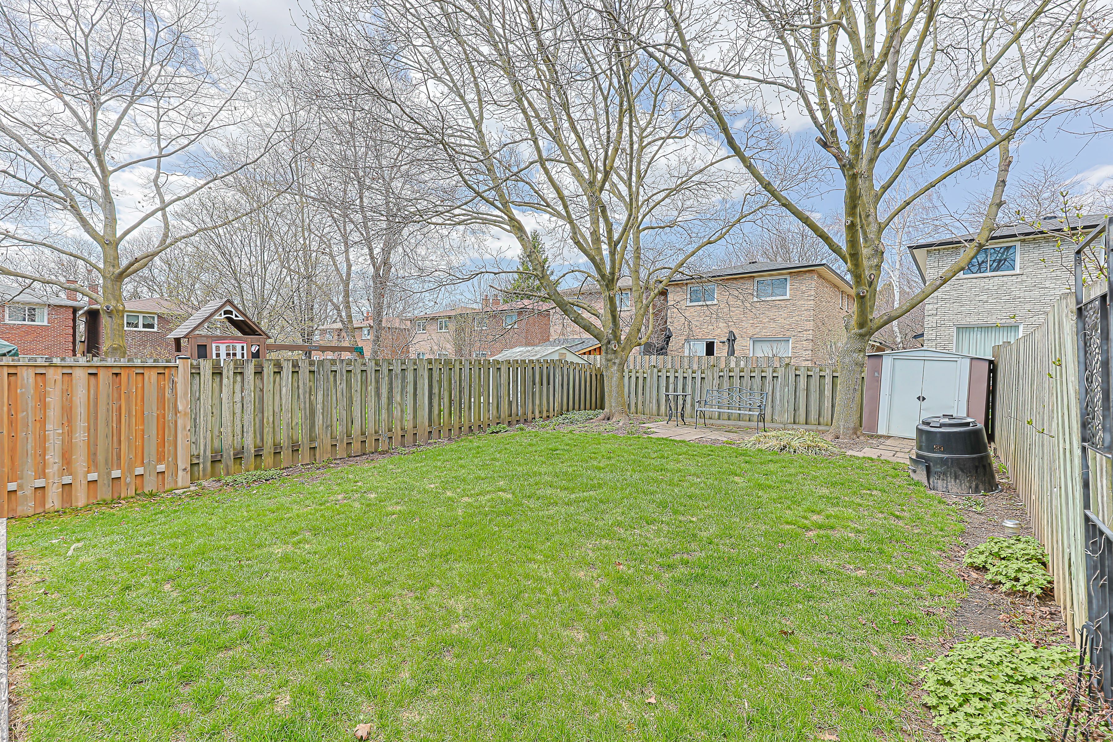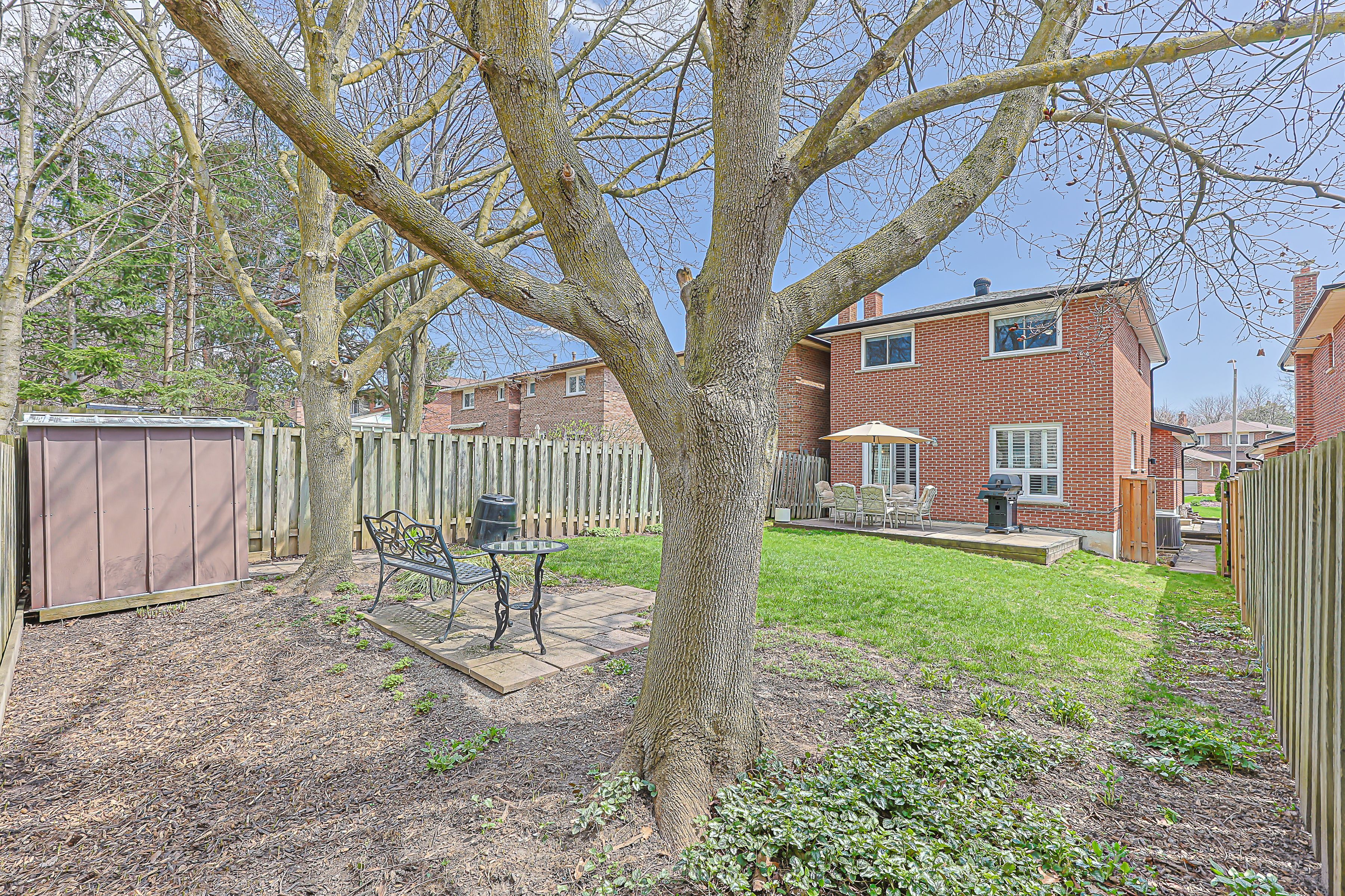 • Fully fenced backyard with mature trees, perfect for family gatherings.