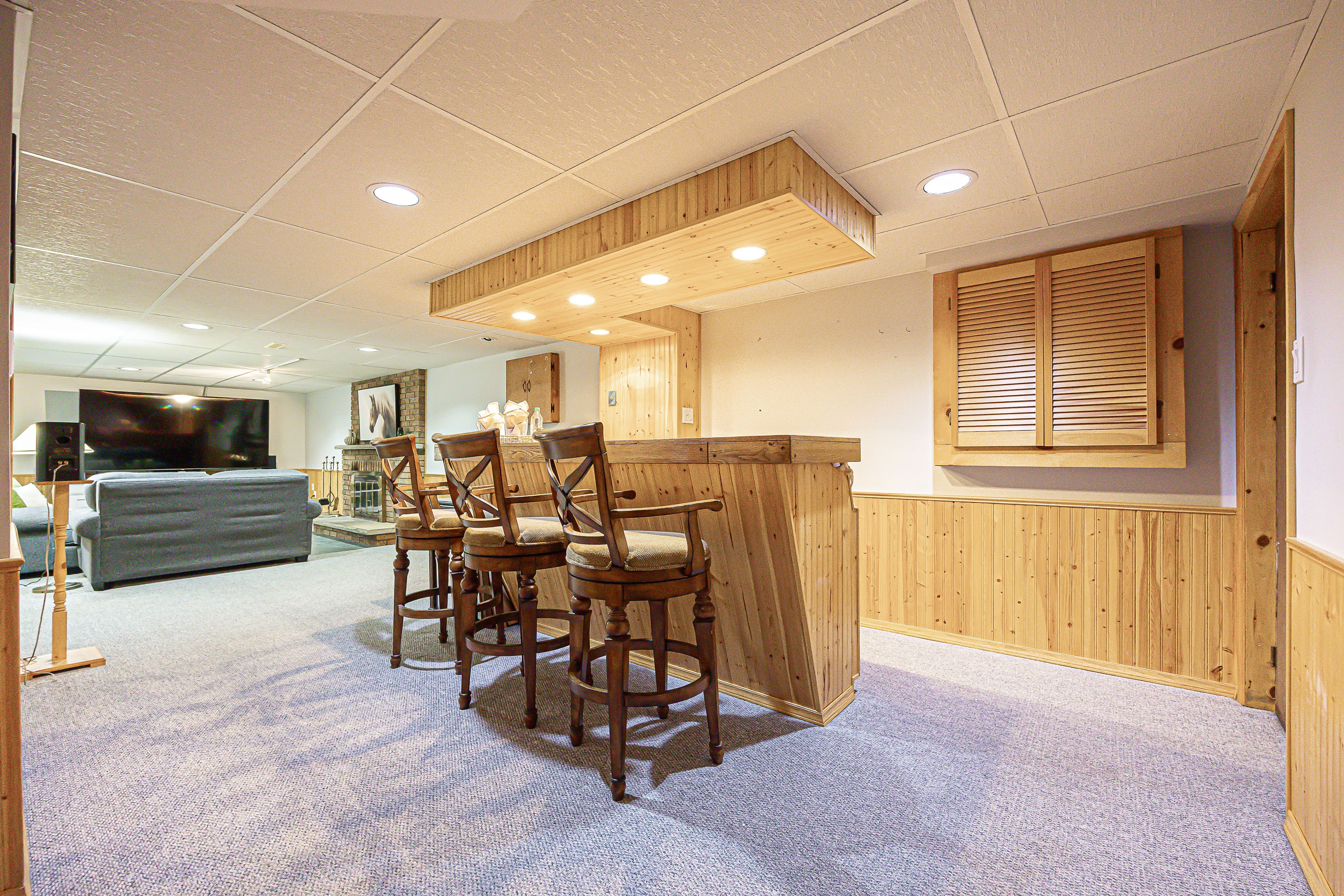 • Finished basement with custom wet bar and wood-burning fireplace for gatherings.