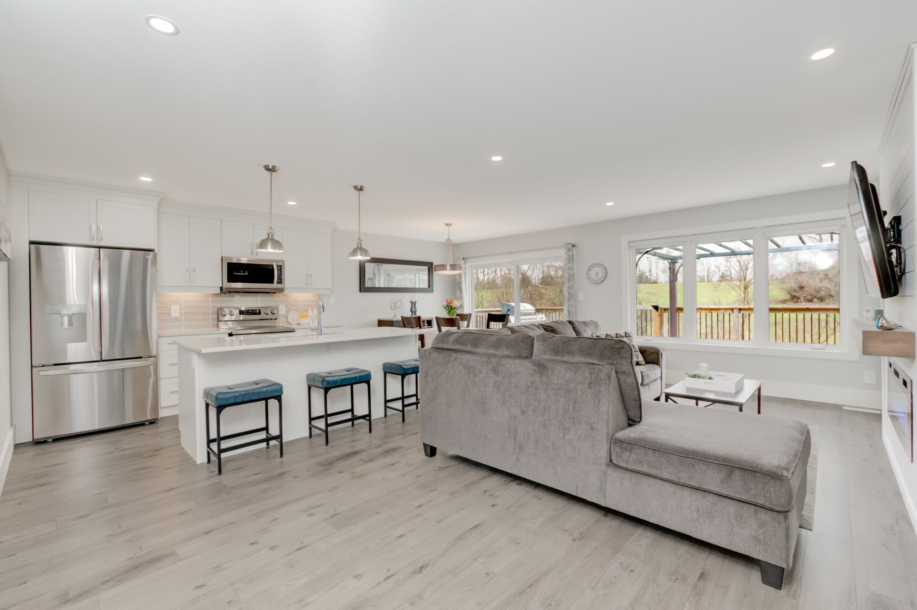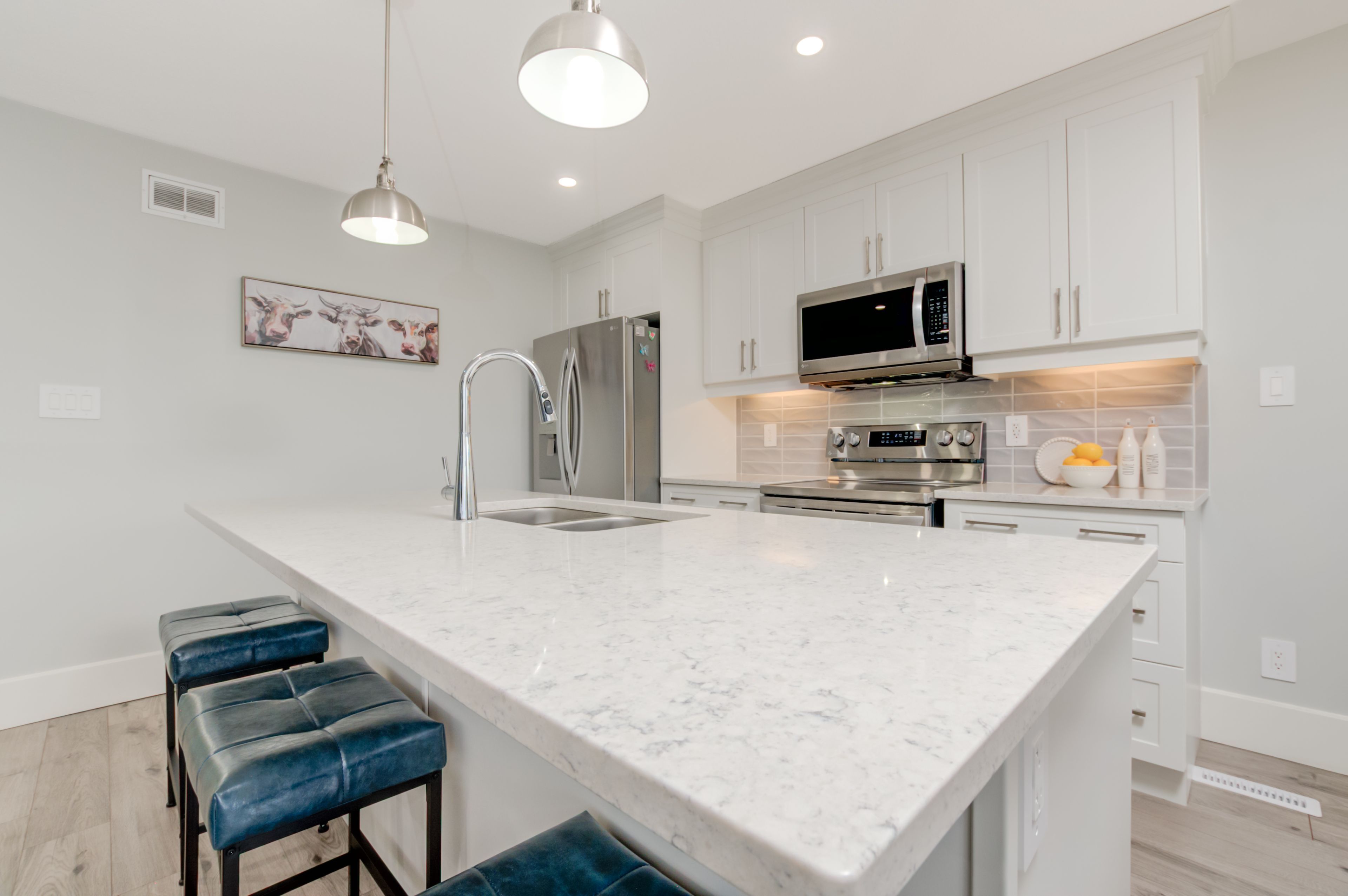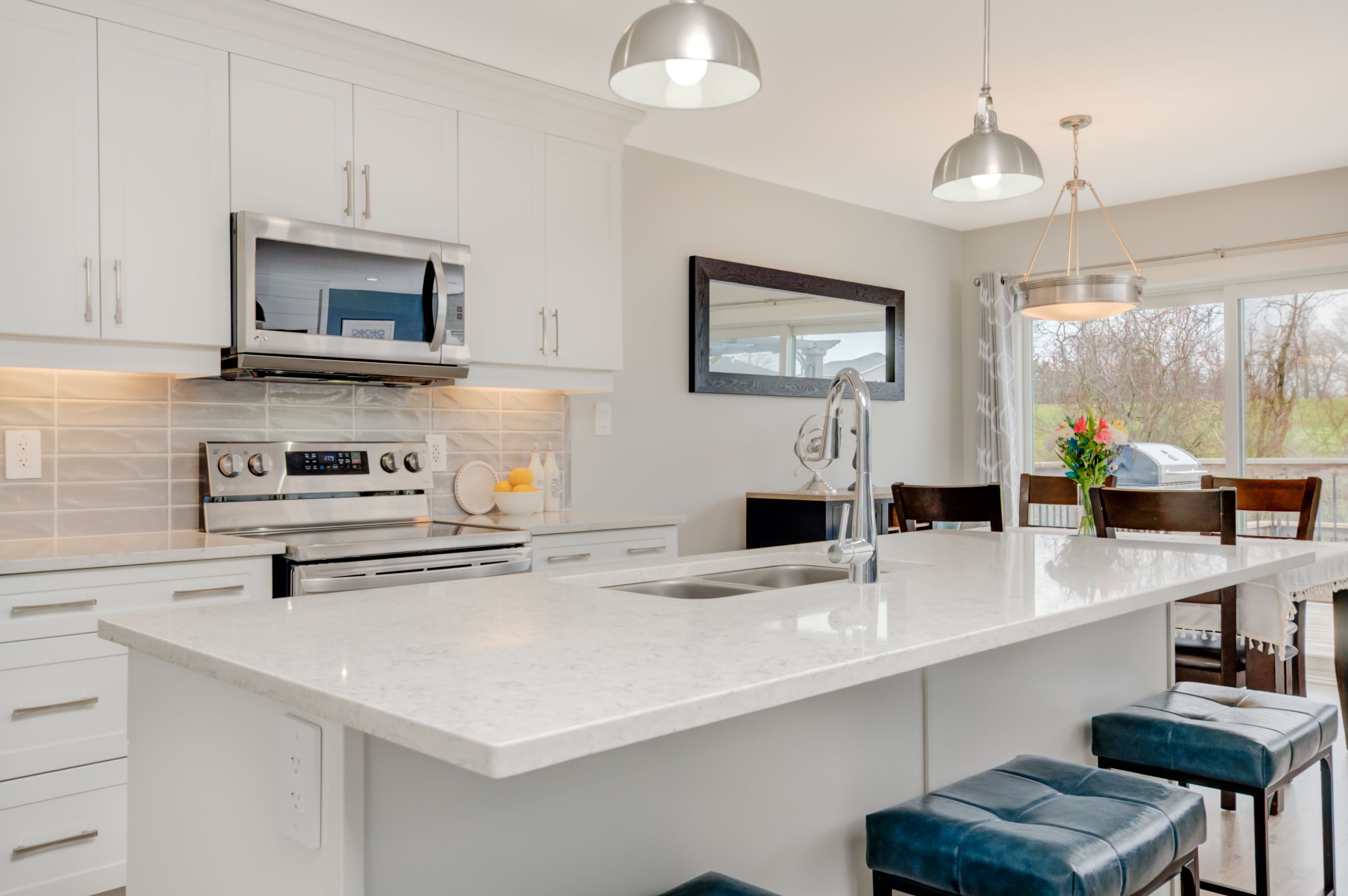 • Open floor plan features a chef's kitchen with quartz countertops and storage.