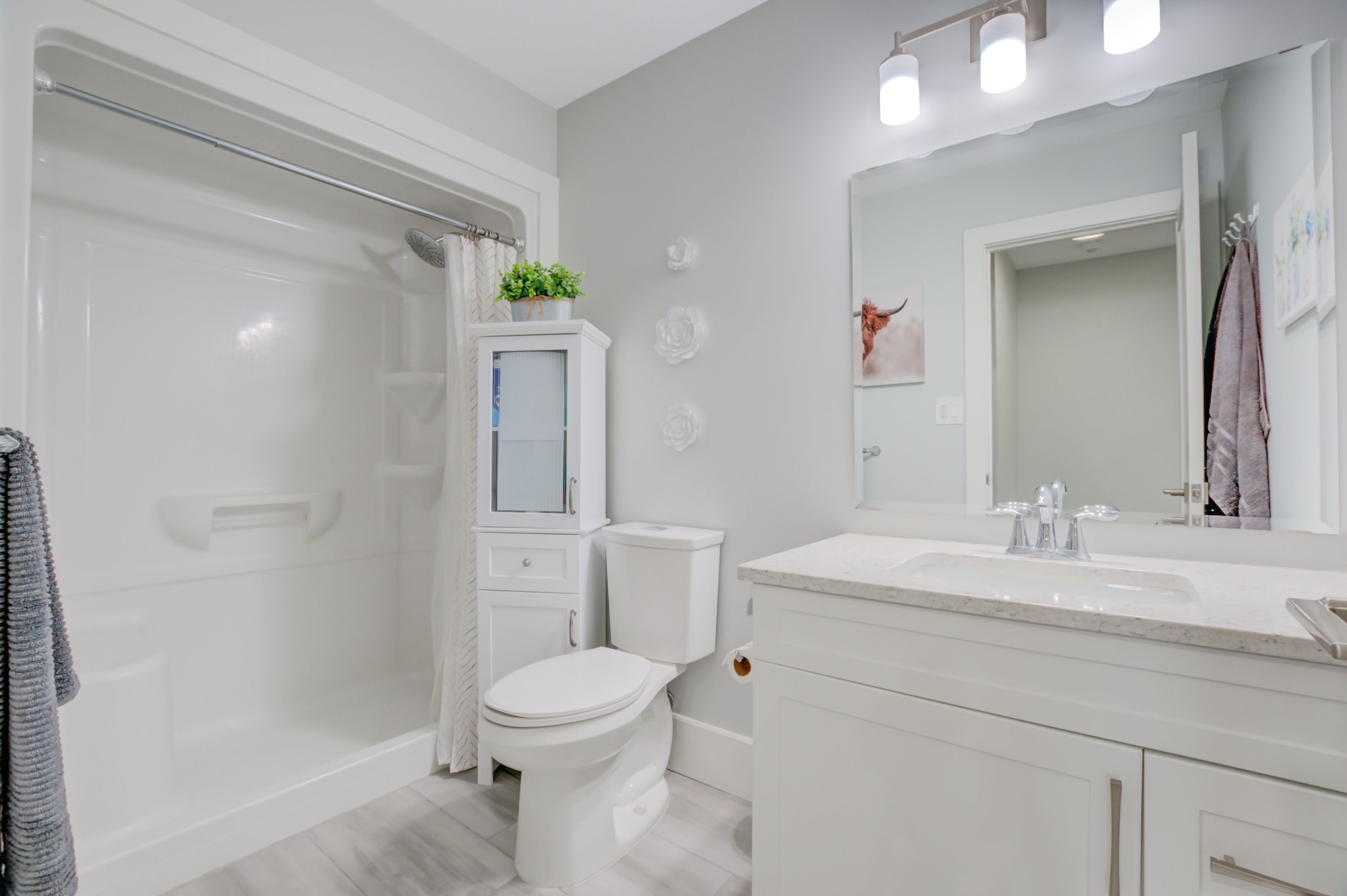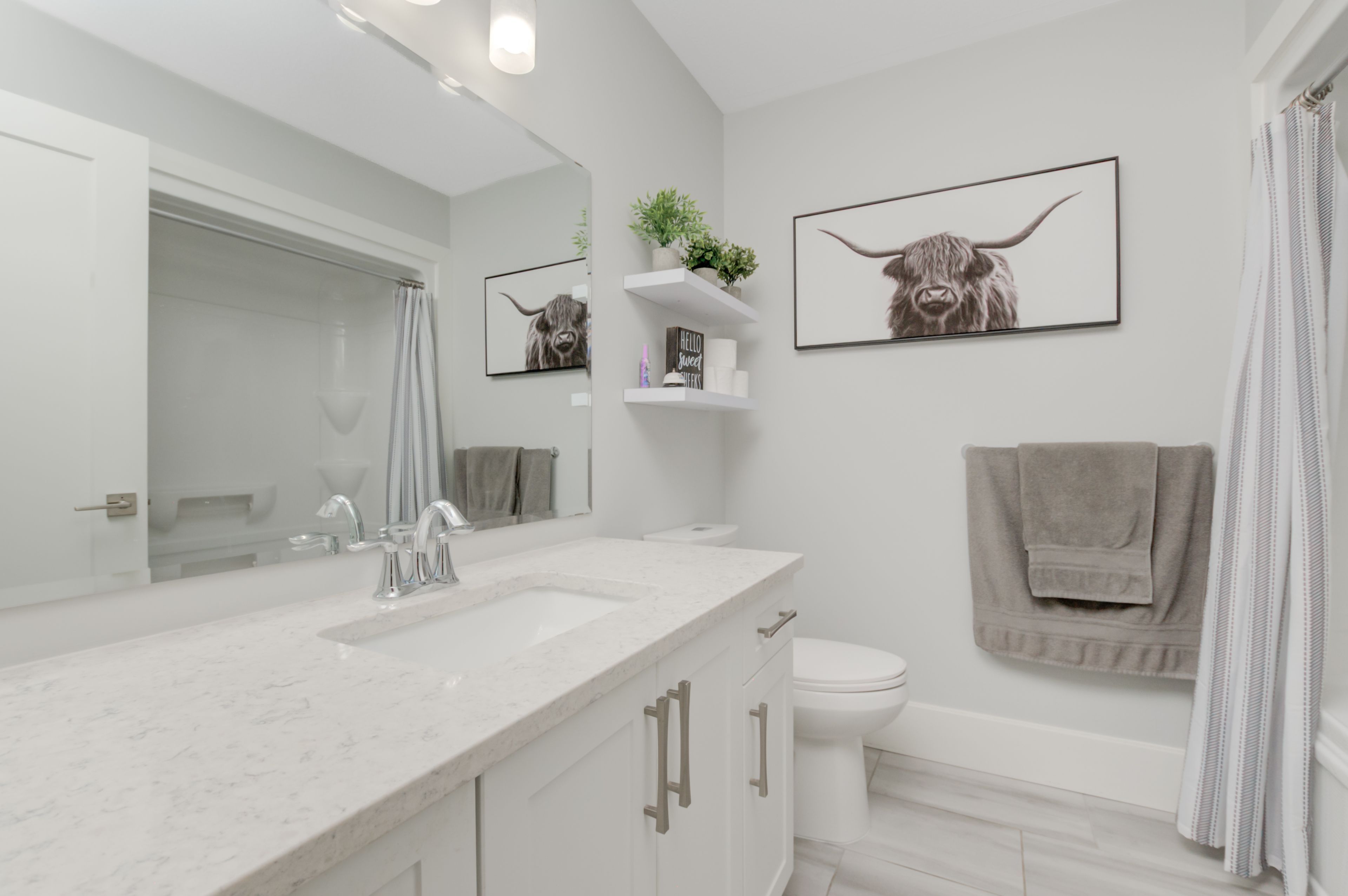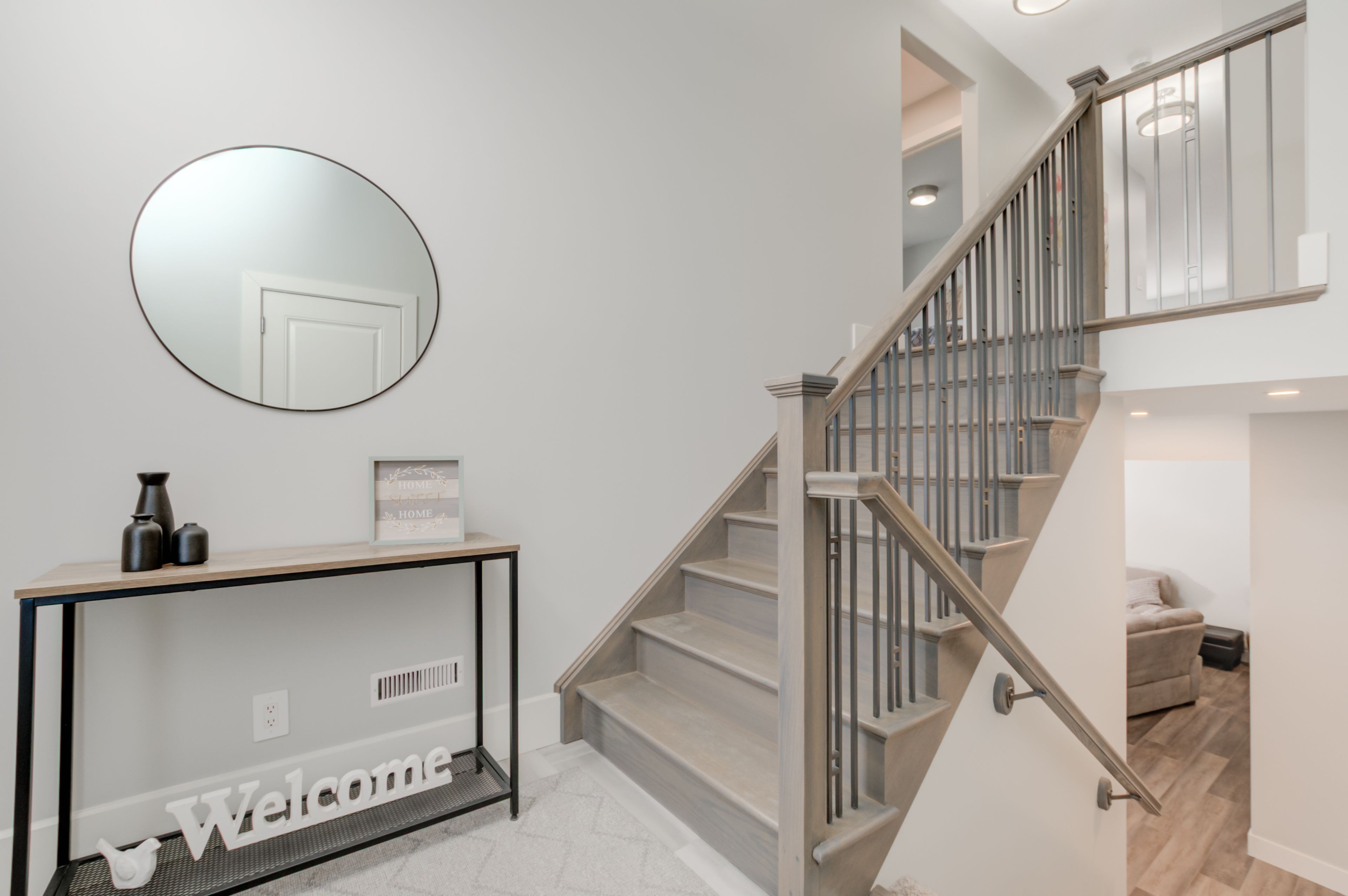• Open floor plan features a chef's kitchen with quartz countertops and storage.