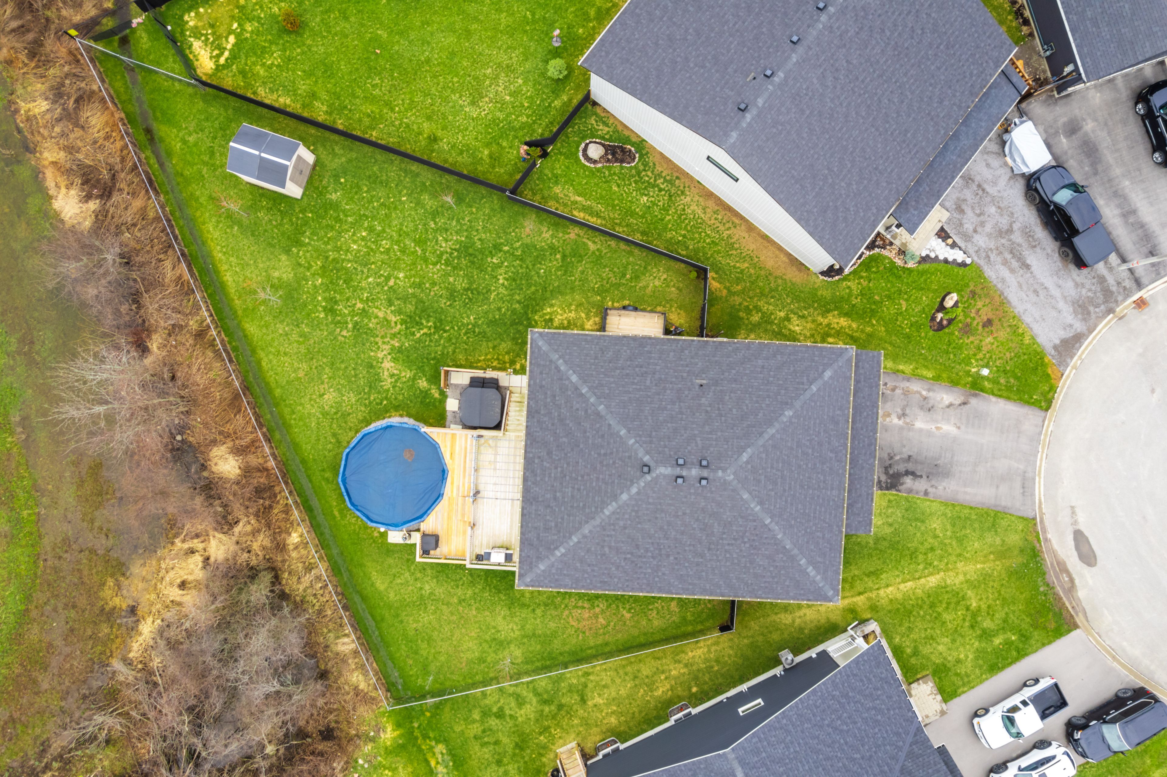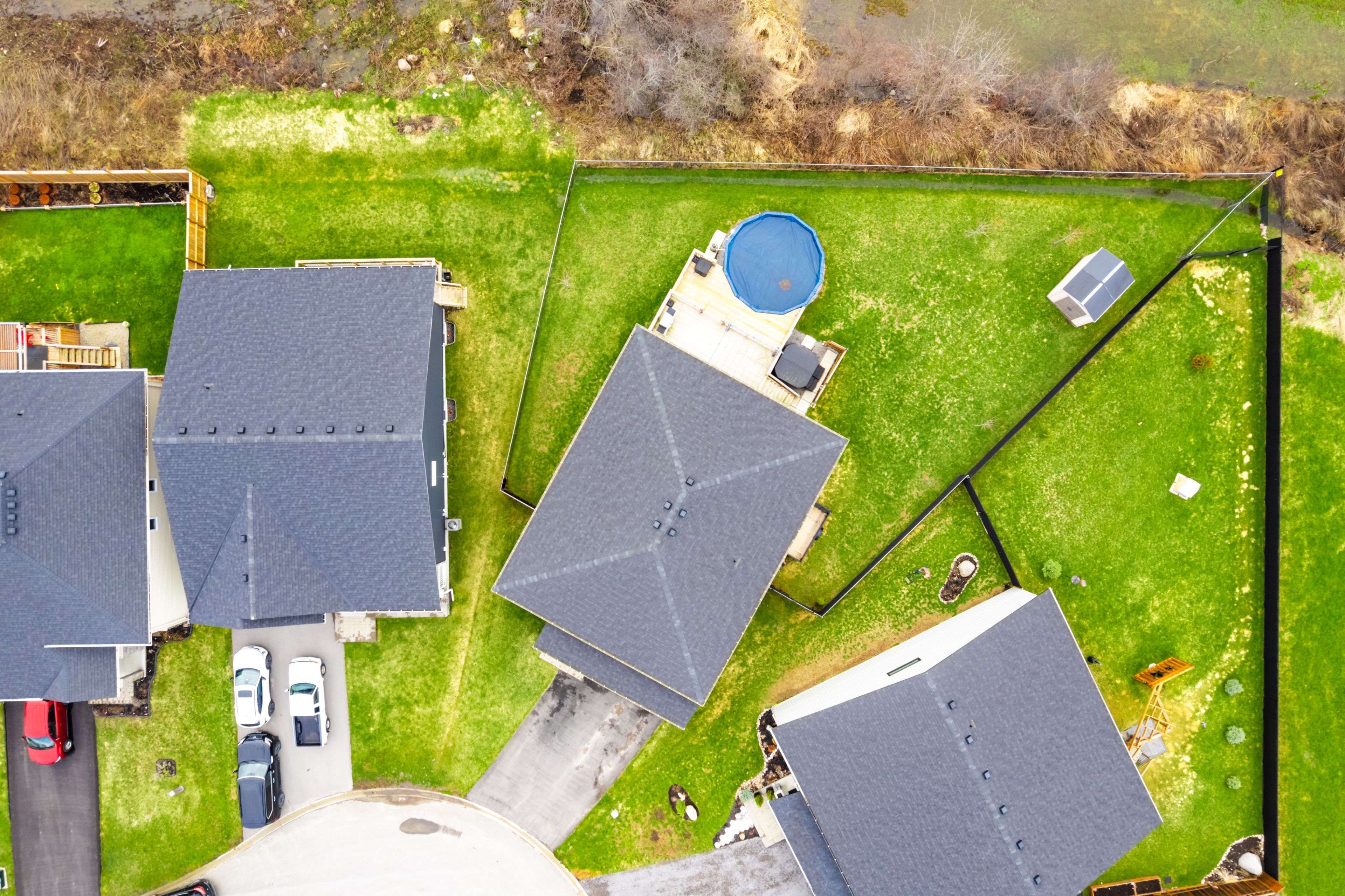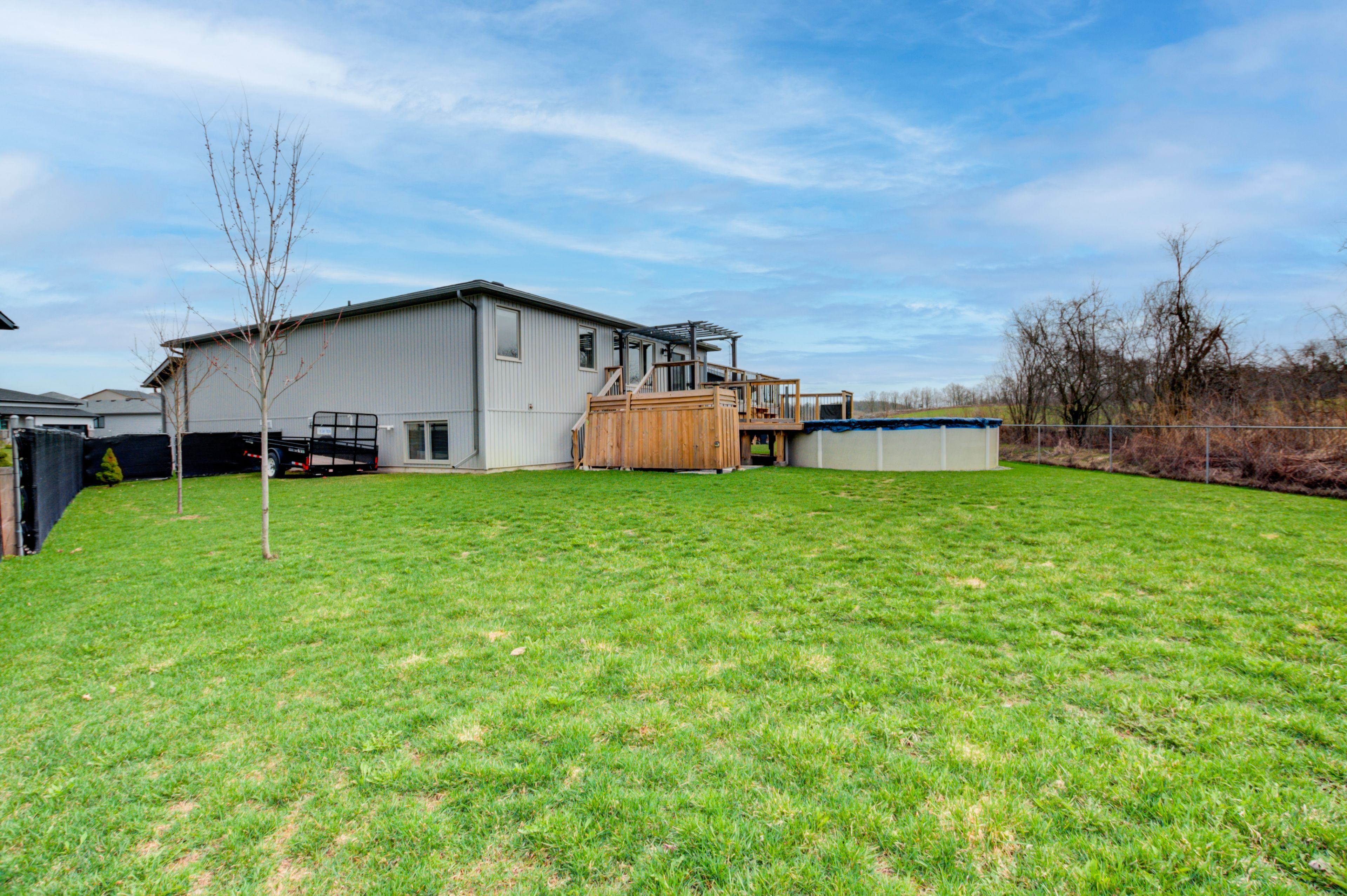 • Large deck and oversized backyard with pool, hot tub, and fencing.