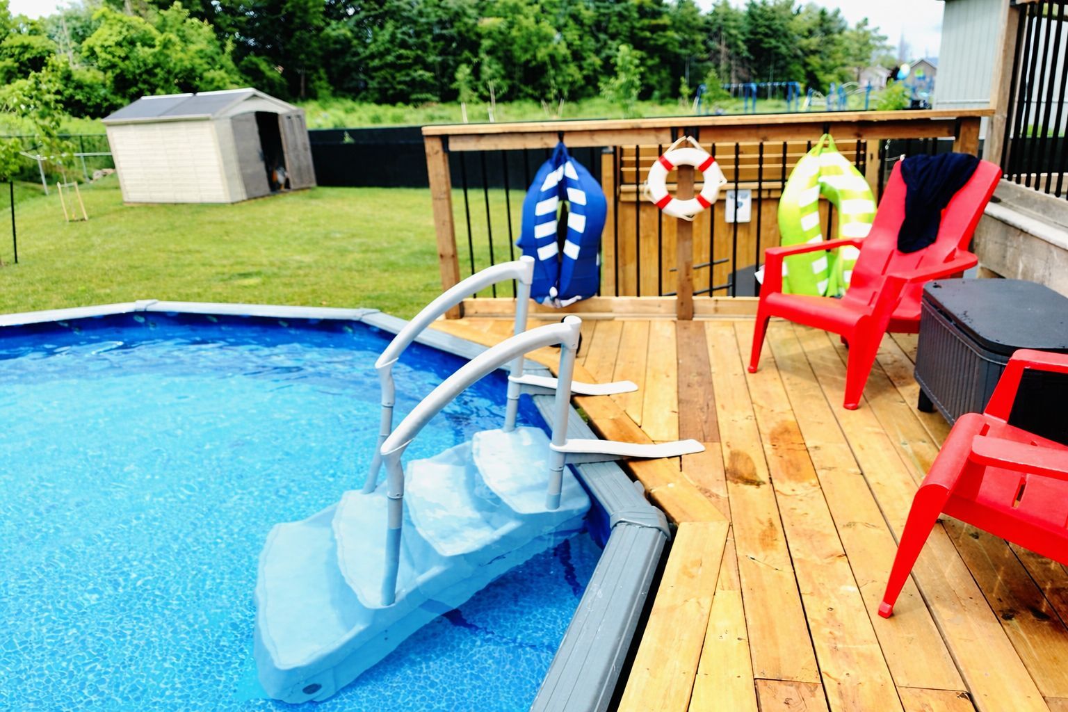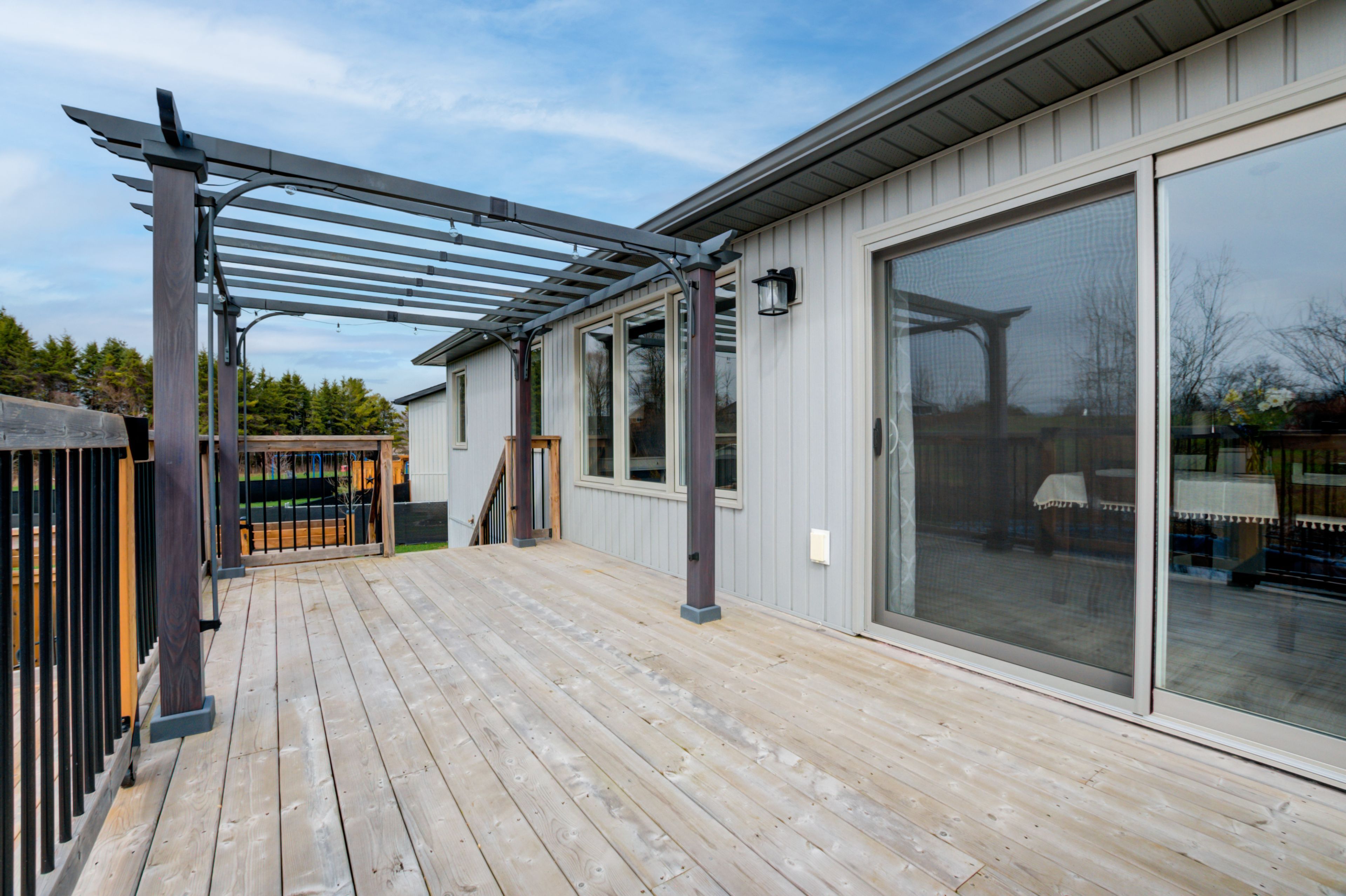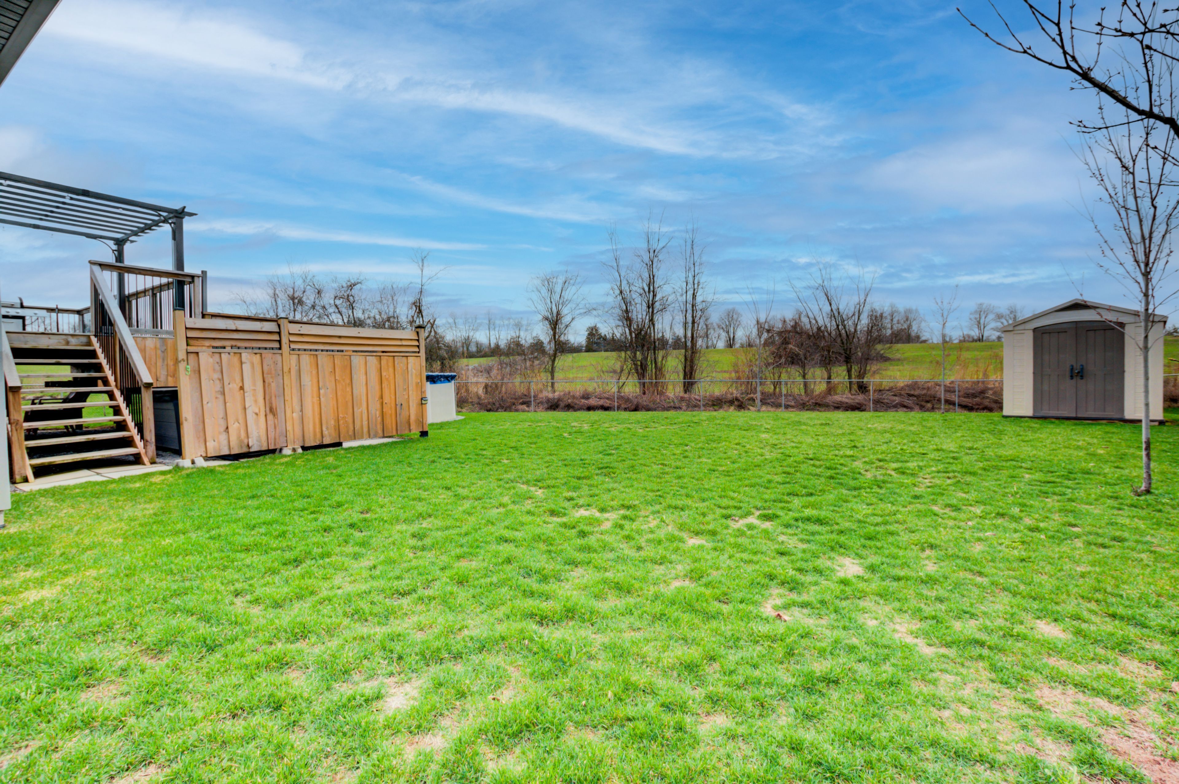 • Large deck and oversized backyard with pool, hot tub, and fencing.