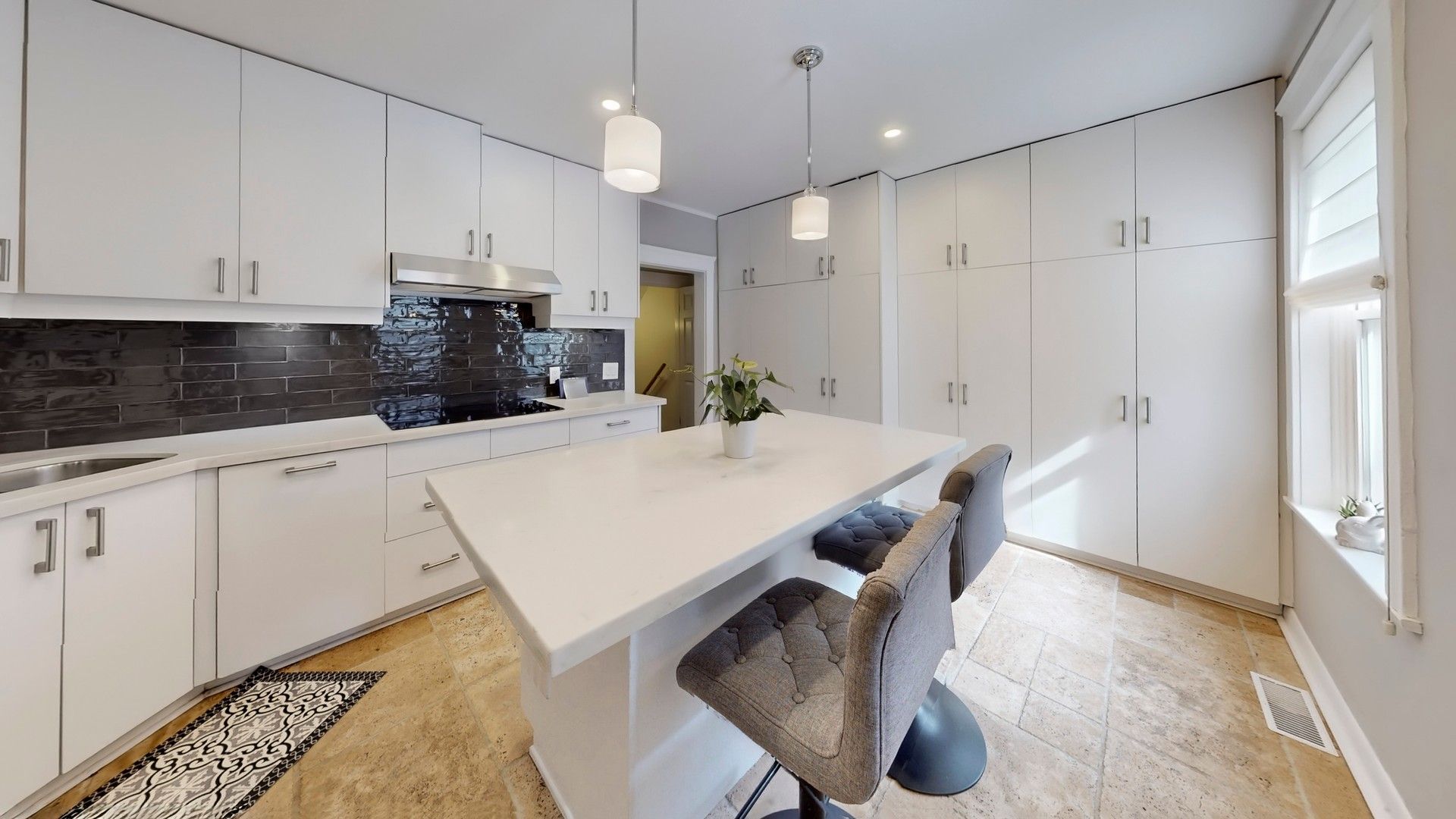 • Gourmet eat-in kitchen overlooking a landscaped backyard garden.