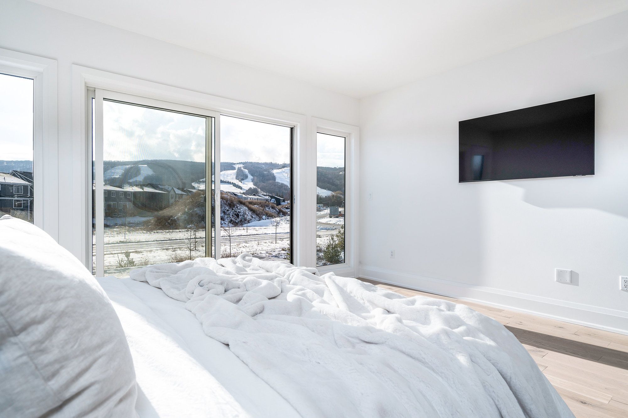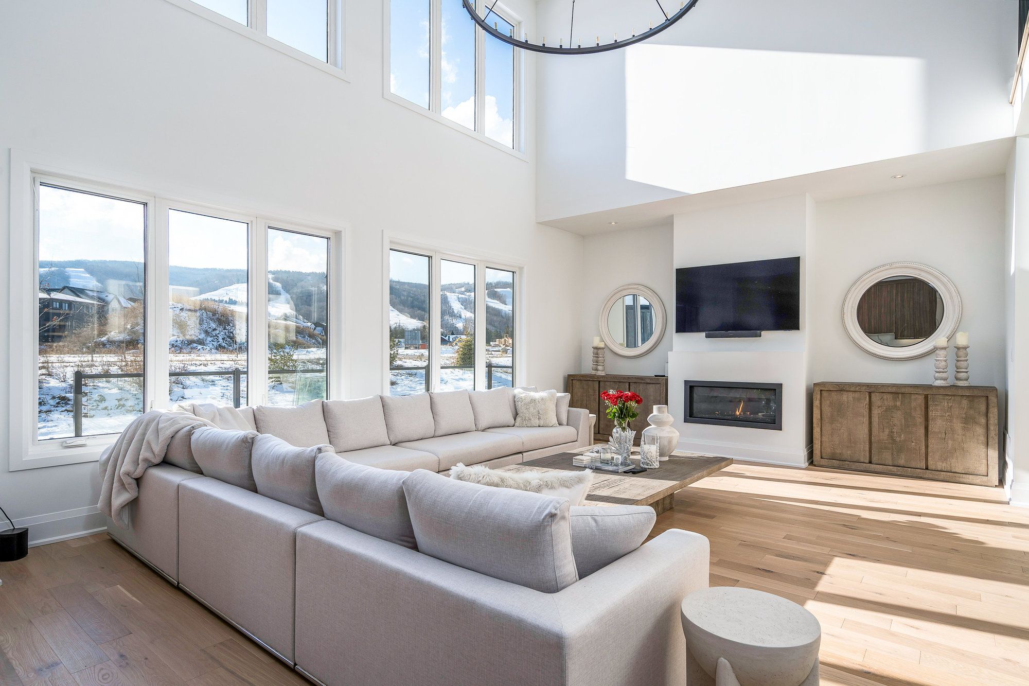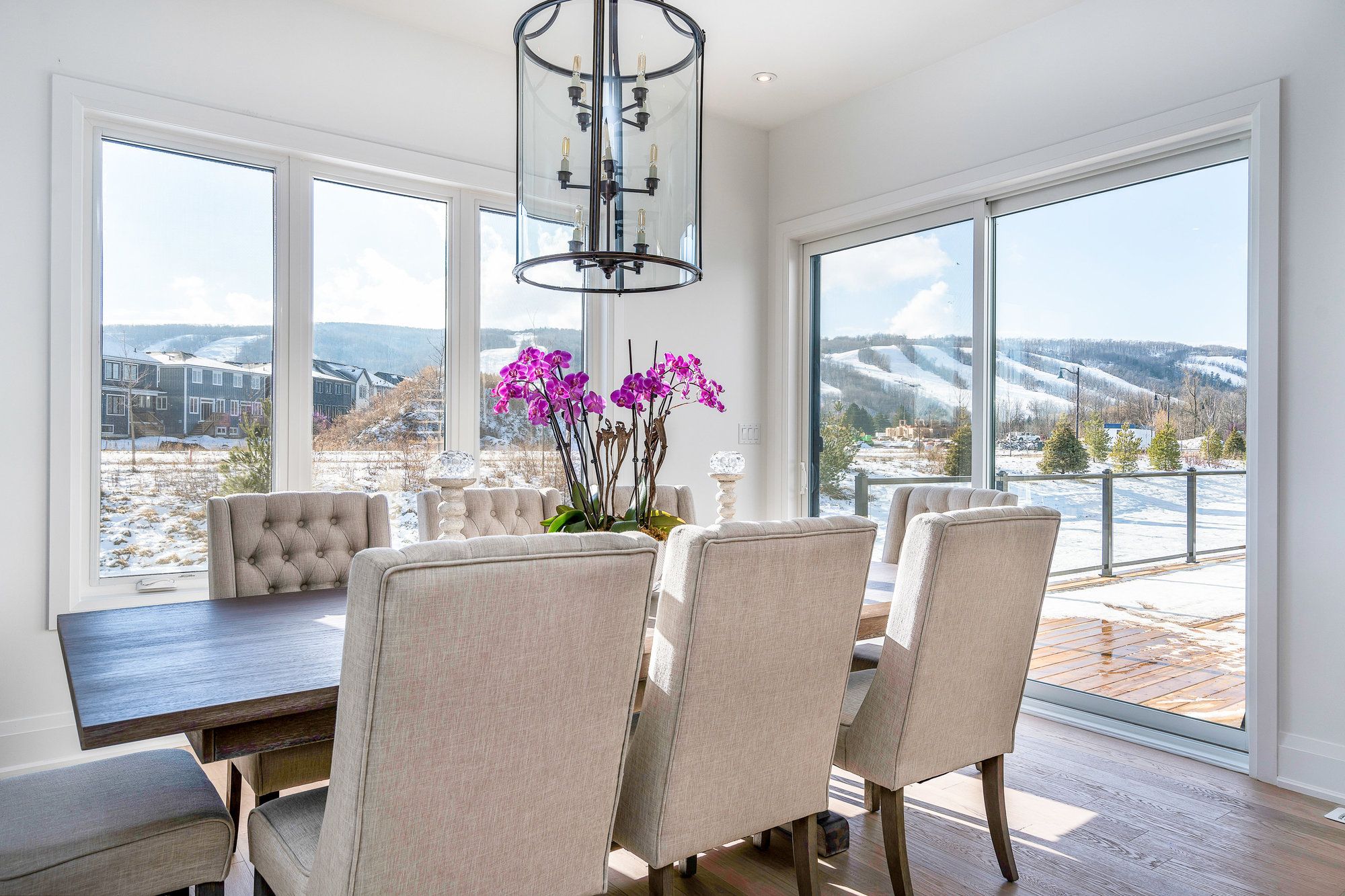 This designer executive home offers over 3,000 sq. Ft. Of modern, open-concept living with panoramic mountain views in one of blue mountain's most sought-after communities. Featuring soaring ceilings and wide plank hardwood floors, the chef's kitchen includes thermador built in appliances, quartz countertops, an oversized island, and a bar fridge. The expansive great room with gas fireplace and floor-to-ceiling windows provides an inviting space to relax and entertain. Four spacious bedrooms each have private ensuites, including a primary suite with double glass-framed shower, deep soaker tub, and heated floors. Additional highlights include motorized blinds, a full laundry room with lg front-load washer and dryer, a private backyard with expansive deck, and parking for up to six vehicles. Just minutes from the village, ski lifts, shops, restaurants, and trails, this home combines modern elegance with the ultimate blue mountain lifestyle.