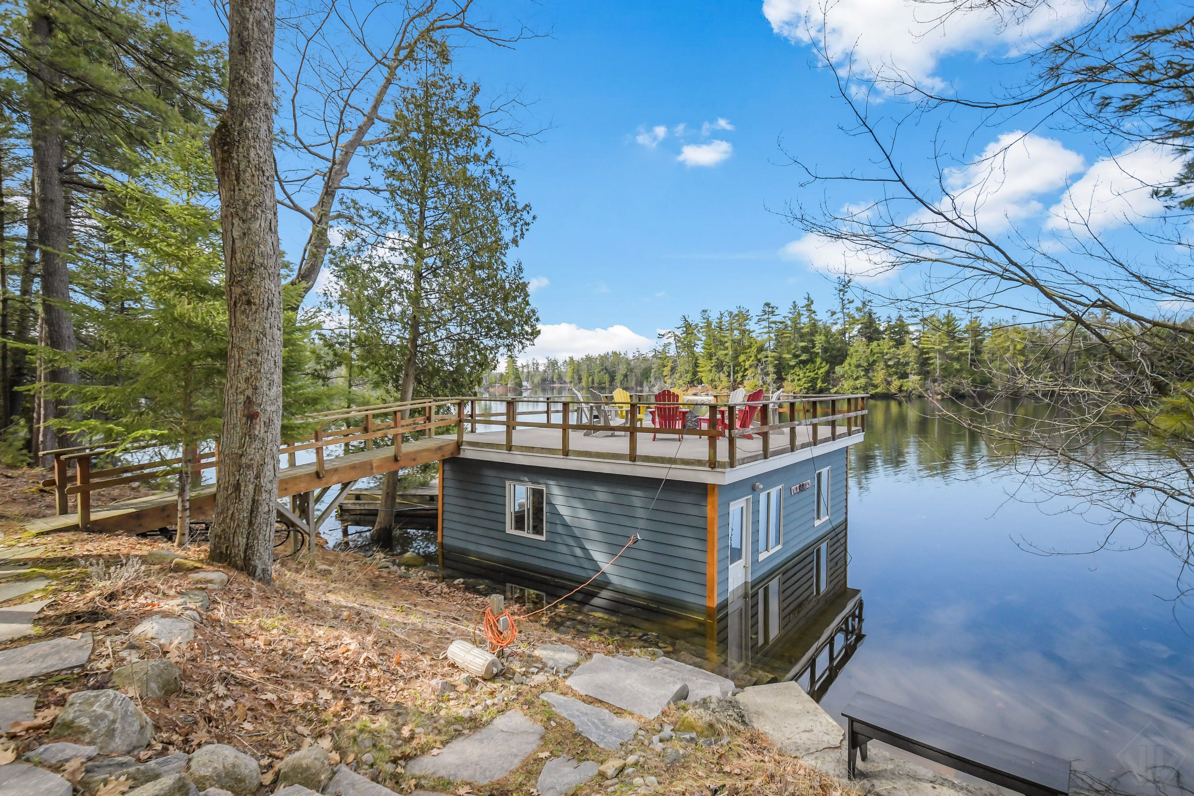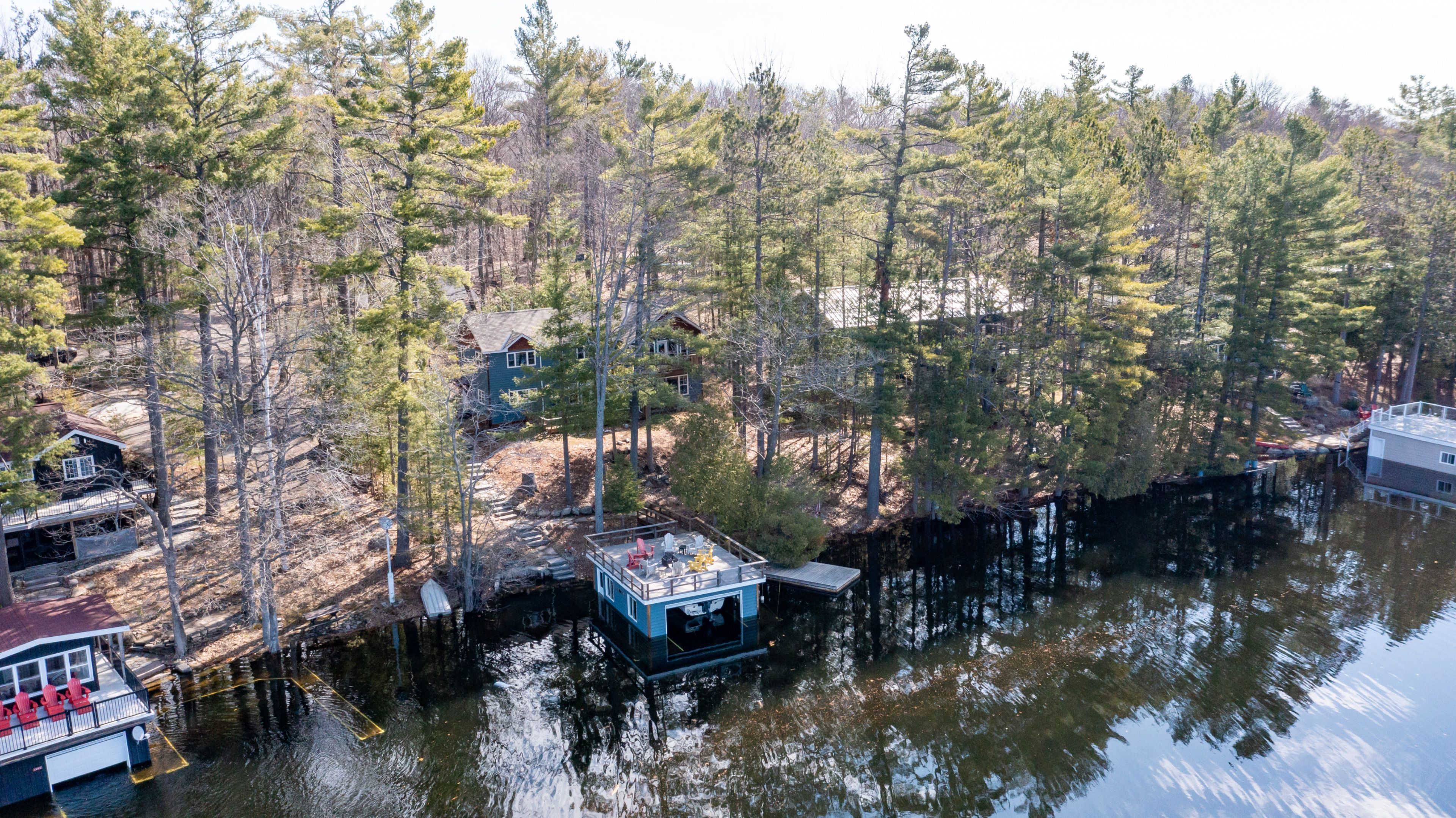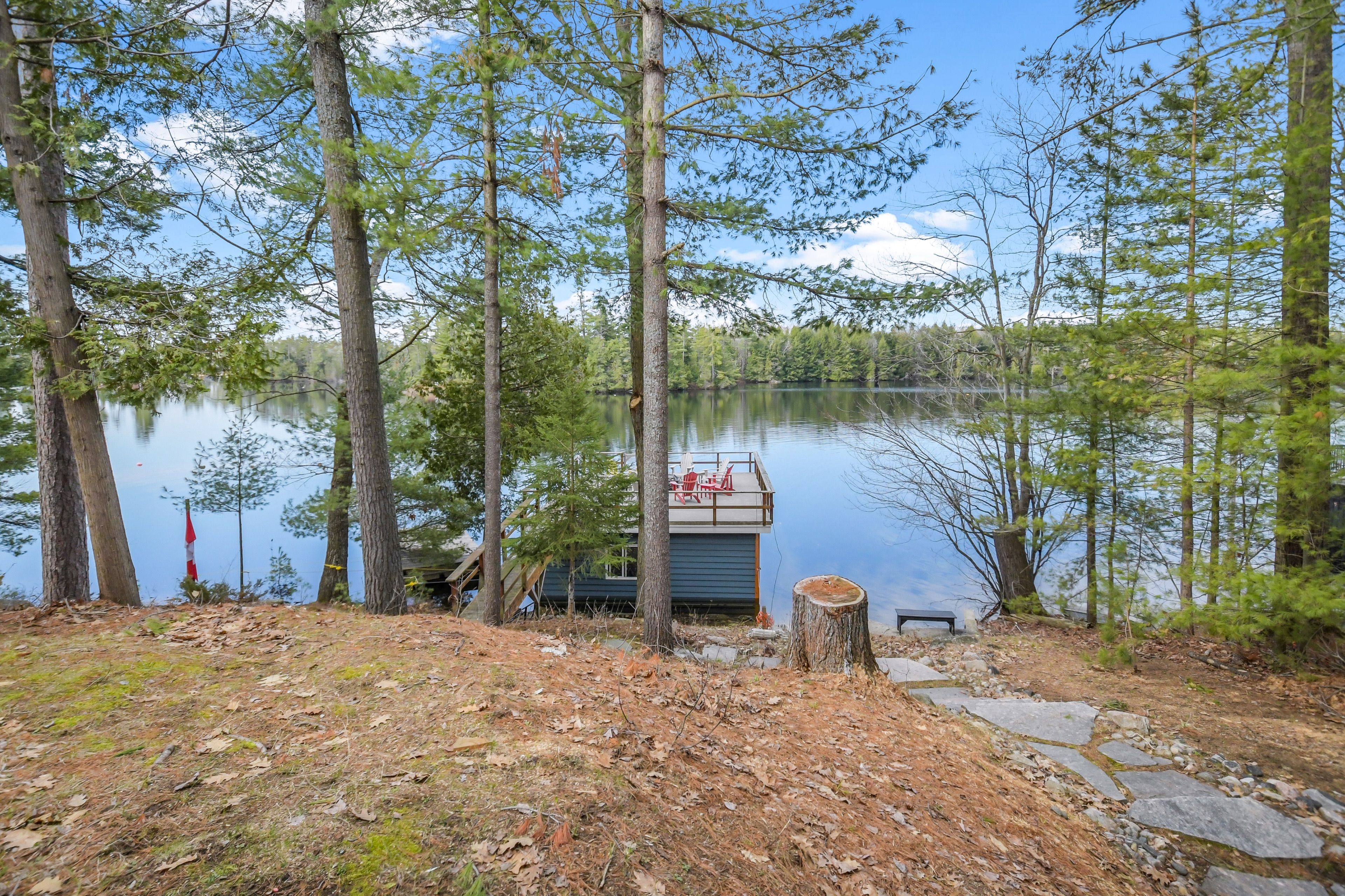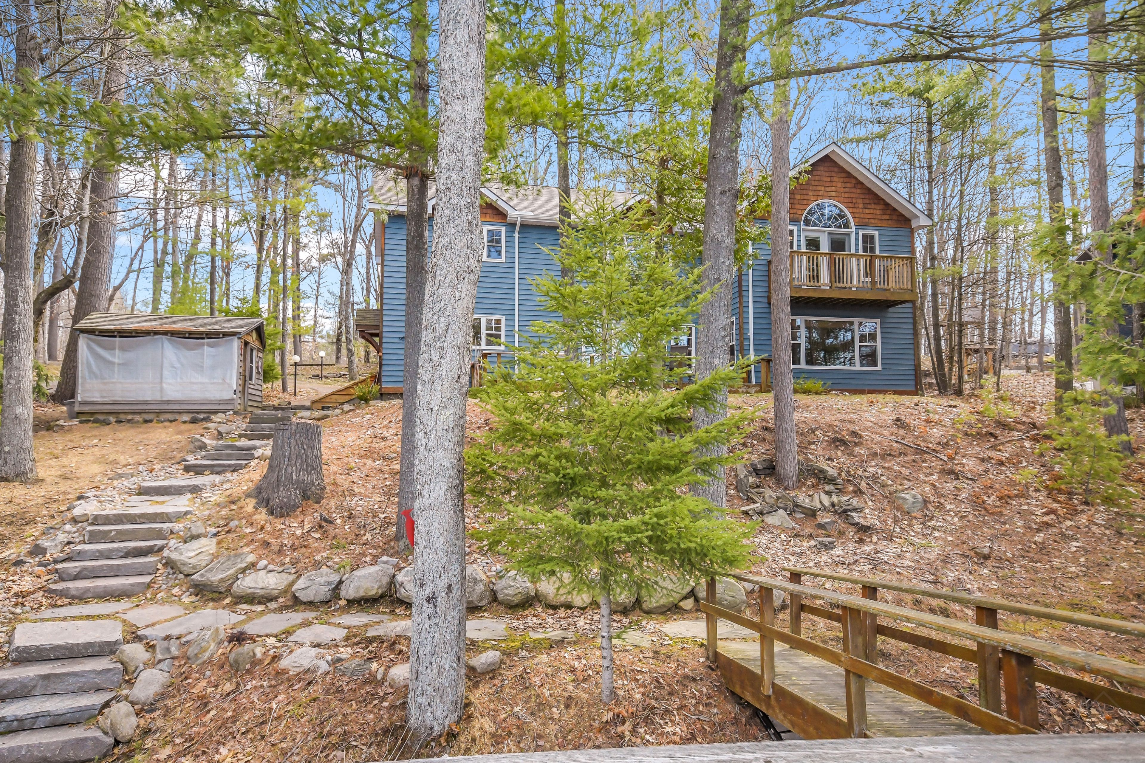 Nestled on 0. 51 acres of gently sloping terrain with 102 feet of coveted south-west facing waterfront, this beautifully maintained 2,400 sq ft fully winterized cottage offers the perfect blend of comfort, charm, and four-season enjoyment. With 4 bedrooms and 3 bathrooms, there is ample room for family and guests to relax and unwind. Enjoy a peaceful setting on a quiet private road with a picturesque island-dotted view and breathtaking sunsets across the water. The shoreline features an oversized single boathouse with sundeck, ideal for lakeside lounging and sunbathing, plus a shallow sandy entry that is perfect for kids and retirees alike. Inside, the cottage offers warm and inviting living spaces designed for all seasons, highlighted by an authentic wett certified woodstove that adds classic cottage charm. The home is equipped for year-round use with forced air furnace and a heated waterline with uv system. Enjoy being bug free in your own gazebo/artist studio surrounded by forest and water great for kids and grandkids. A detached double-car garage provides excellent storage for boats, vehicles, tools, and recreational gear. A 17kw generac generator provides winter security for the harshest storms. Whether you're seeking a serene family retreat, a year-round waterfront home, or the ultimate place to entertain, this exceptional property delivers privacy, functionality, and timeless cottage appeal in a highly desirable setting.