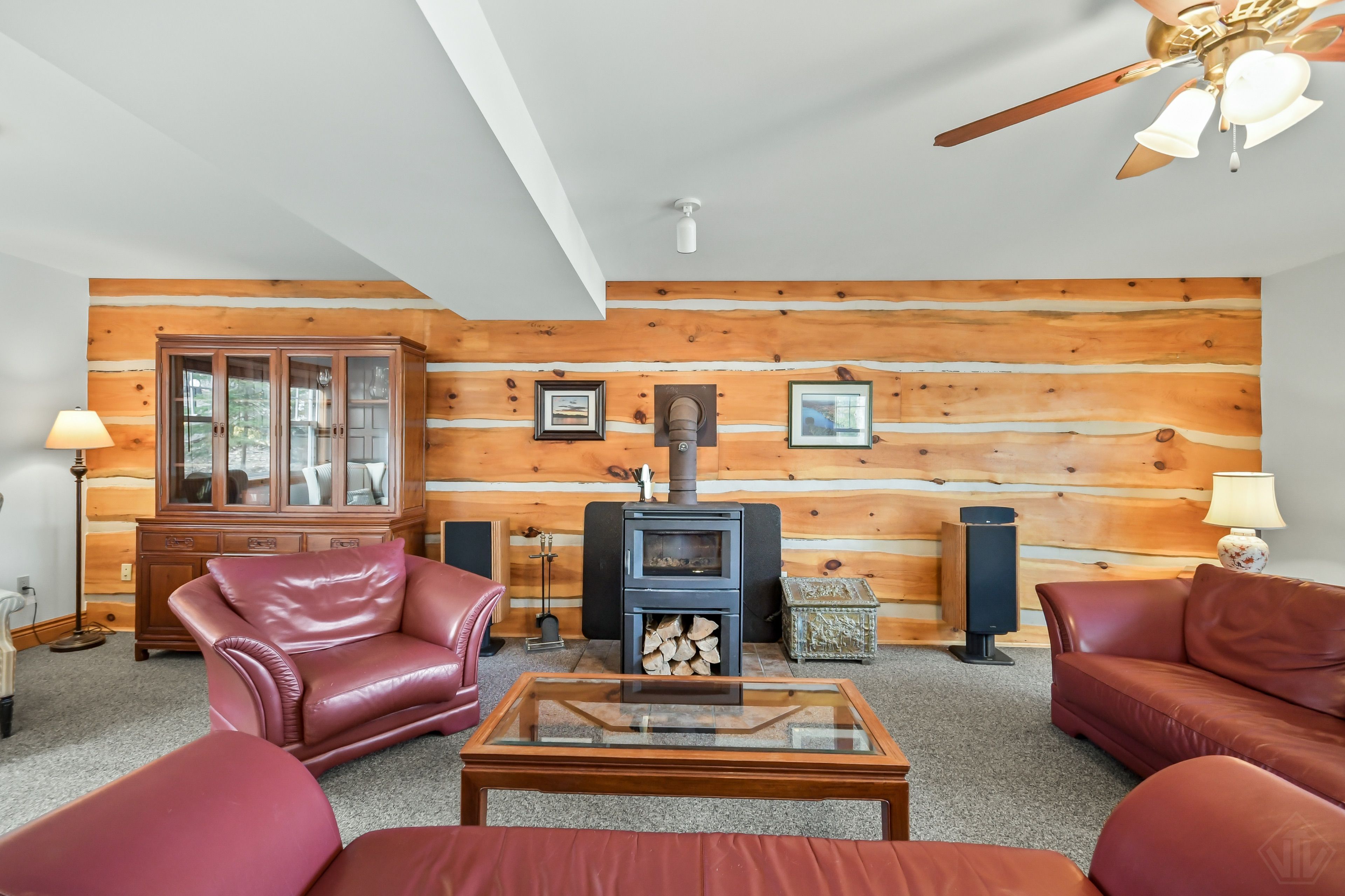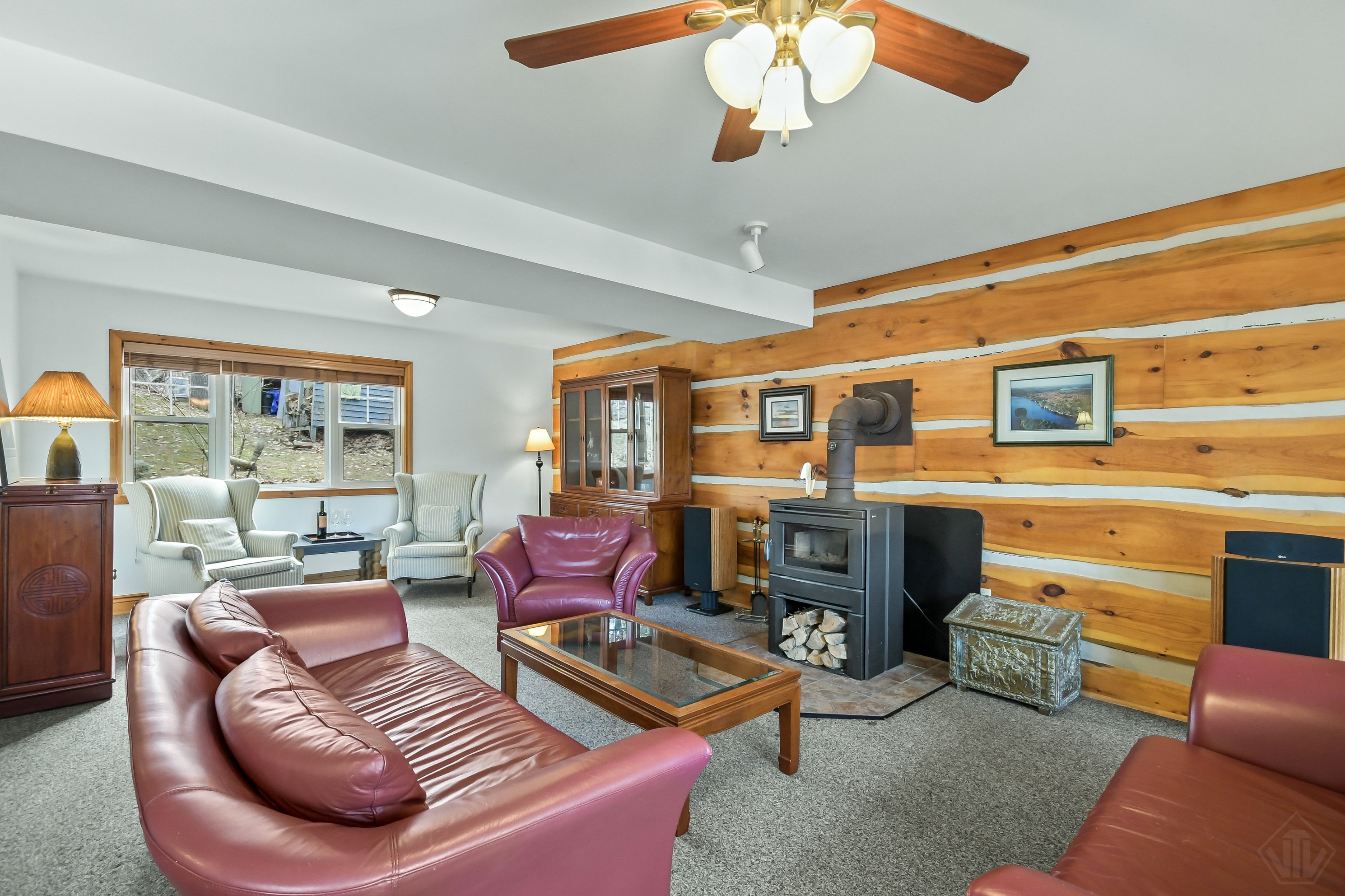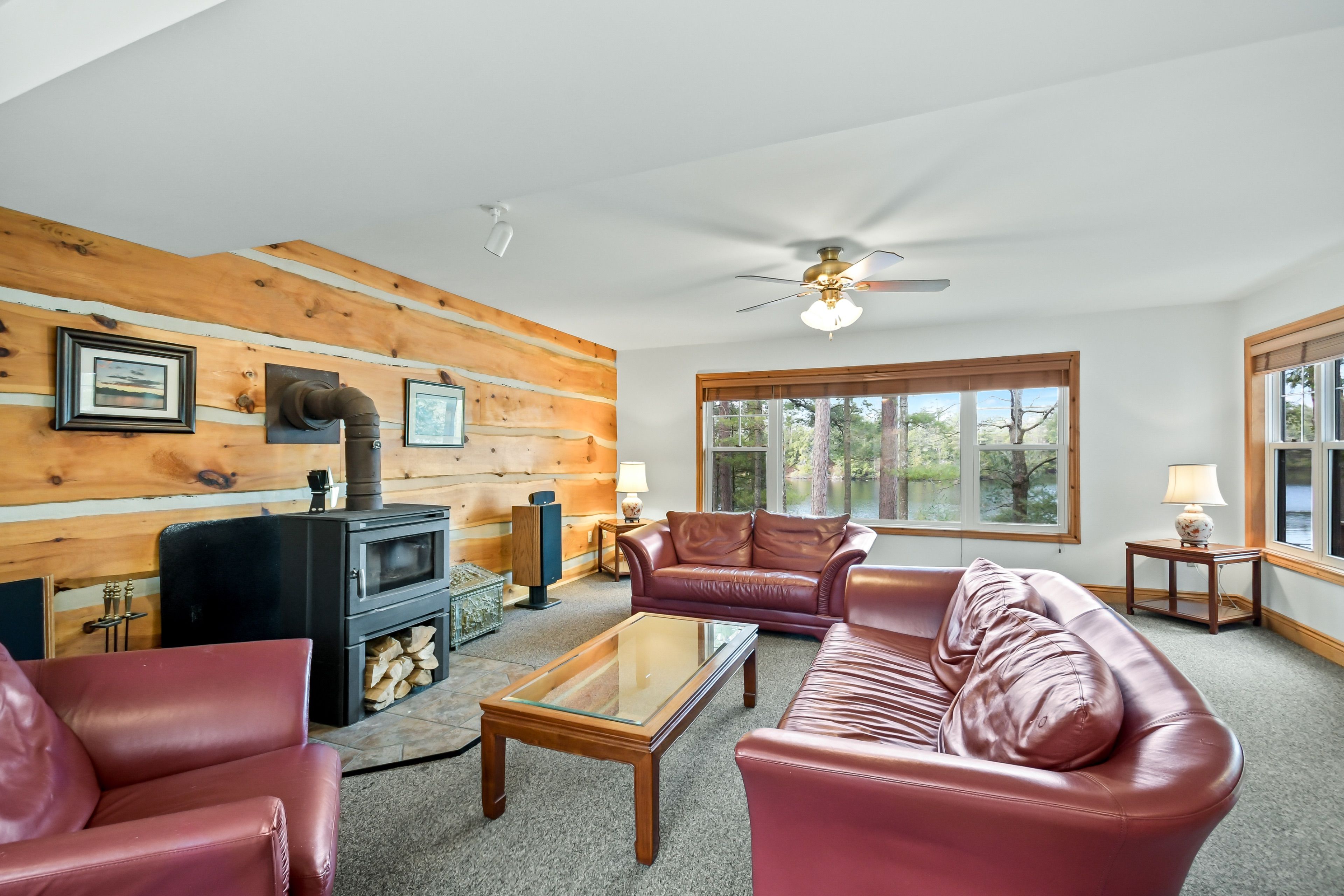 • Cozy living spaces, featuring a classic woodstove for comfort.