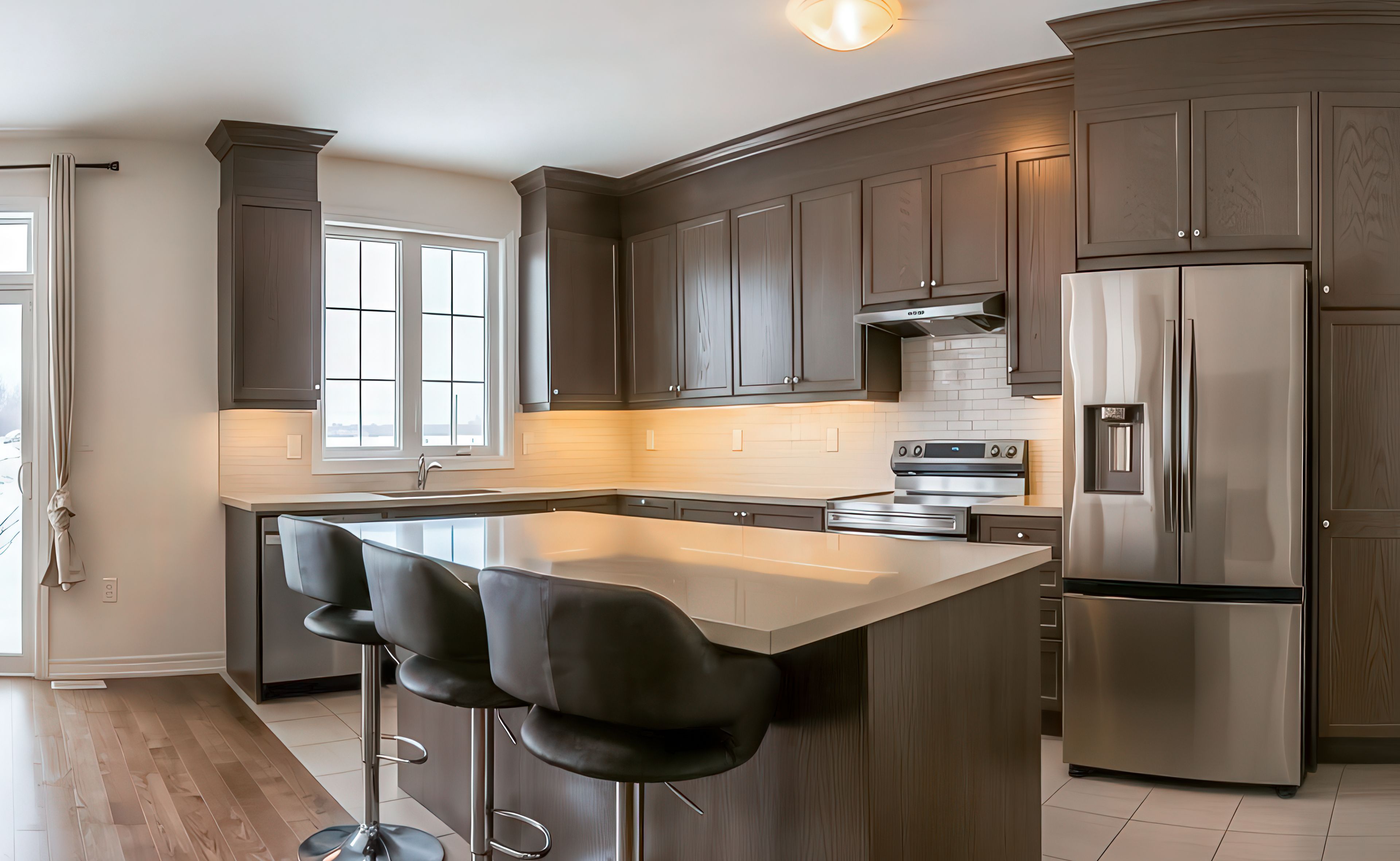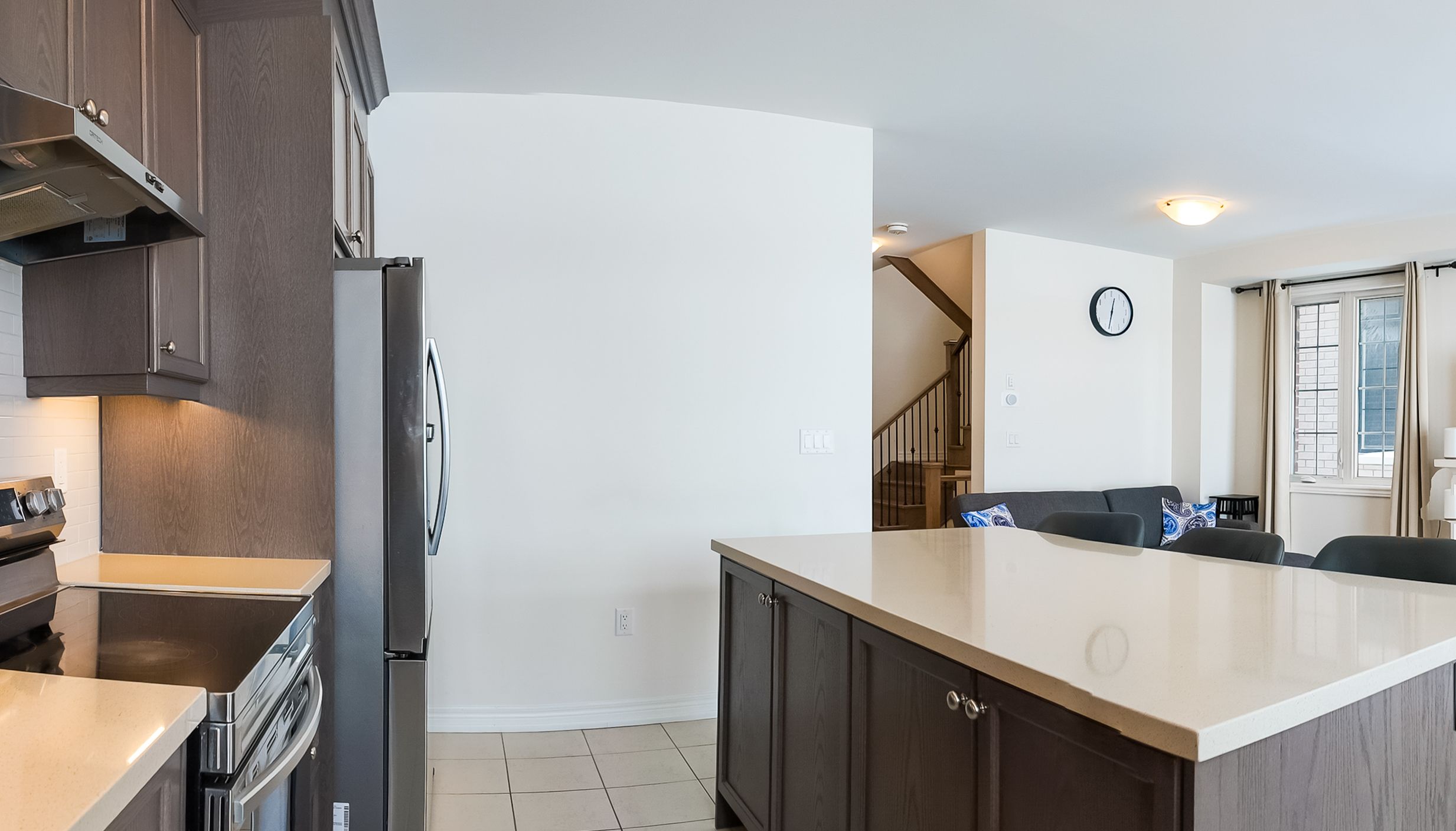 • Modern kitchen features quartz countertops and a large center island.