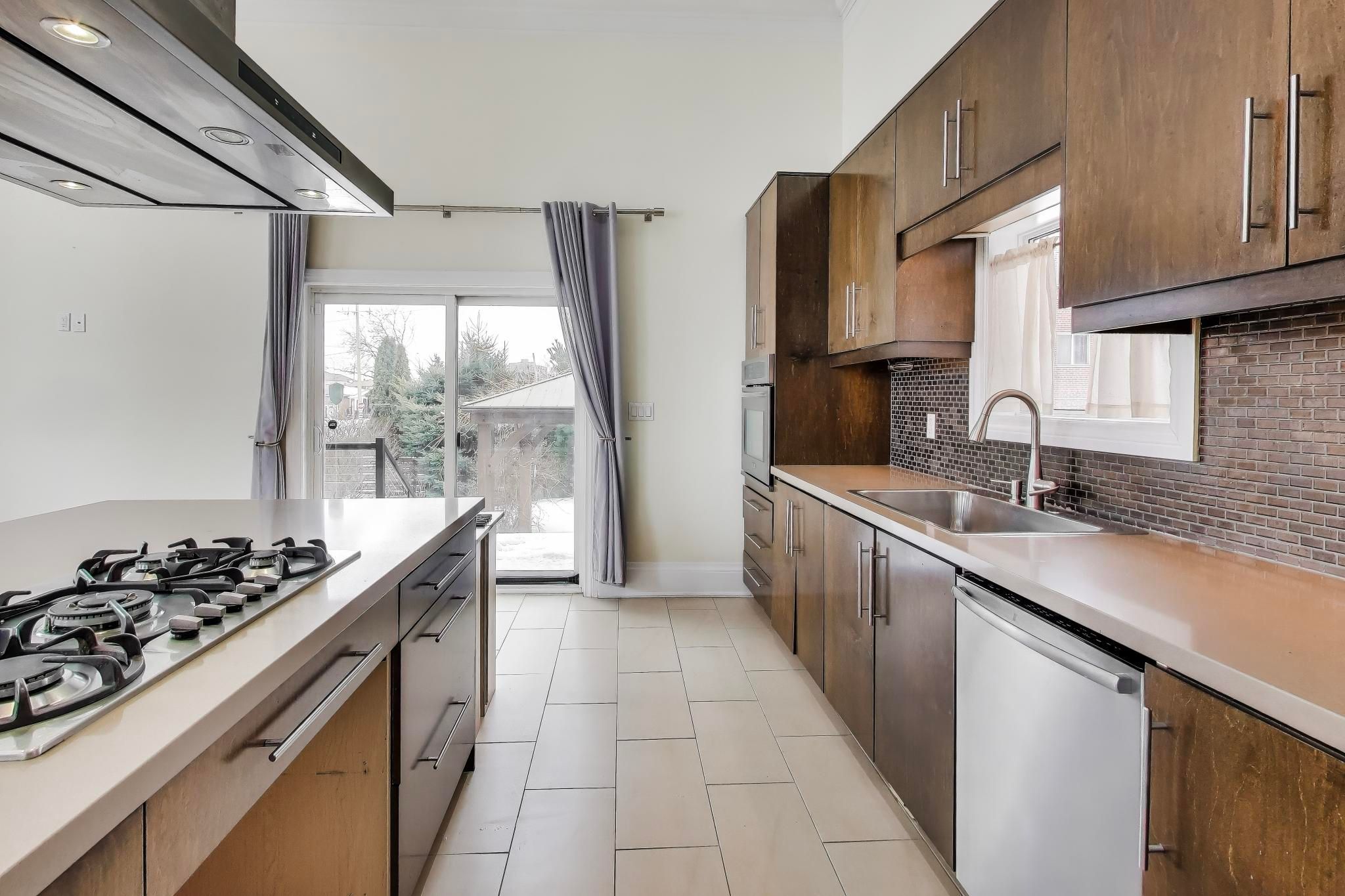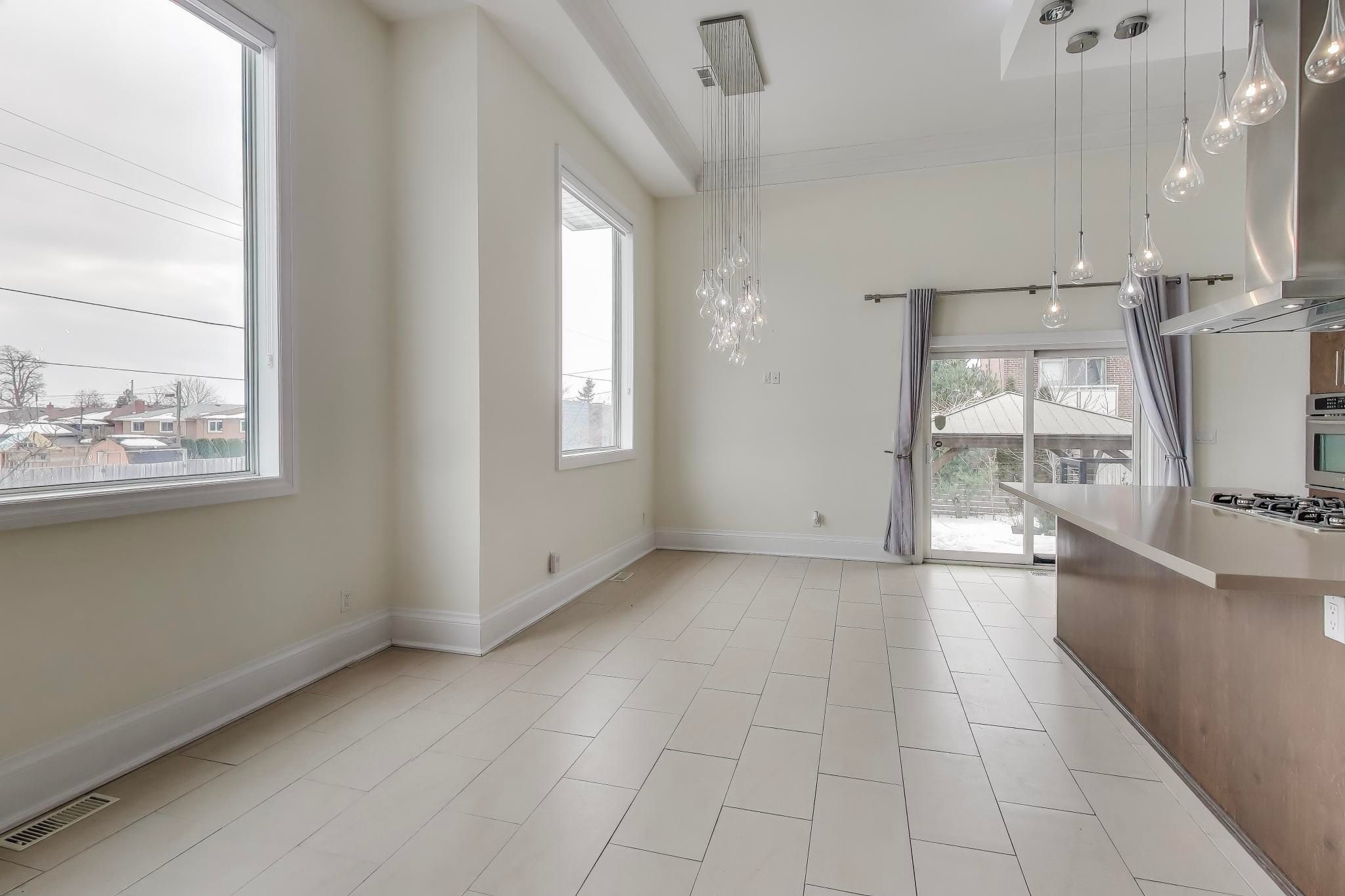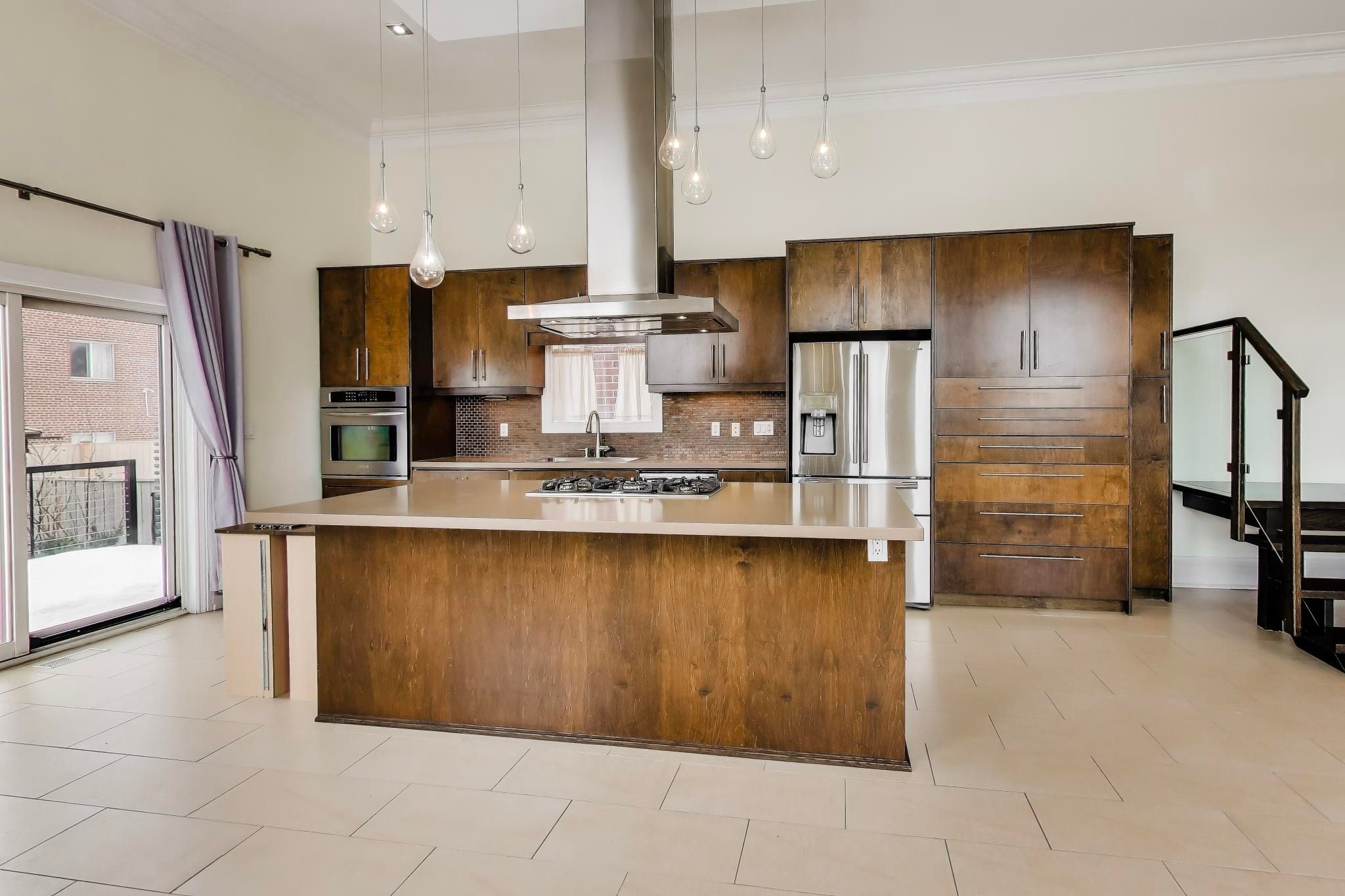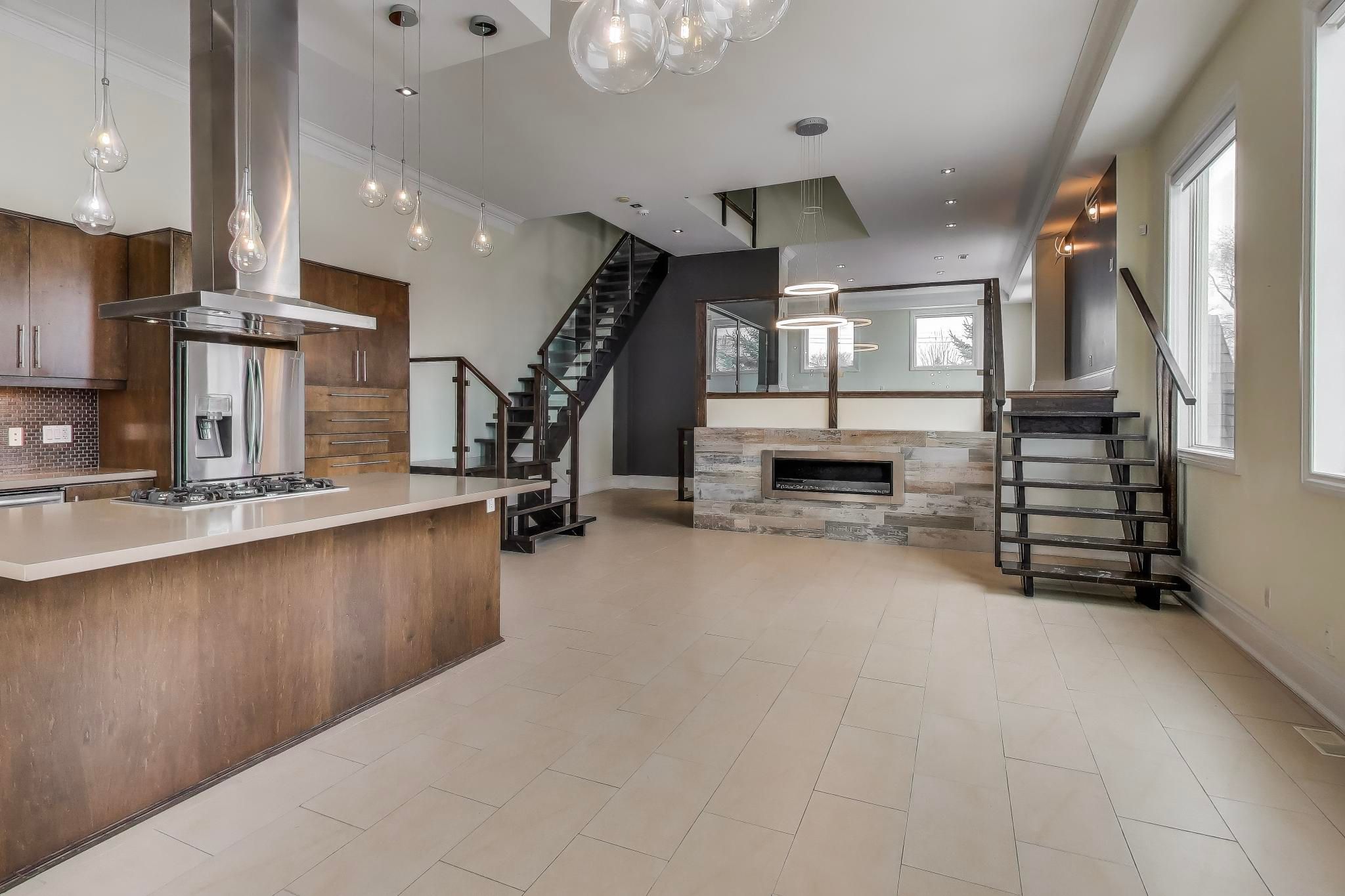 • Open-concept main floor with high ceilings and modern kitchen.