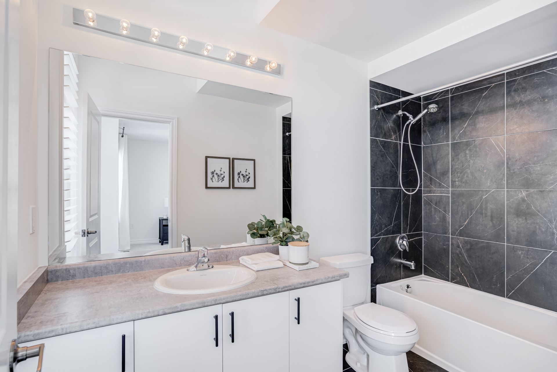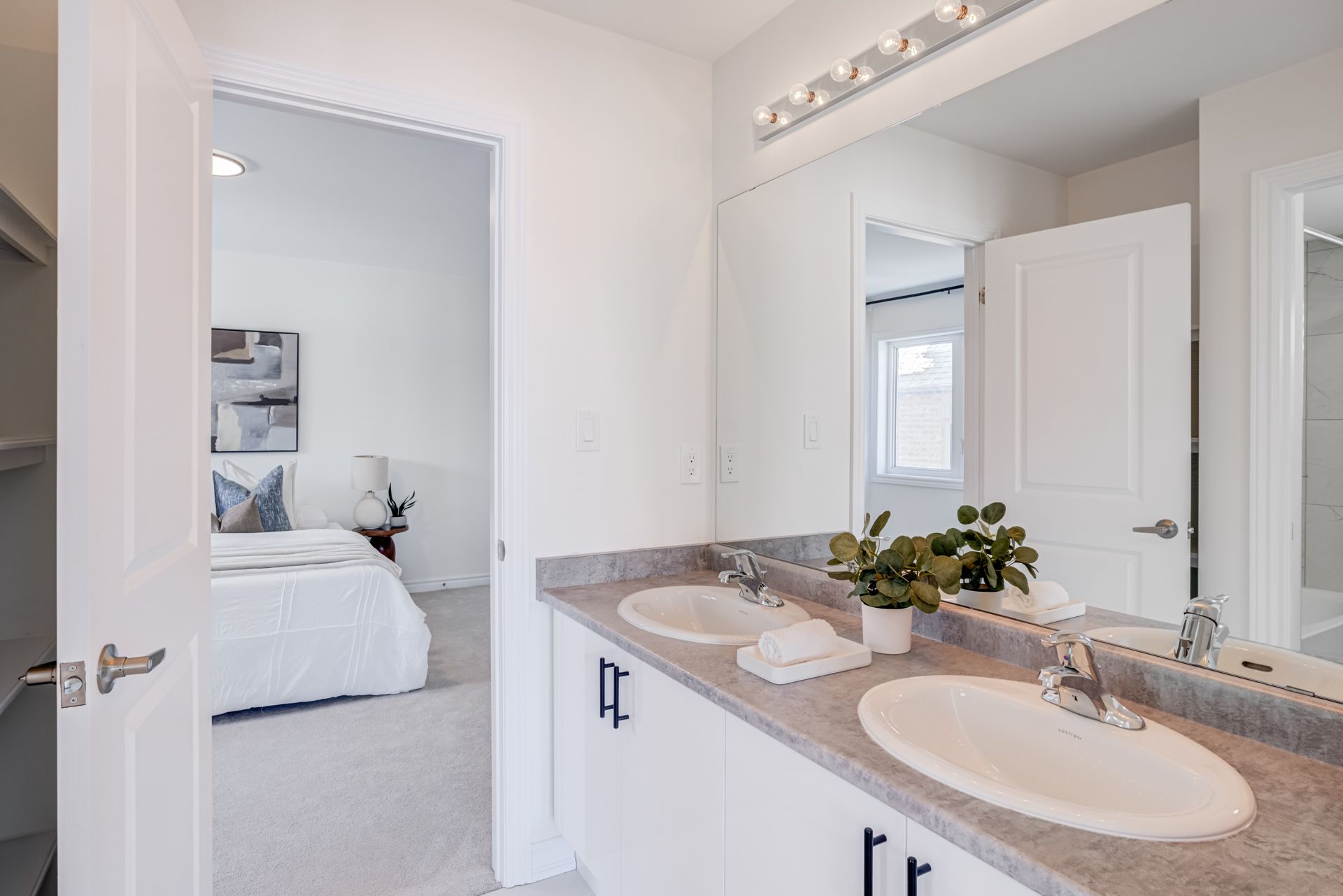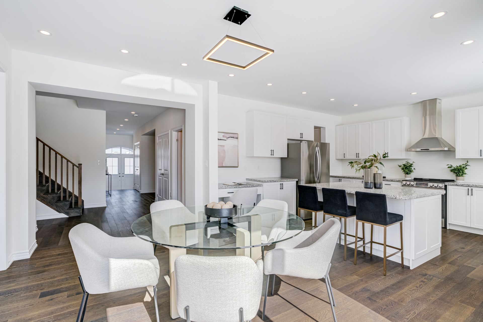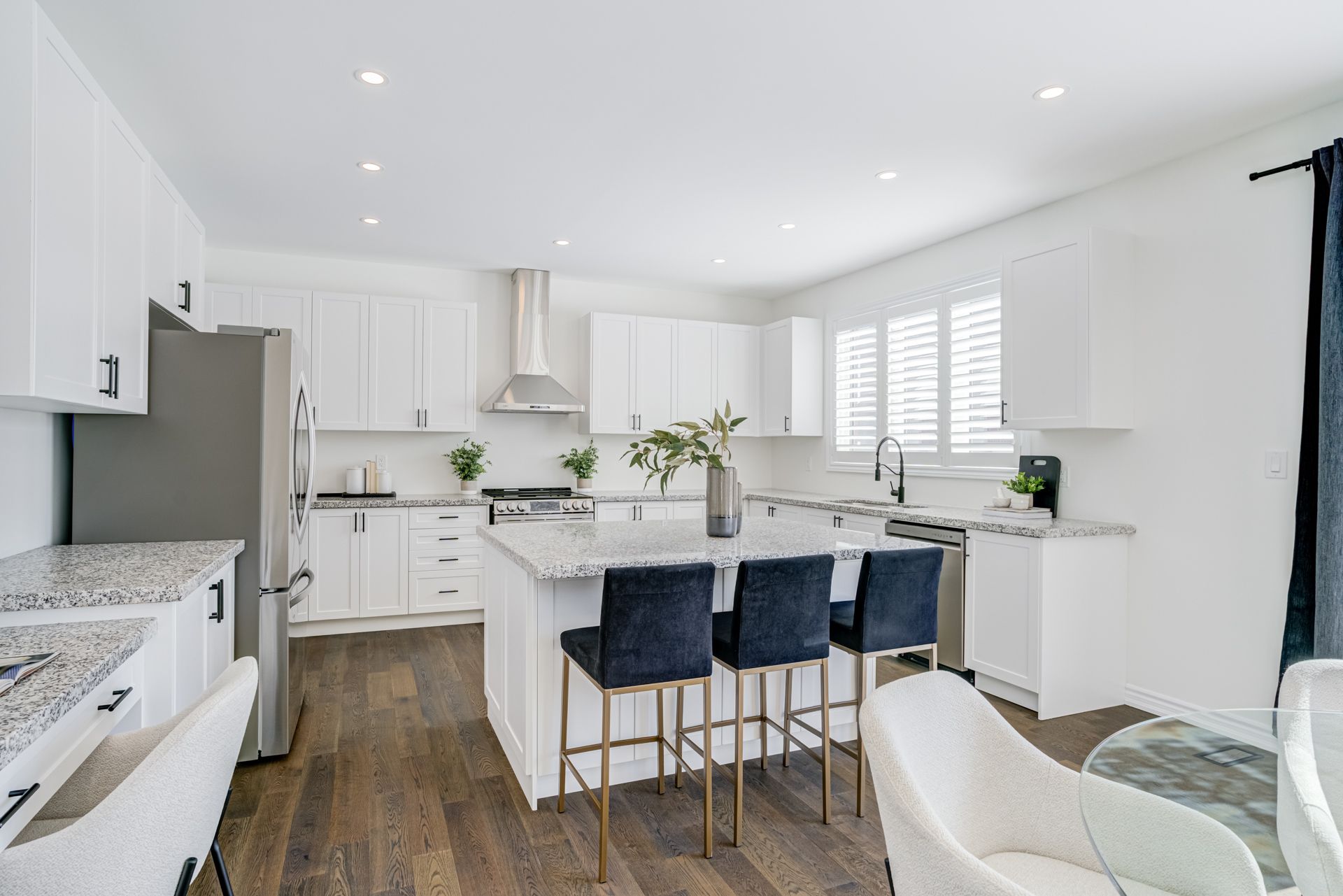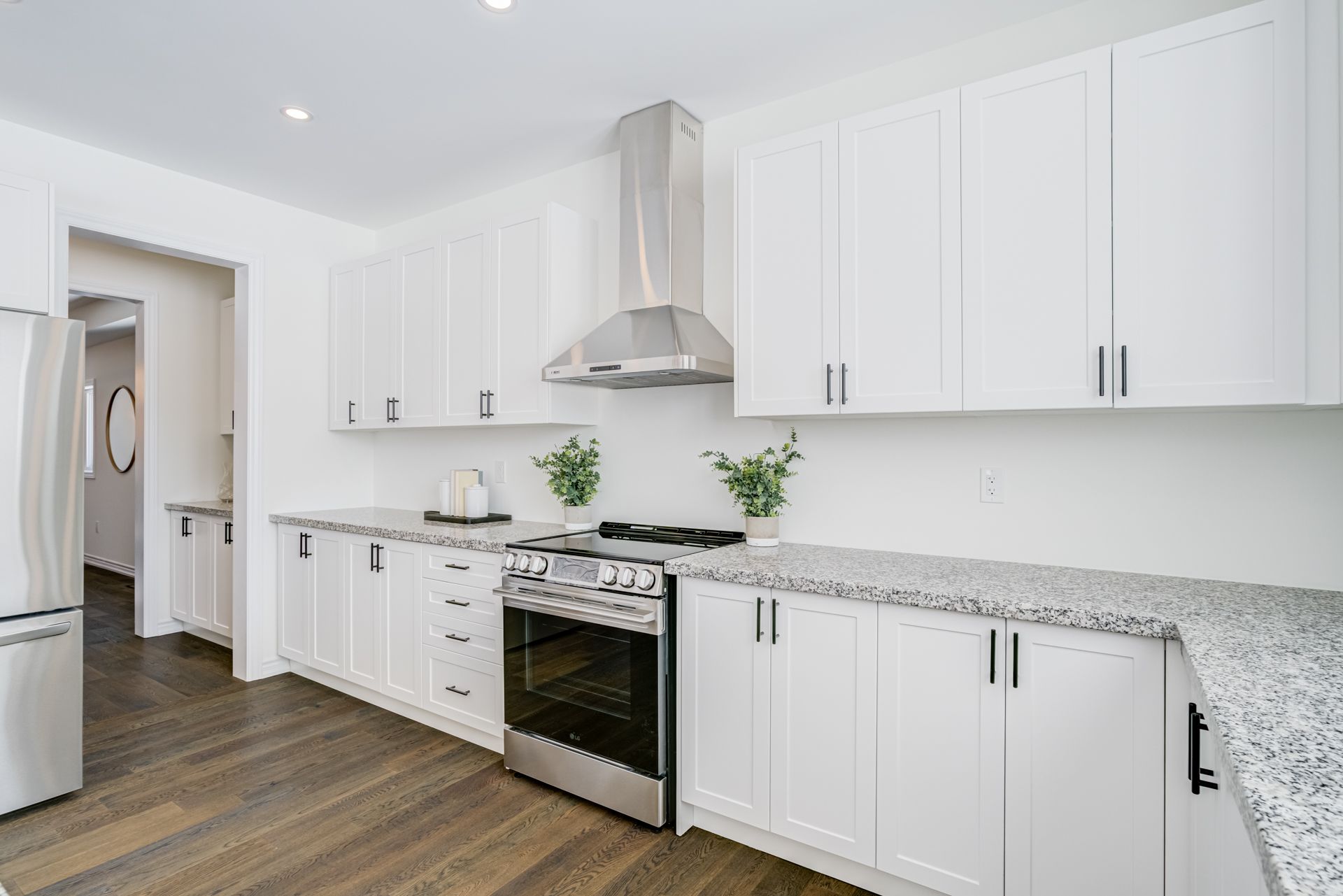 • Modern kitchen features quartz counters and stainless steel appliances.