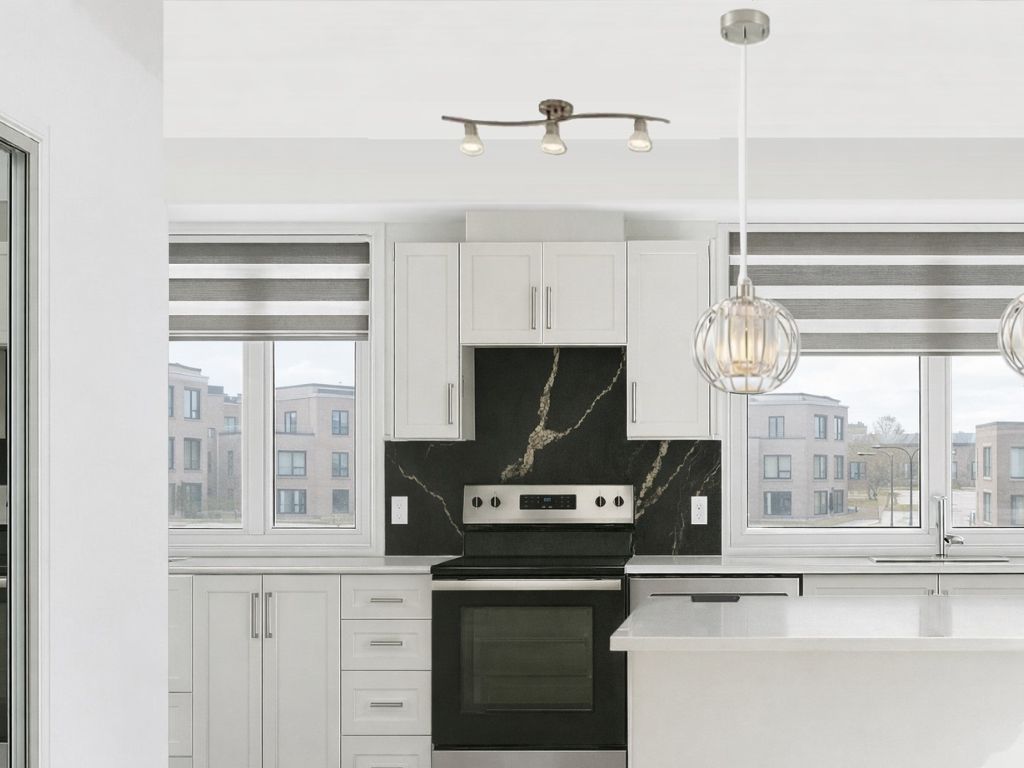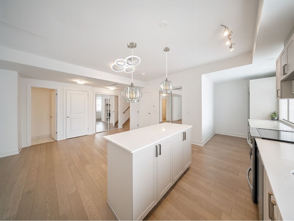 • Modern kitchen with upgraded appliances, quartz countertops, and large island.