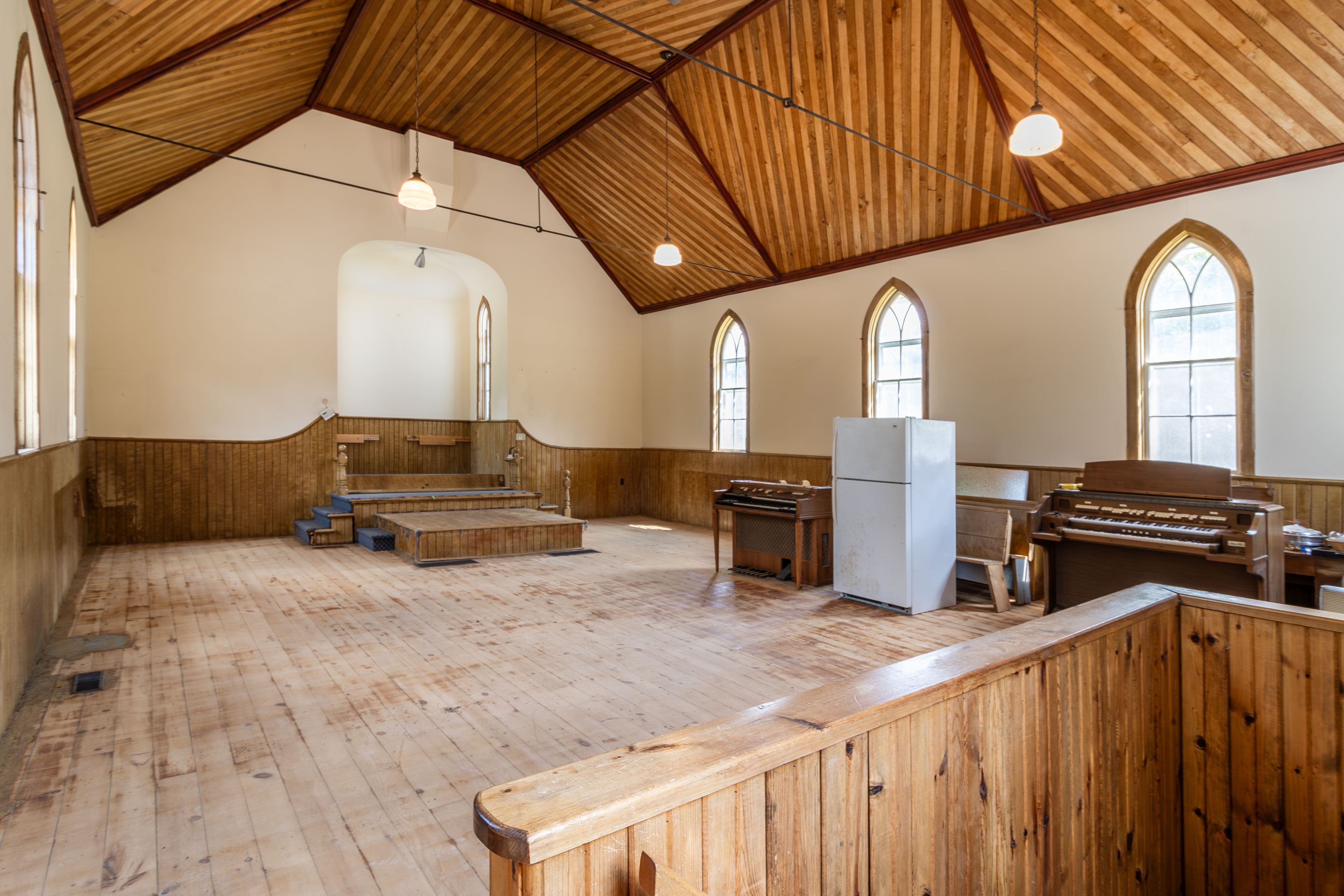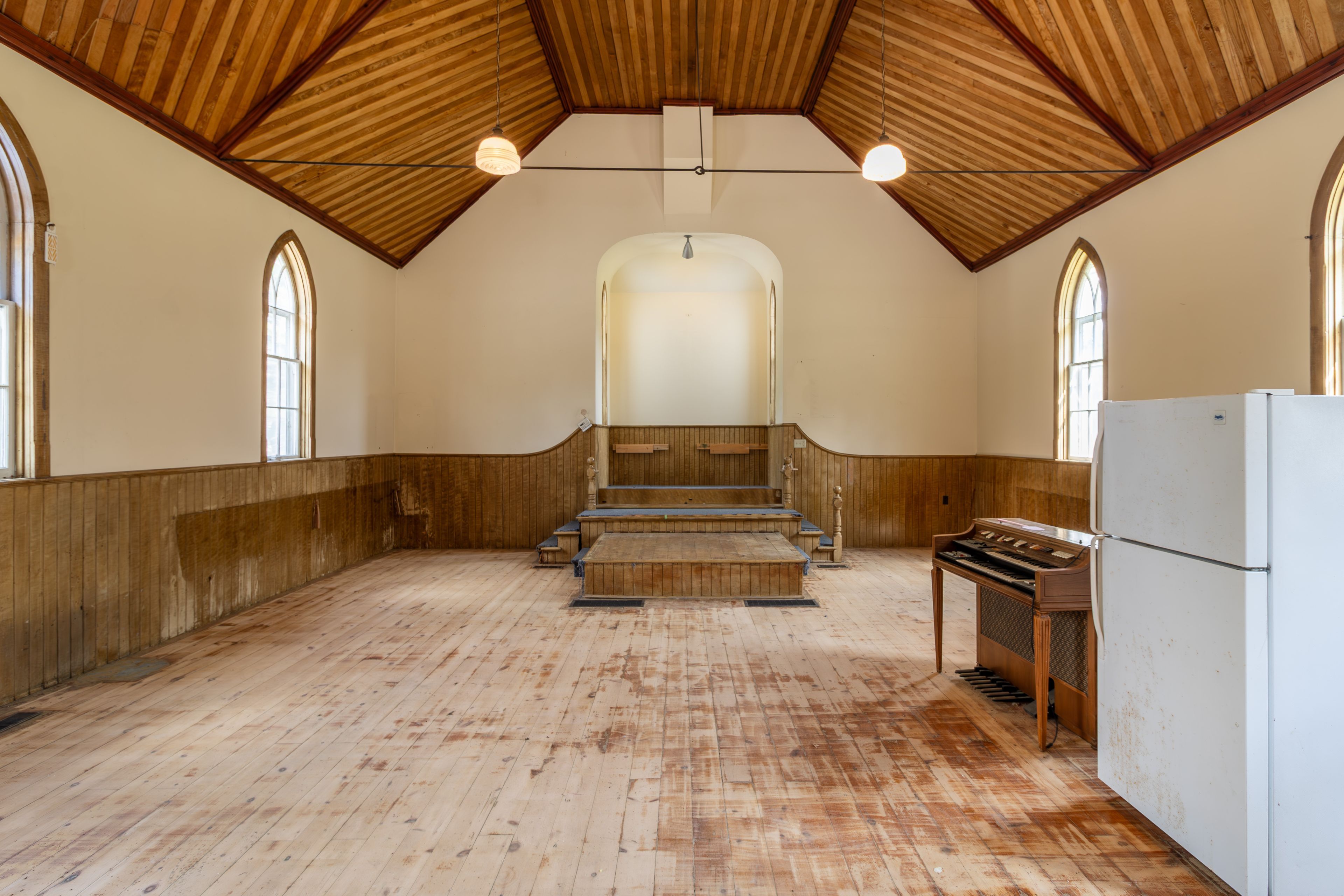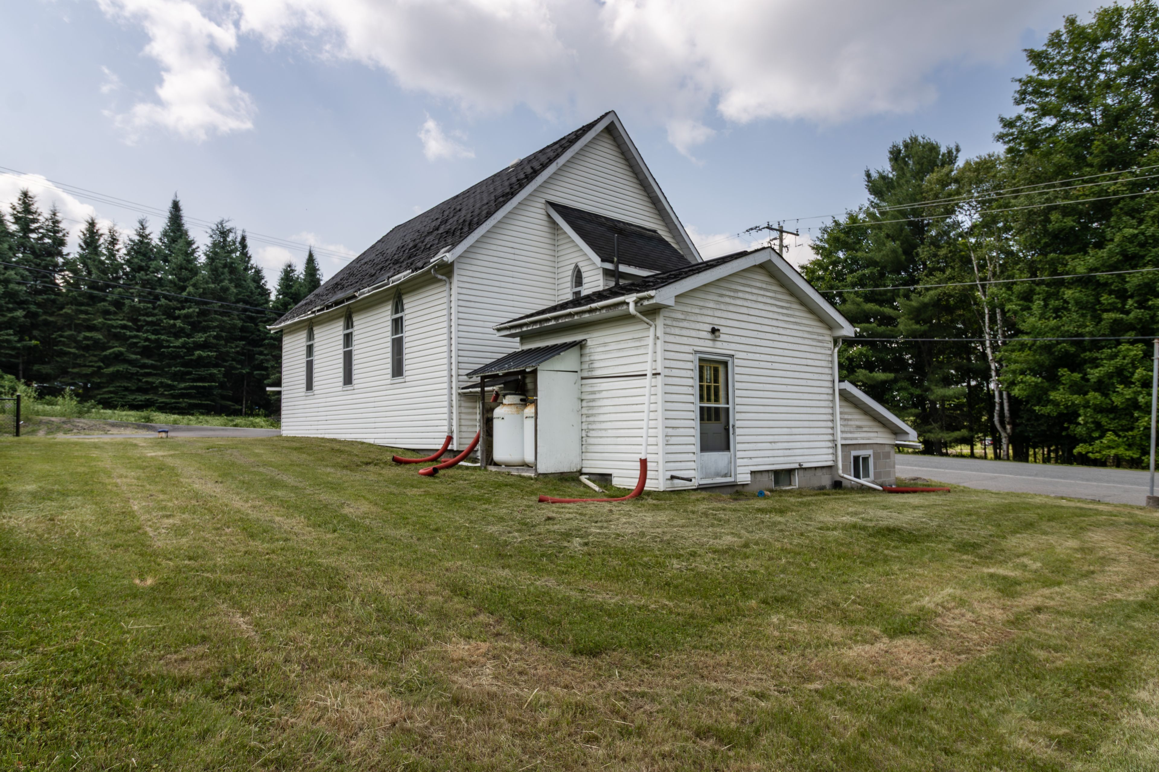 Discover the unique charm and endless possibilities of this former church, ideally located at the corner of highway 118 and stanhope airport road. This distinctive property has been thoughtfully rezoned for residential use and is ready for its next chapter. Step inside the open-concept main level where you're welcomed by a bright entryway or mudroom that leads into the stunning former chapel. This space is filled with character, featuring soaring cathedral-style wood ceilings and breathtaking stained glass details in the arched windows, a beautiful nod to the buildings historic roots. The lower level offers high ceilings and remains unfinished, providing a blank canvas for additional living space, studio, or storage. A wide staircase at the rear of the building, once home to the original church washrooms, leads to a back entrance and a fenced yard. Set on a flat and manageable lot, the property includes a newer propane furnace, a drilled well, and a holding tank. Conveniently located between haliburton and minden, and just minutes from west guilford, you'll enjoy easy access to amenities while enjoying a quiet and unique setting. Bring your vision and transform this one-of-a-kind space into your dream home, or creative retreat.