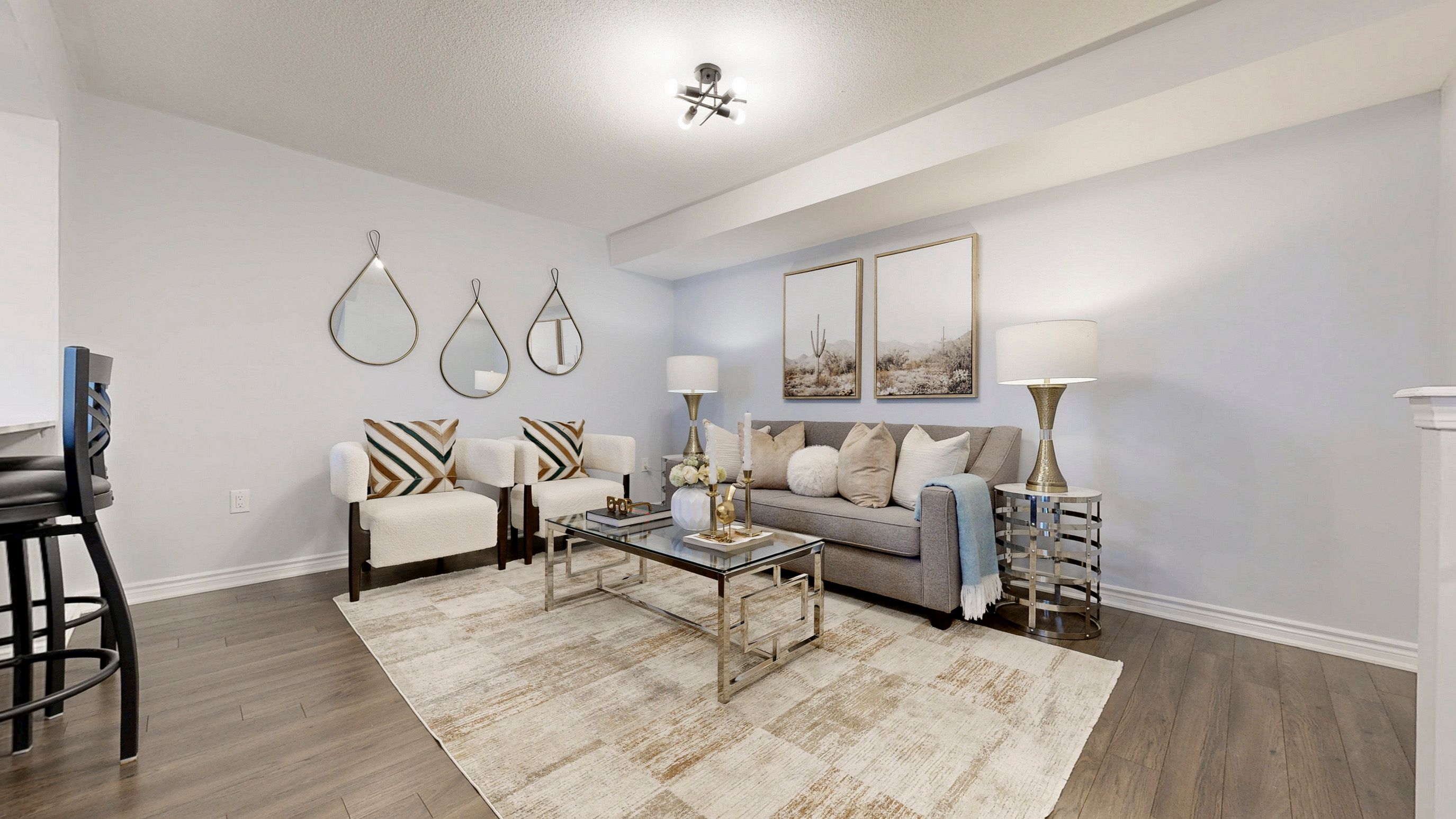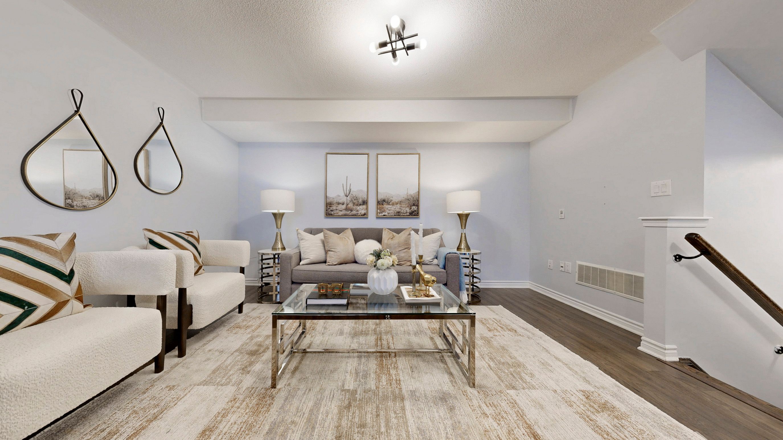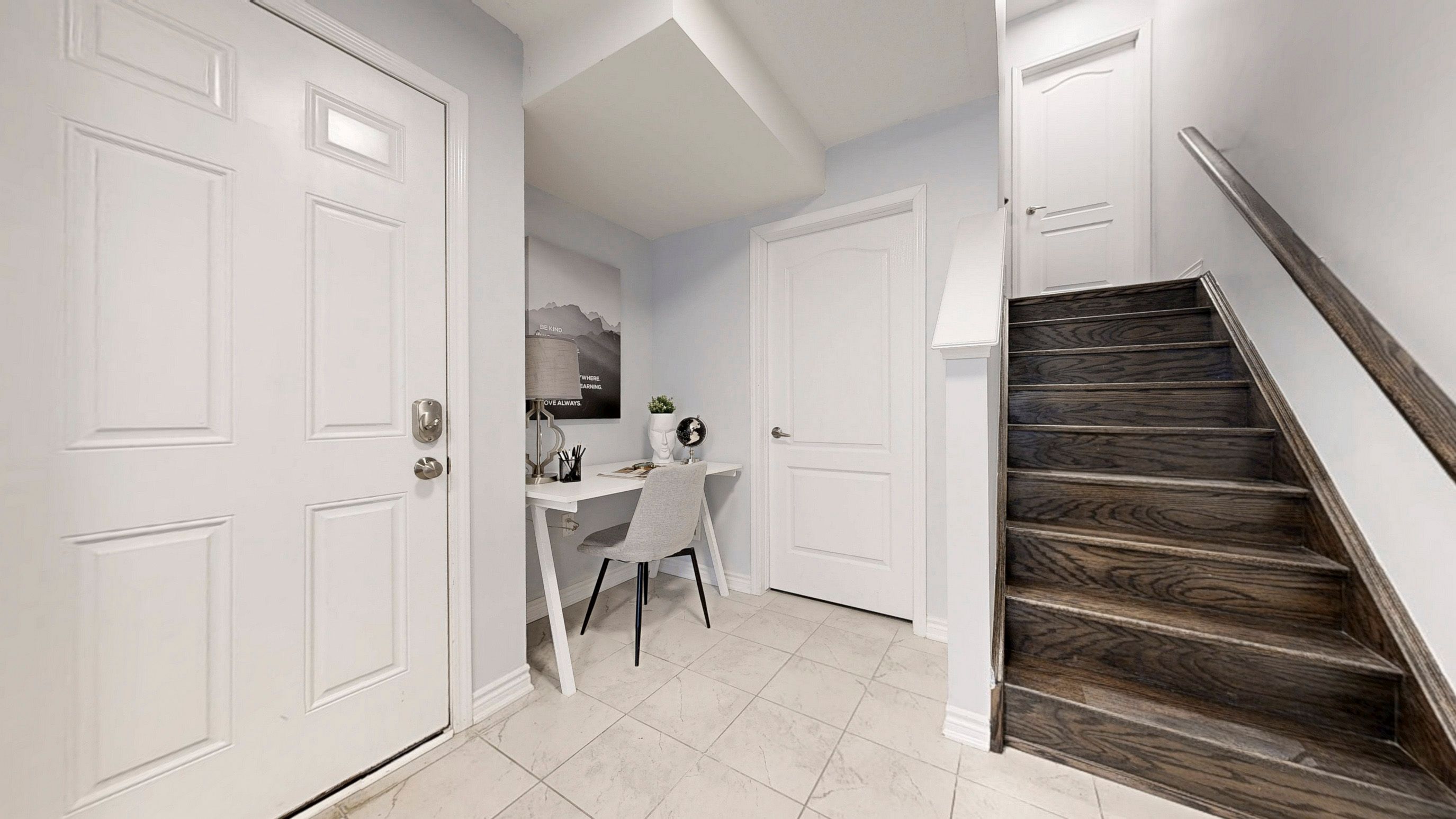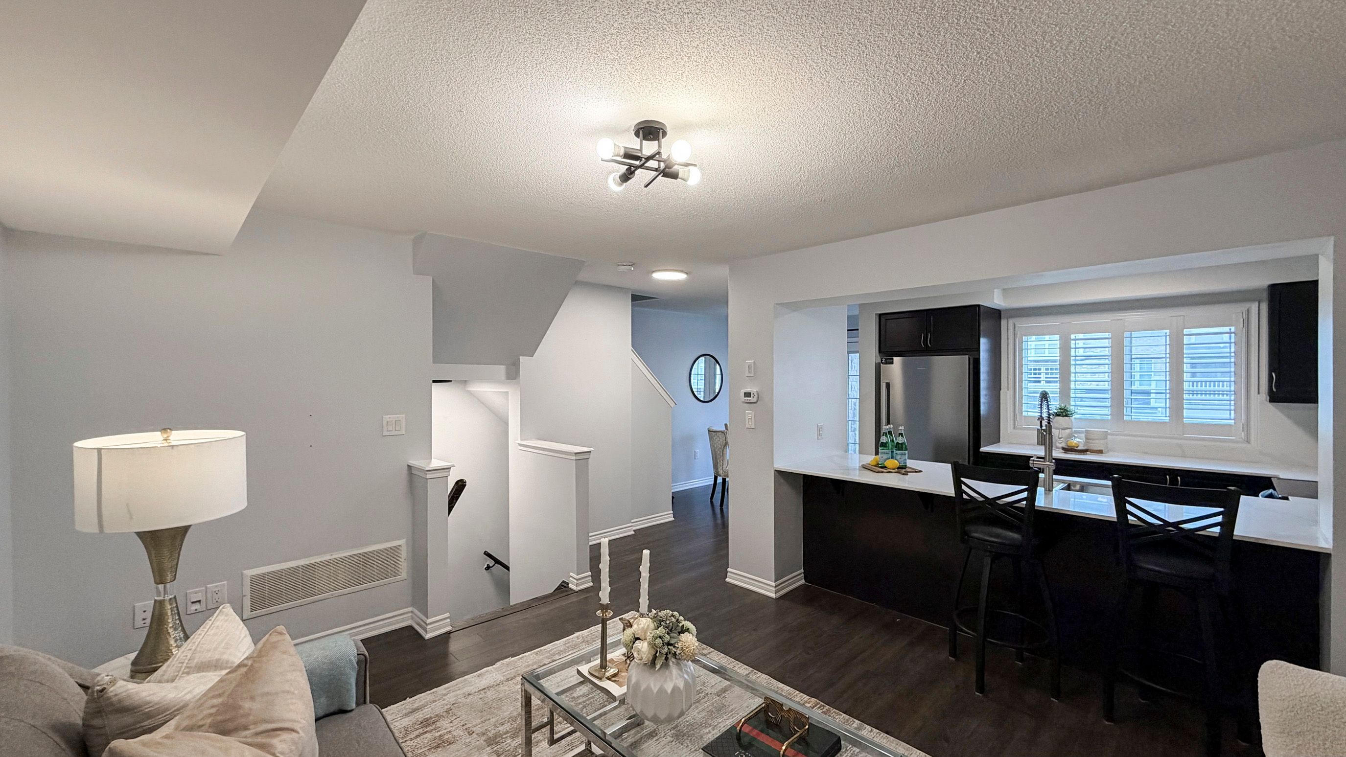 • Bright open concept main level featuring a modern kitchen with quartz countertops.