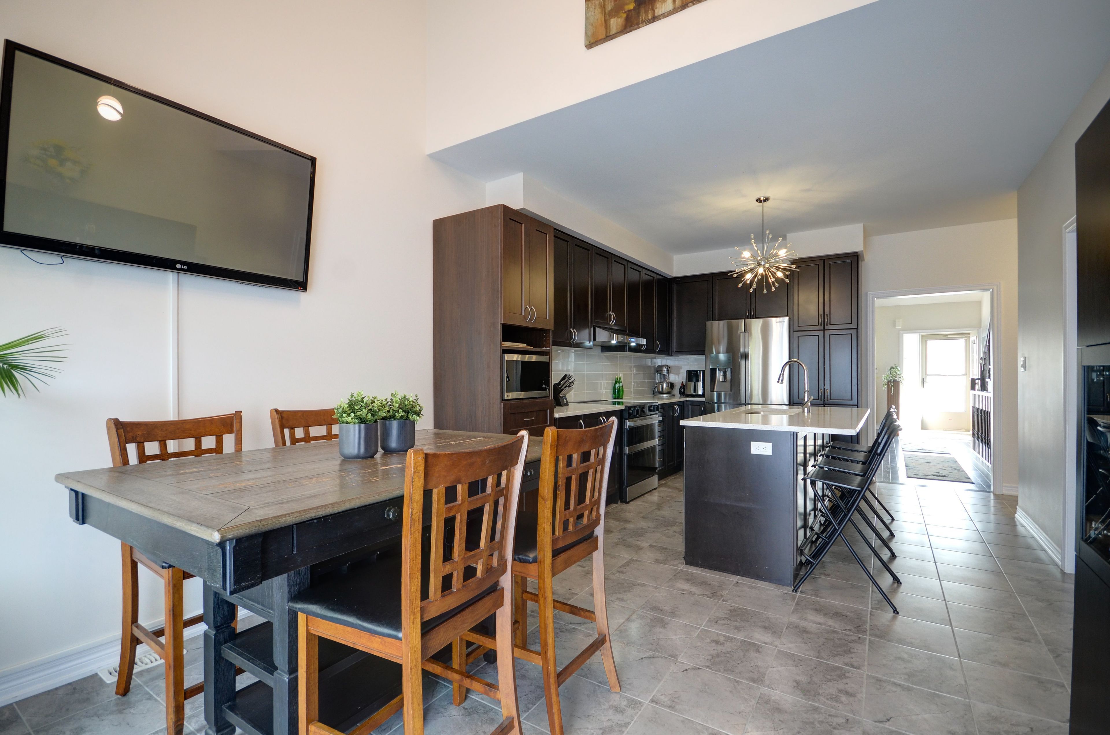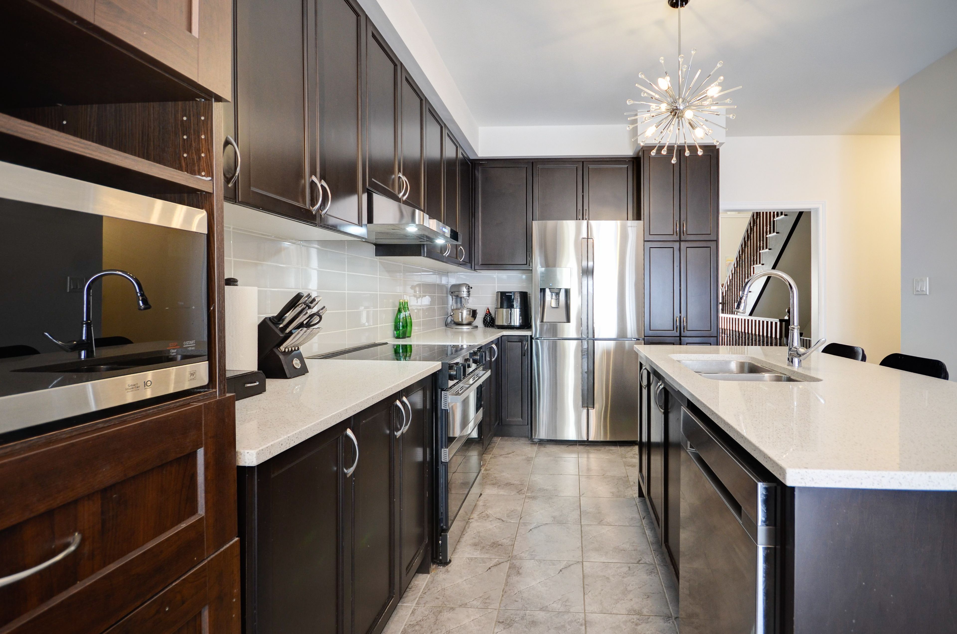 • Modern kitchen featuring granite countertops and stainless steel appliances.