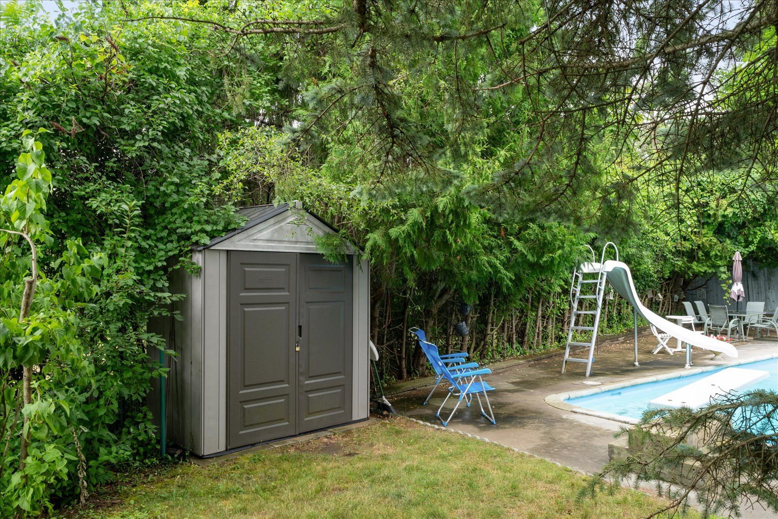 • Backyard oasis with a concrete inground pool and mature trees for privacy.