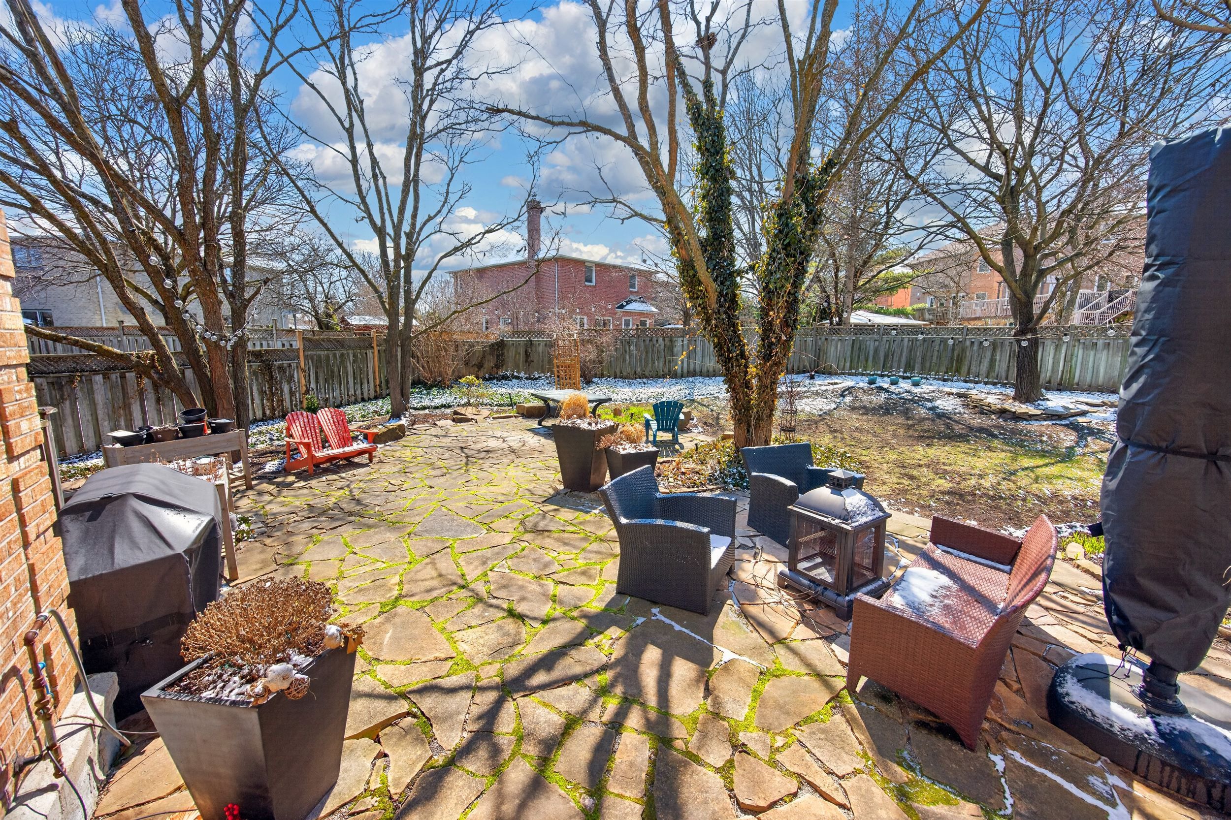 • Large backyard with stone patio for summer gatherings and relaxation.